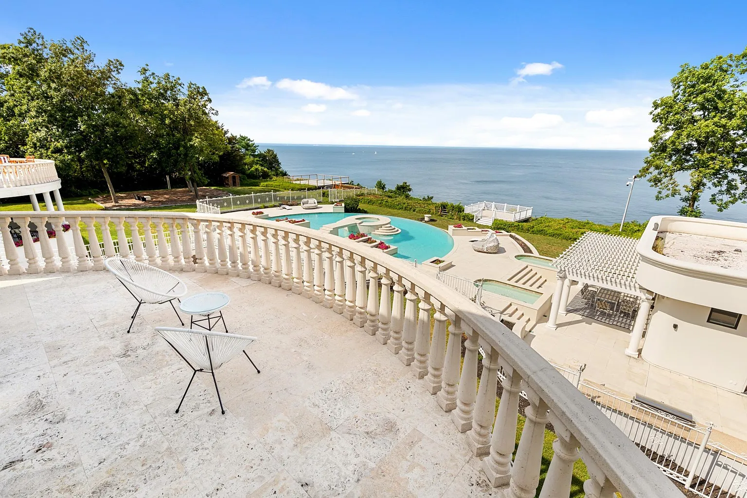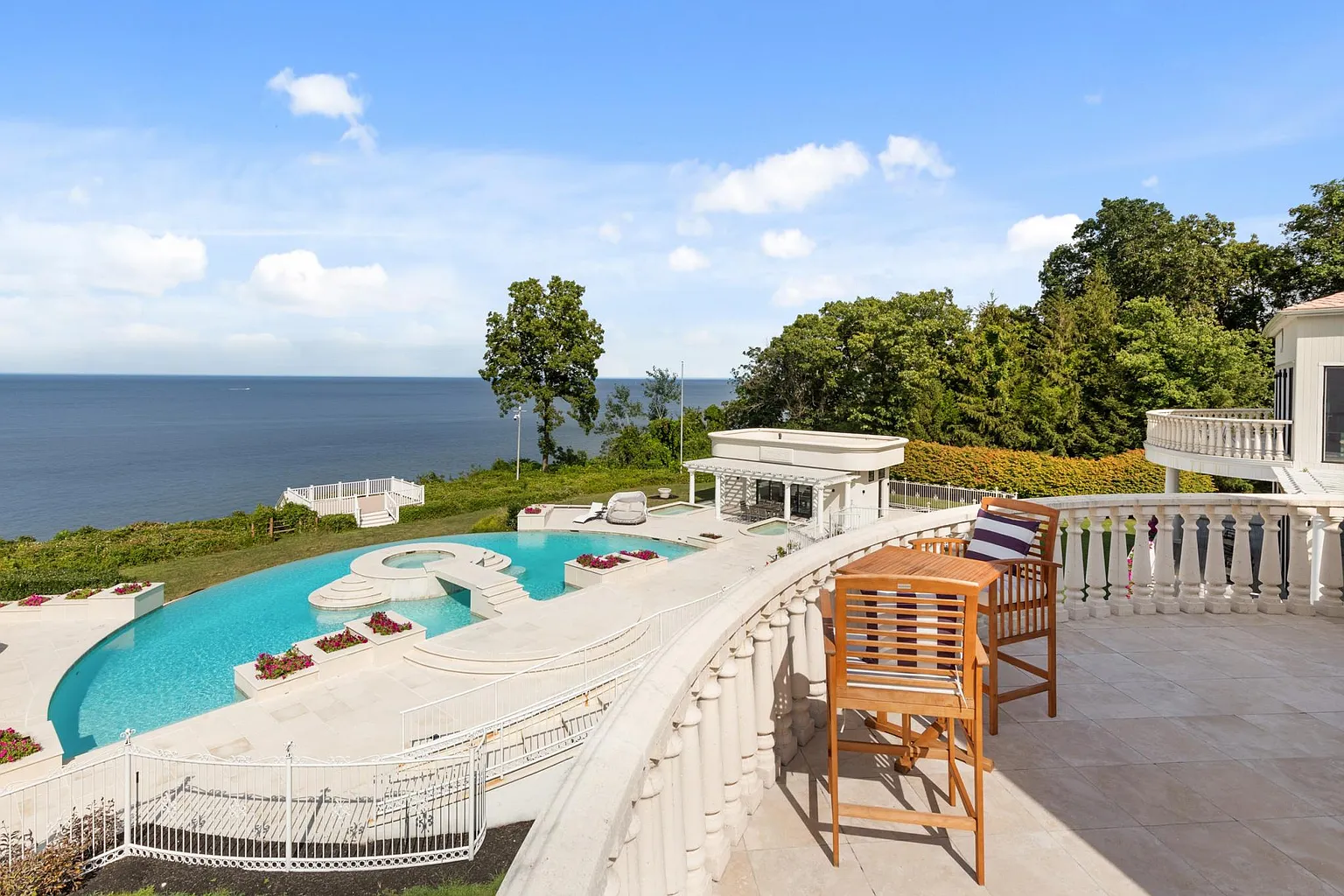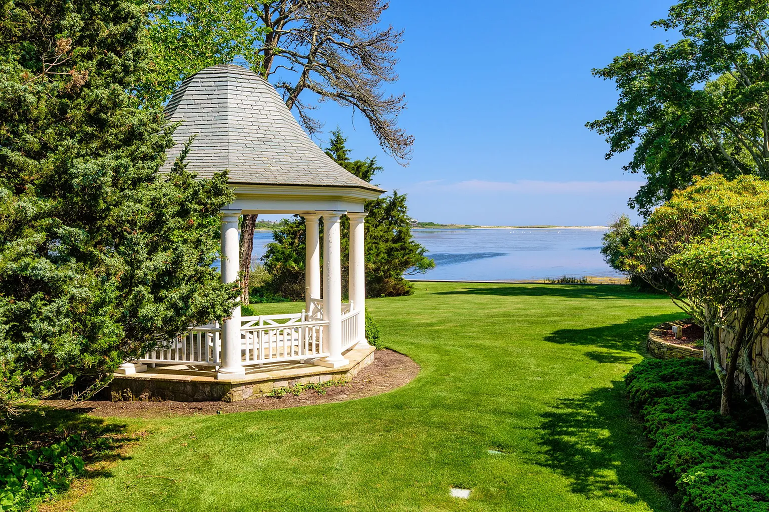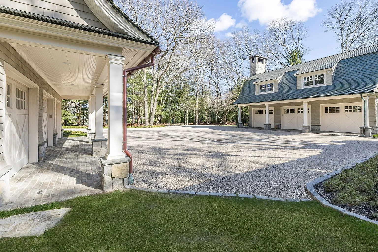 As you approach the estate via a long, gated driveway, you are welcomed by a grand entrance and an elegant porte cochère. The interiors, thoughtfully curated by Brian O’Keefe and designer Marjorie Shushan, reflect timeless sophistication, enhanced by a recent redesign by Michael Smith. Highlights include 200-year-old antique oak flooring, six stone fireplaces, and unique arched doorways, ensuring that no two rooms are alike. Nearly every space is adorned with sweeping water views. The estate comprises a five-bedroom main residence and a fully equipped three-bedroom guest wing, linked by a charming Cotswold stone breezeway, making it an ideal setting for both relaxation and entertaining.