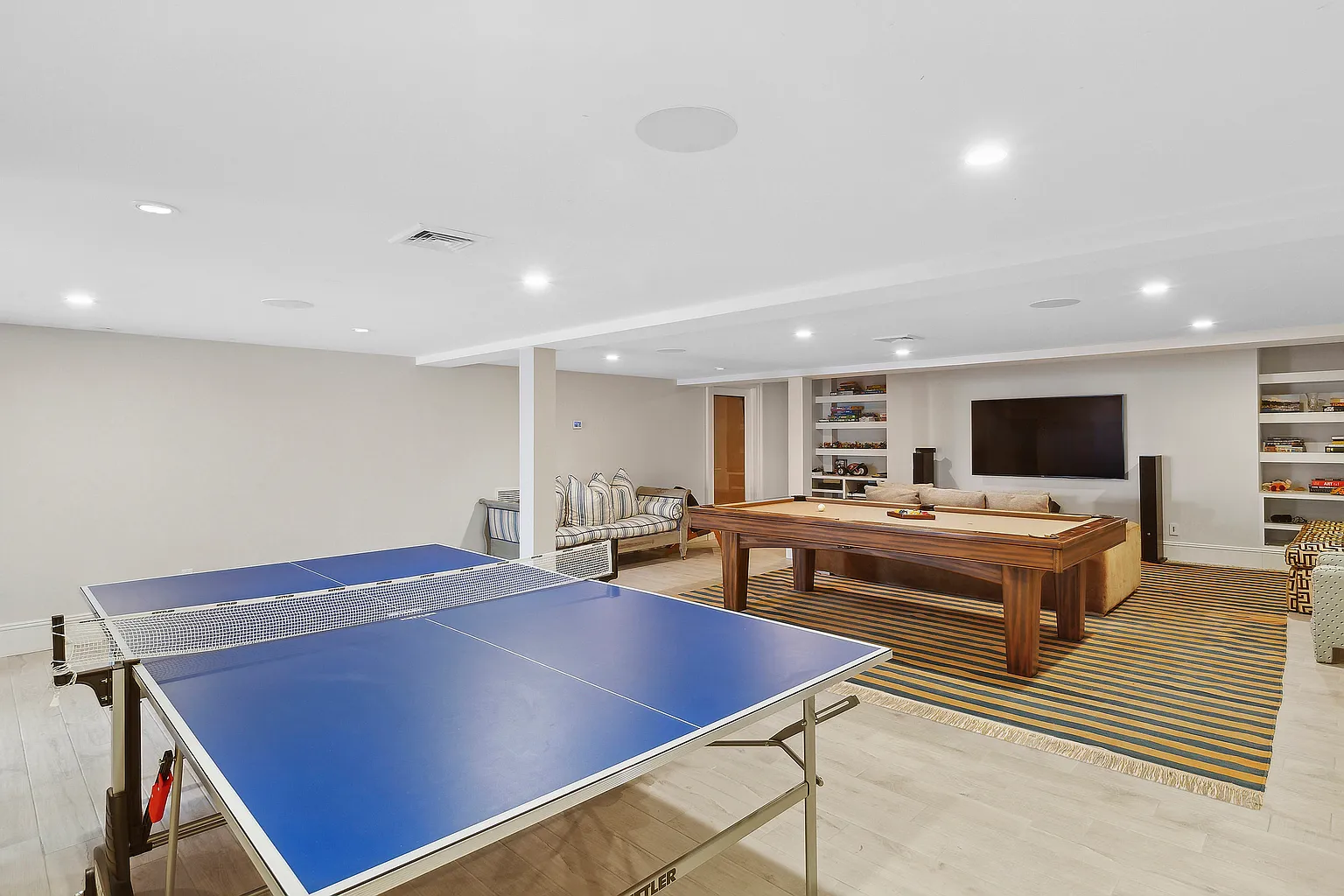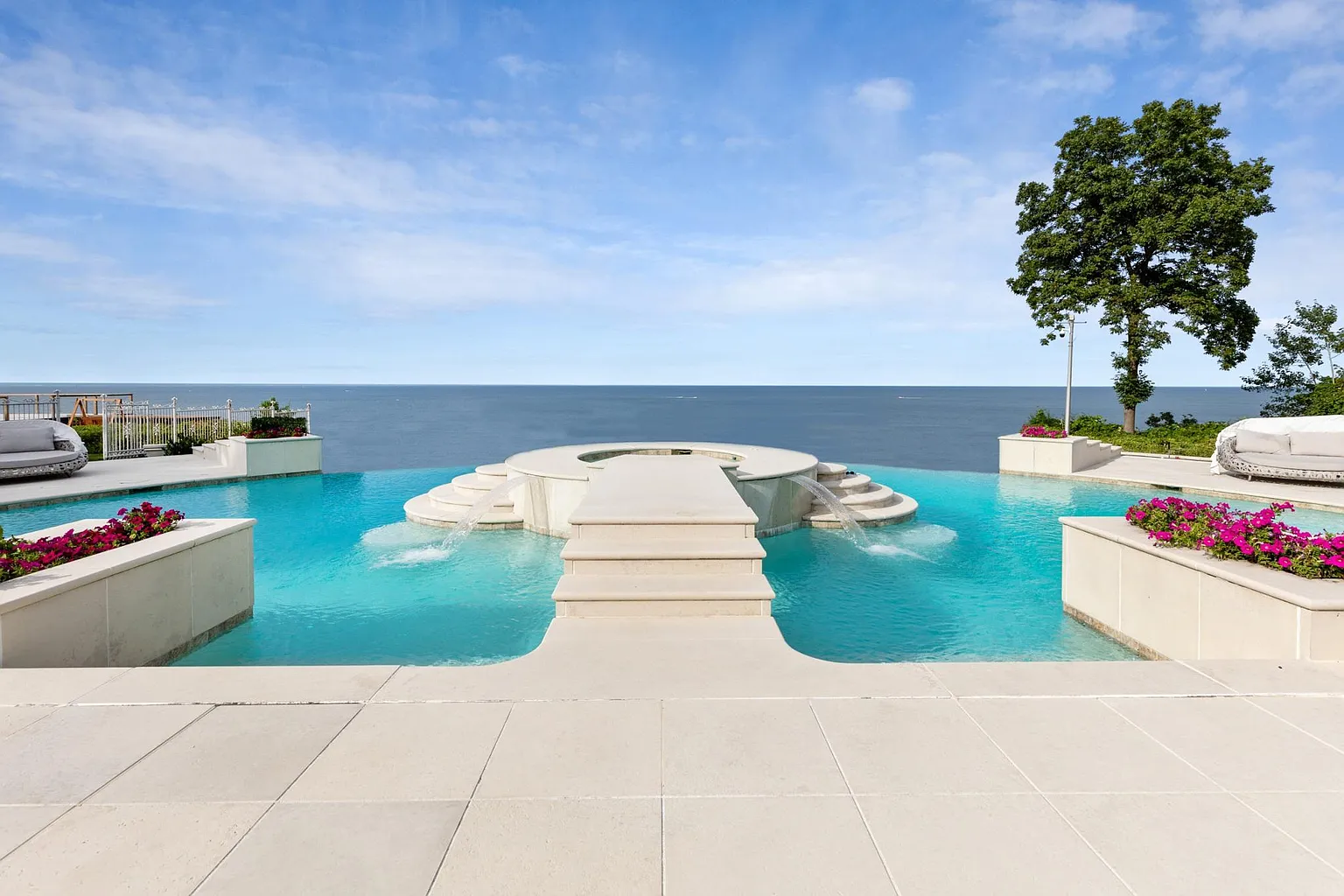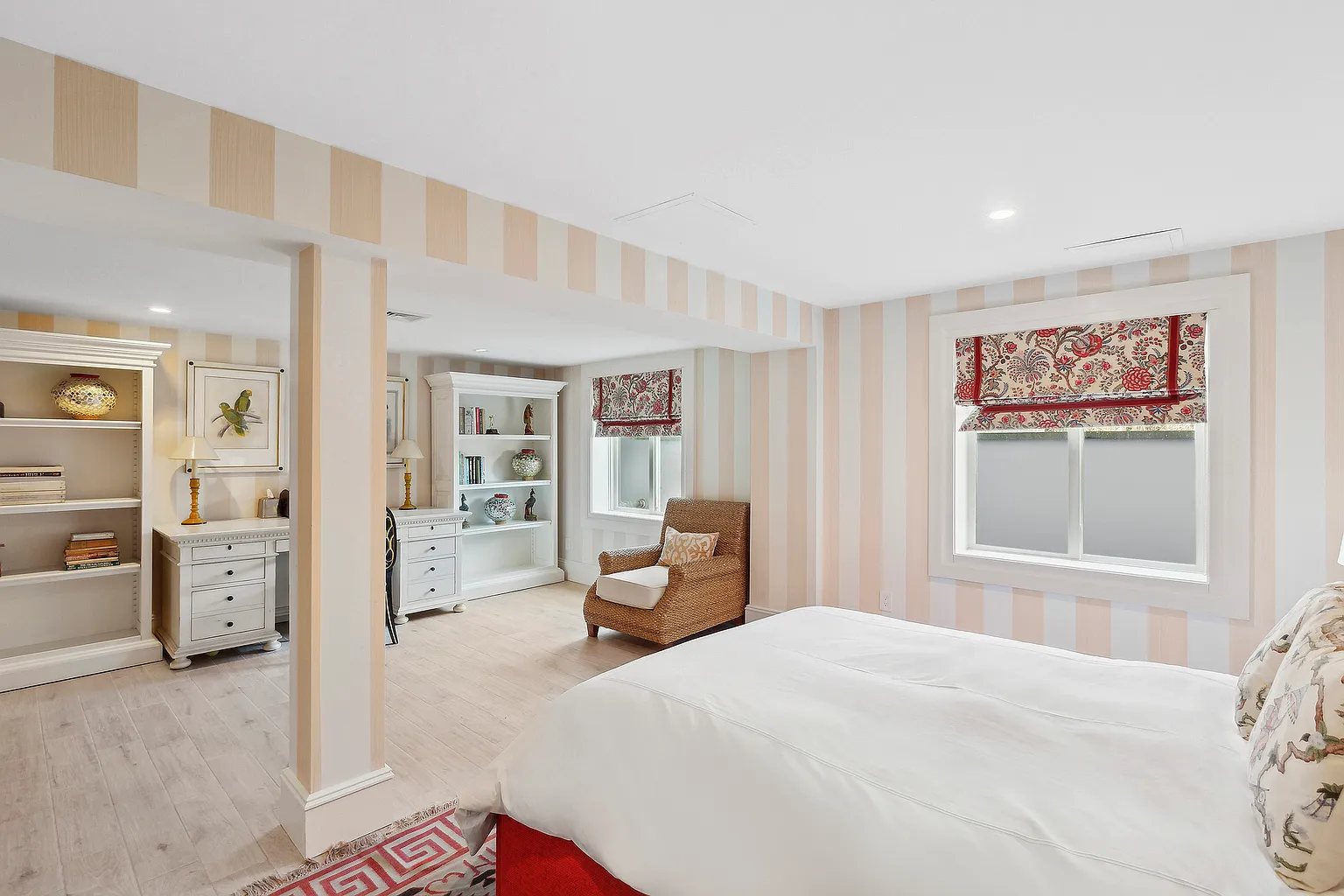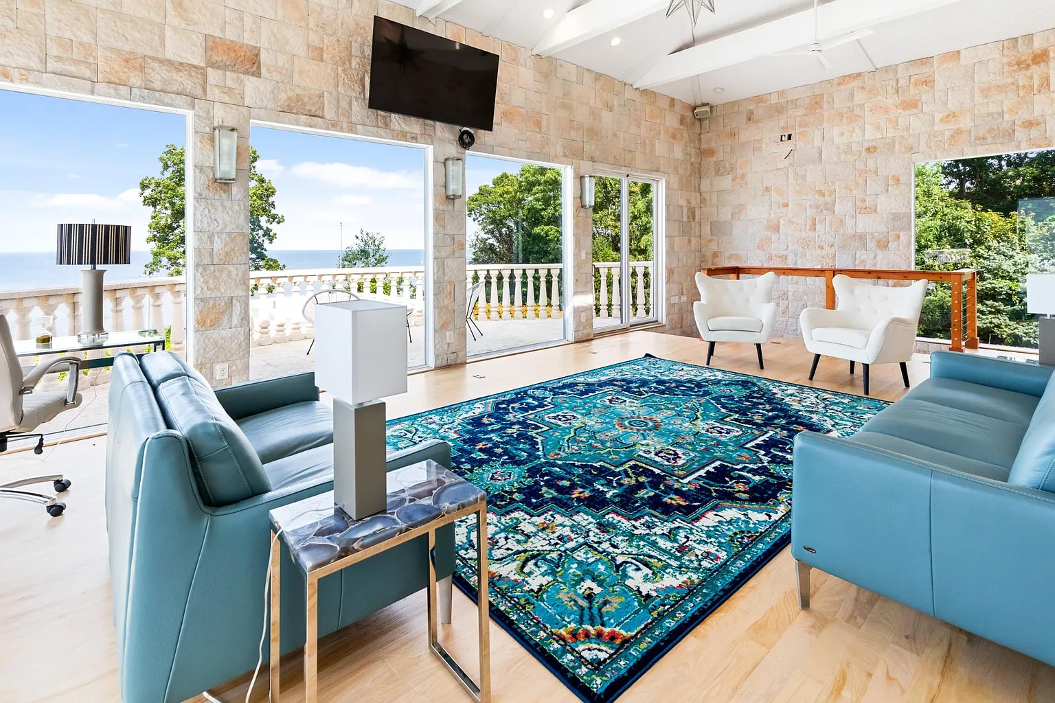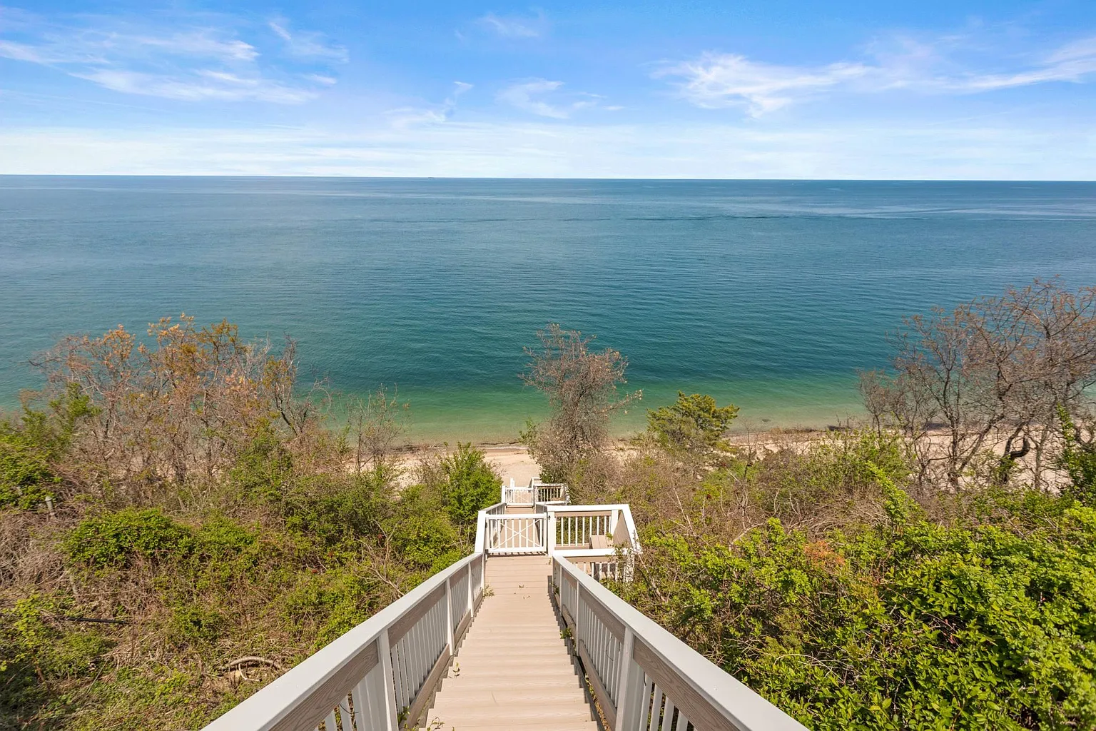 As you approach the estate via a long, gated driveway, you are welcomed by a grand entrance and an elegant porte cochère. The interiors, thoughtfully curated by Brian O’Keefe and designer Marjorie Shushan, reflect timeless sophistication, enhanced by a recent redesign by Michael Smith. Highlights include 200-year-old antique oak flooring, six stone fireplaces, and unique arched doorways, ensuring that no two rooms are alike. Nearly every space is adorned with sweeping water views. The estate comprises a five-bedroom main residence and a fully equipped three-bedroom guest wing, linked by a charming Cotswold stone breezeway, making it an ideal setting for both relaxation and entertaining.