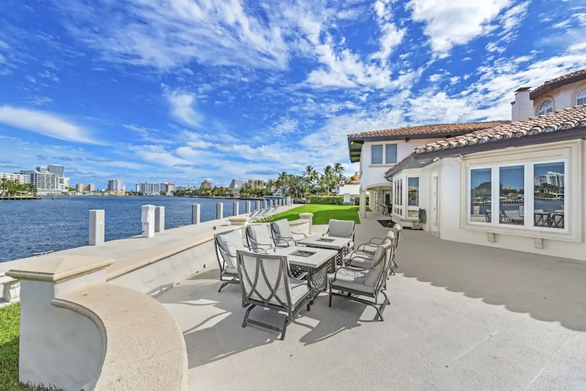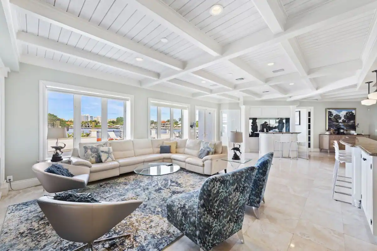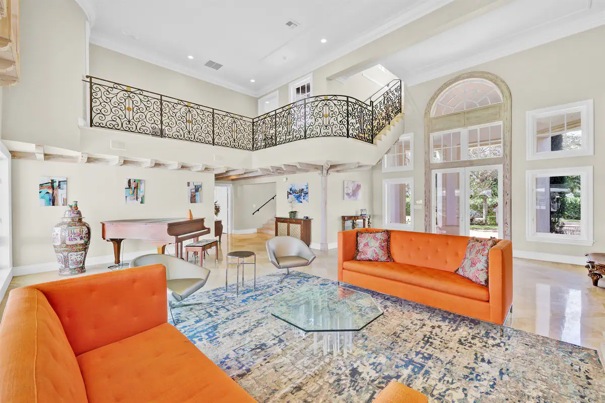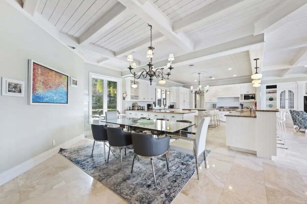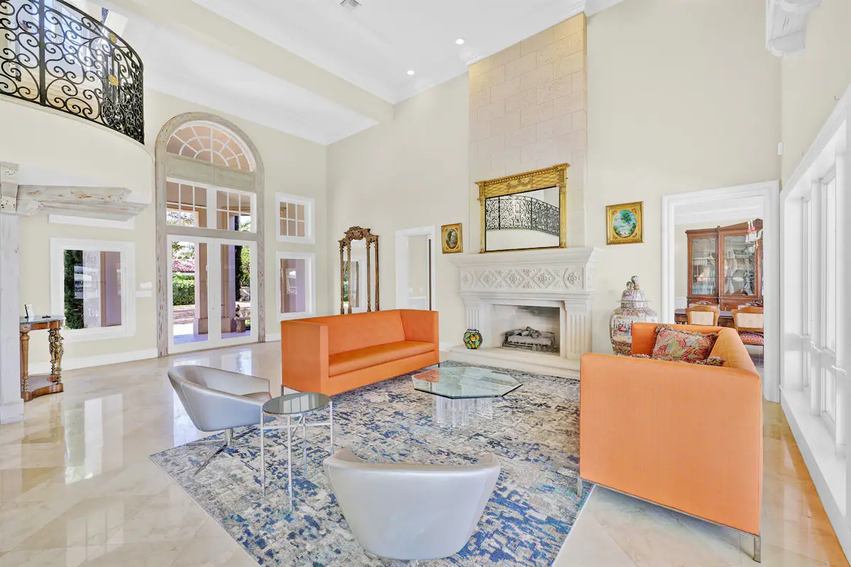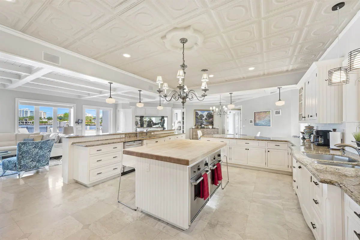 As you approach the estate via a long, gated driveway, you are welcomed by a grand entrance and an elegant porte cochère. The interiors, thoughtfully curated by Brian O’Keefe and designer Marjorie Shushan, reflect timeless sophistication, enhanced by a recent redesign by Michael Smith. Highlights include 200-year-old antique oak flooring, six stone fireplaces, and unique arched doorways, ensuring that no two rooms are alike. Nearly every space is adorned with sweeping water views. The estate comprises a five-bedroom main residence and a fully equipped three-bedroom guest wing, linked by a charming Cotswold stone breezeway, making it an ideal setting for both relaxation and entertaining.