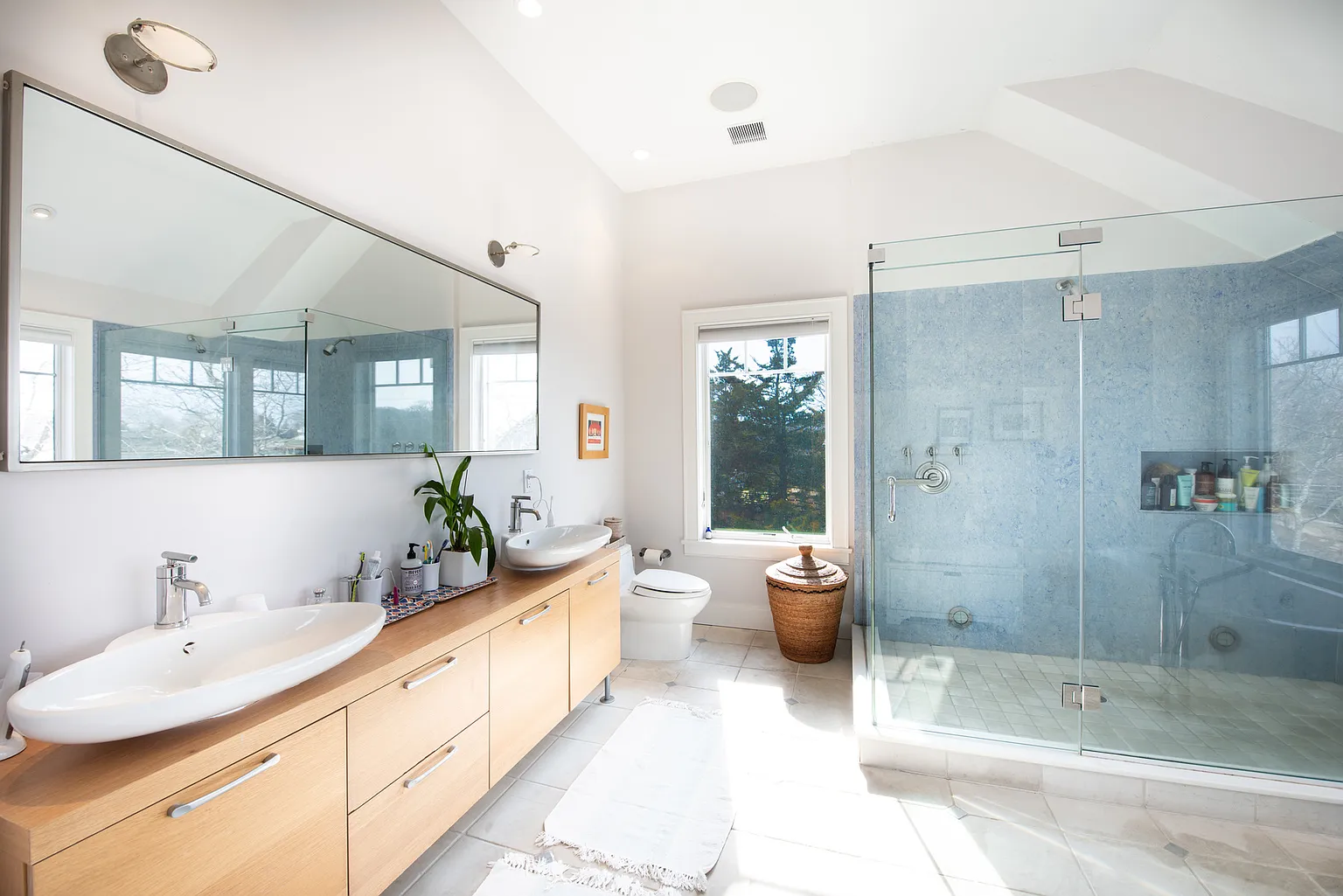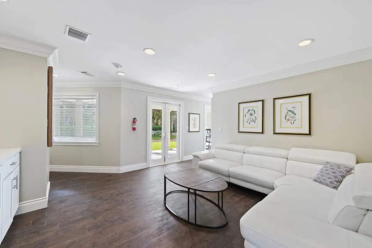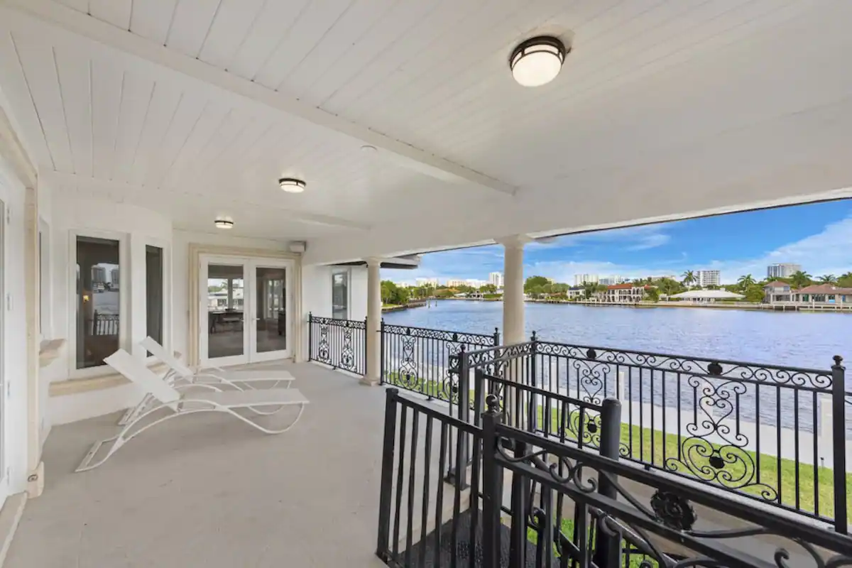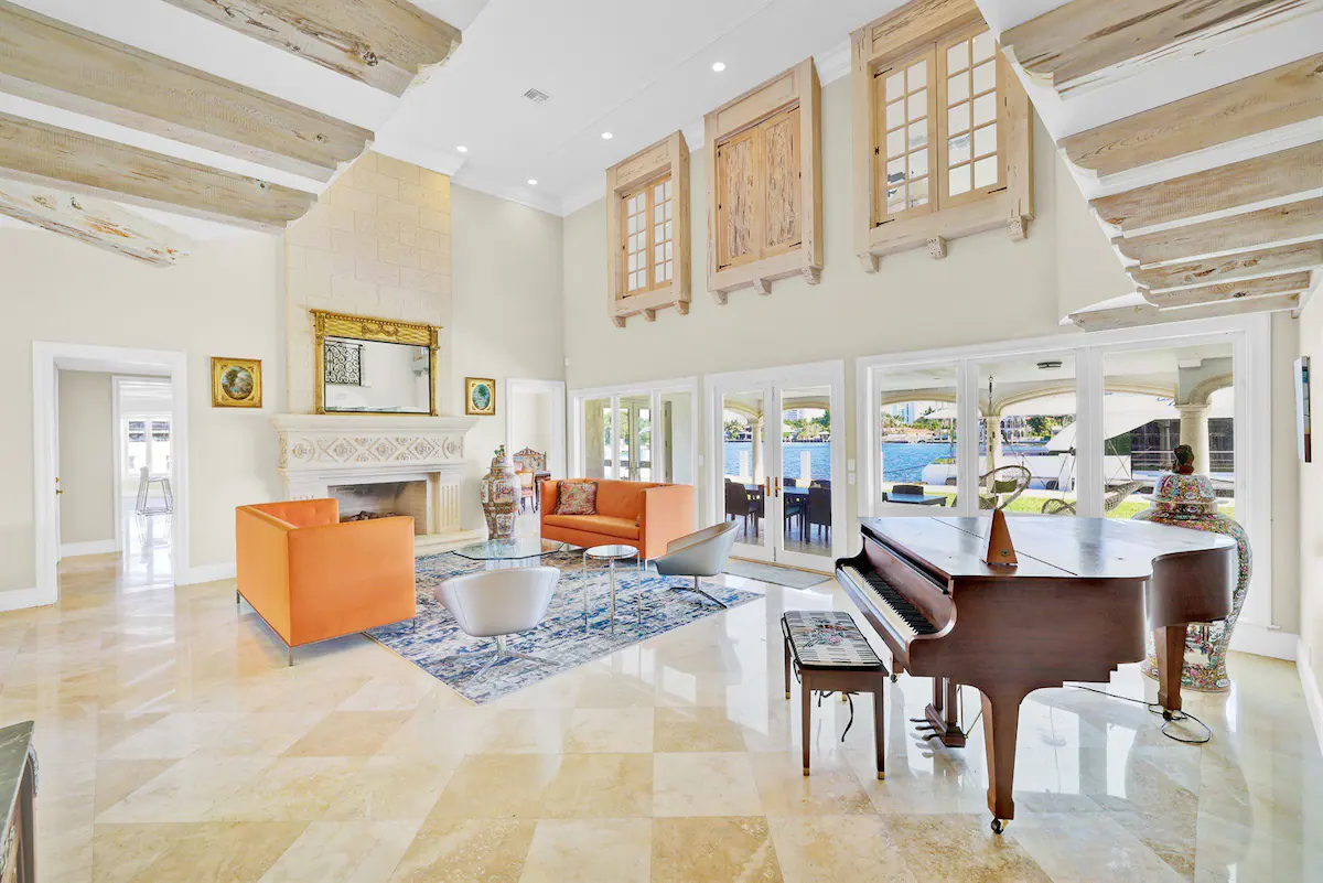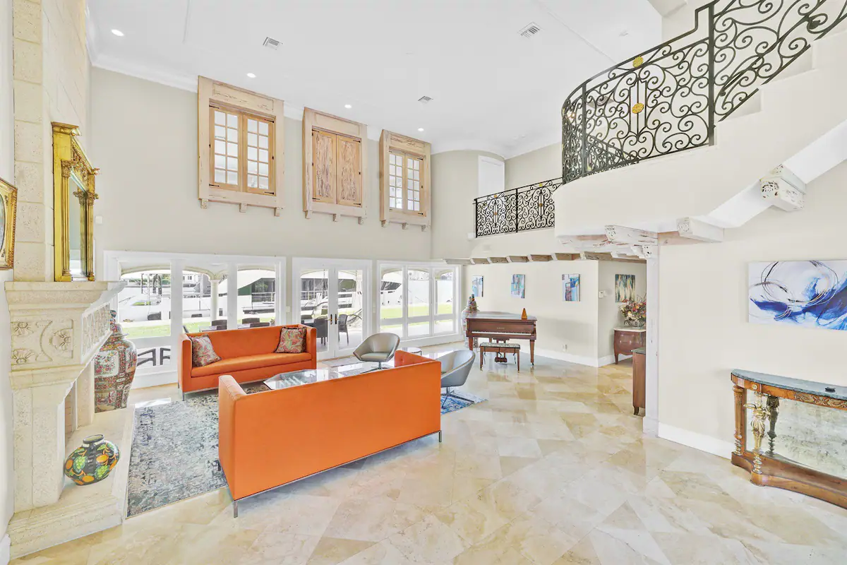 As you approach the estate via a long, gated driveway, you are welcomed by a grand entrance and an elegant porte cochère. The interiors, thoughtfully curated by Brian O’Keefe and designer Marjorie Shushan, reflect timeless sophistication, enhanced by a recent redesign by Michael Smith. Highlights include 200-year-old antique oak flooring, six stone fireplaces, and unique arched doorways, ensuring that no two rooms are alike. Nearly every space is adorned with sweeping water views. The estate comprises a five-bedroom main residence and a fully equipped three-bedroom guest wing, linked by a charming Cotswold stone breezeway, making it an ideal setting for both relaxation and entertaining.