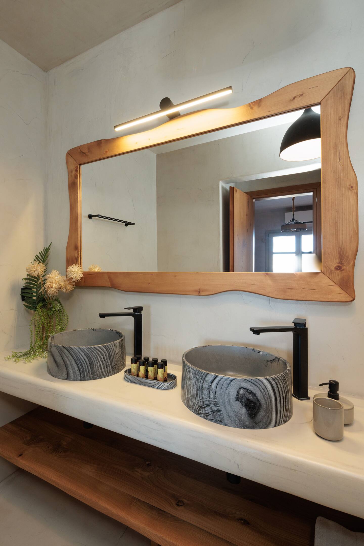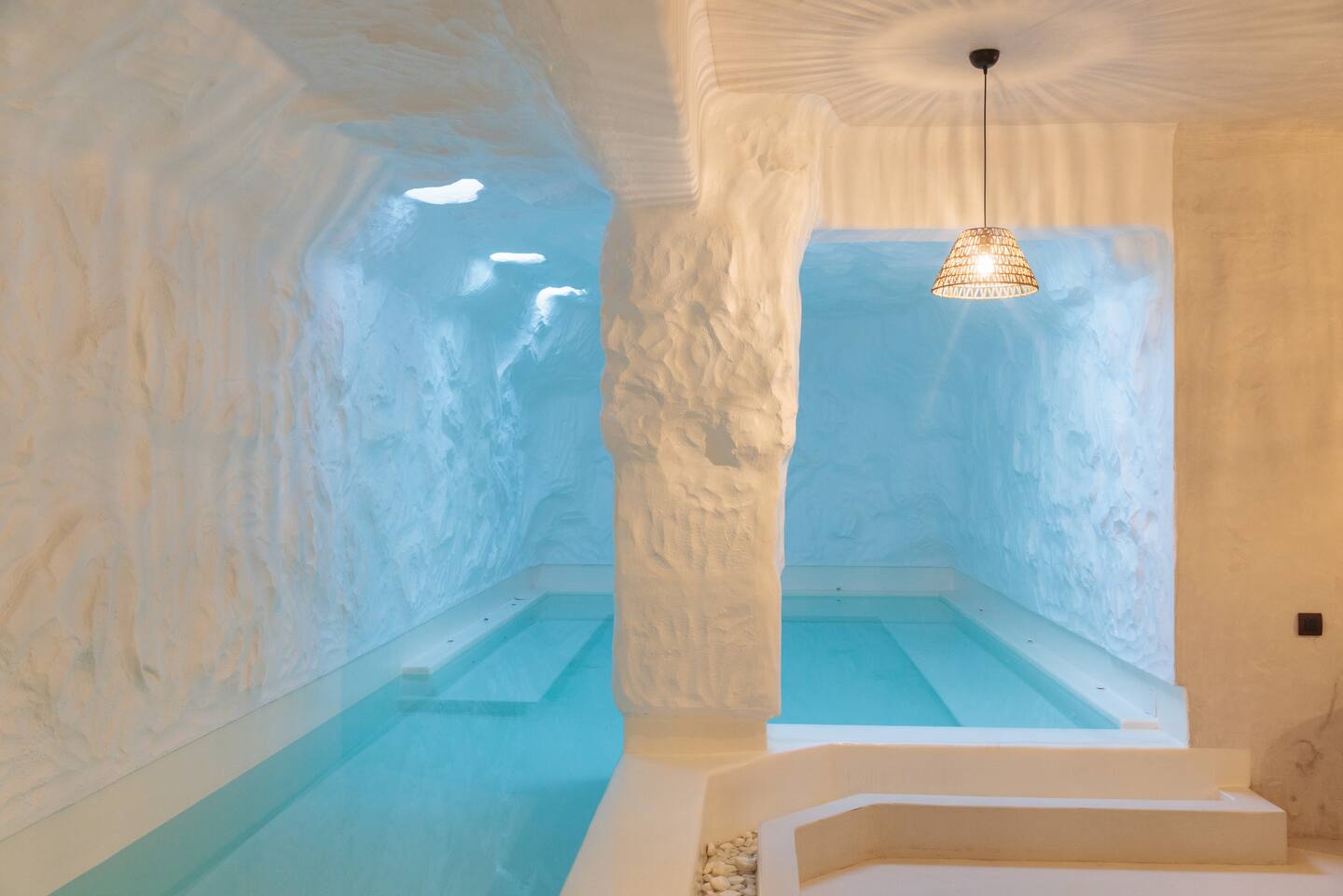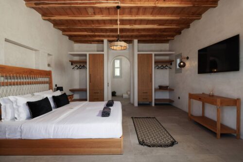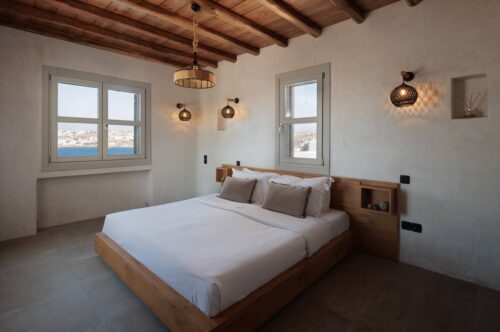 Nestled in the enchanting neighborhood of Kanalia, Villa Sapphire Black redefines luxury living in Mykonos. This architectural gem epitomizes Cycladic design, featuring striking whitewashed structures reminiscent of sugar cubes that are truly visually captivating. The villa’s pristine white exterior is elegantly complemented by natural stone accents, creating a seamless integration with the surrounding landscape. Upon entering, you are welcomed by breathtaking sea views that enhance the villa’s sophisticated indoor arches and vaulted ceilings. A unique indoor pool adds a serene touch, providing a peaceful retreat for guests to relax and rejuvenate.