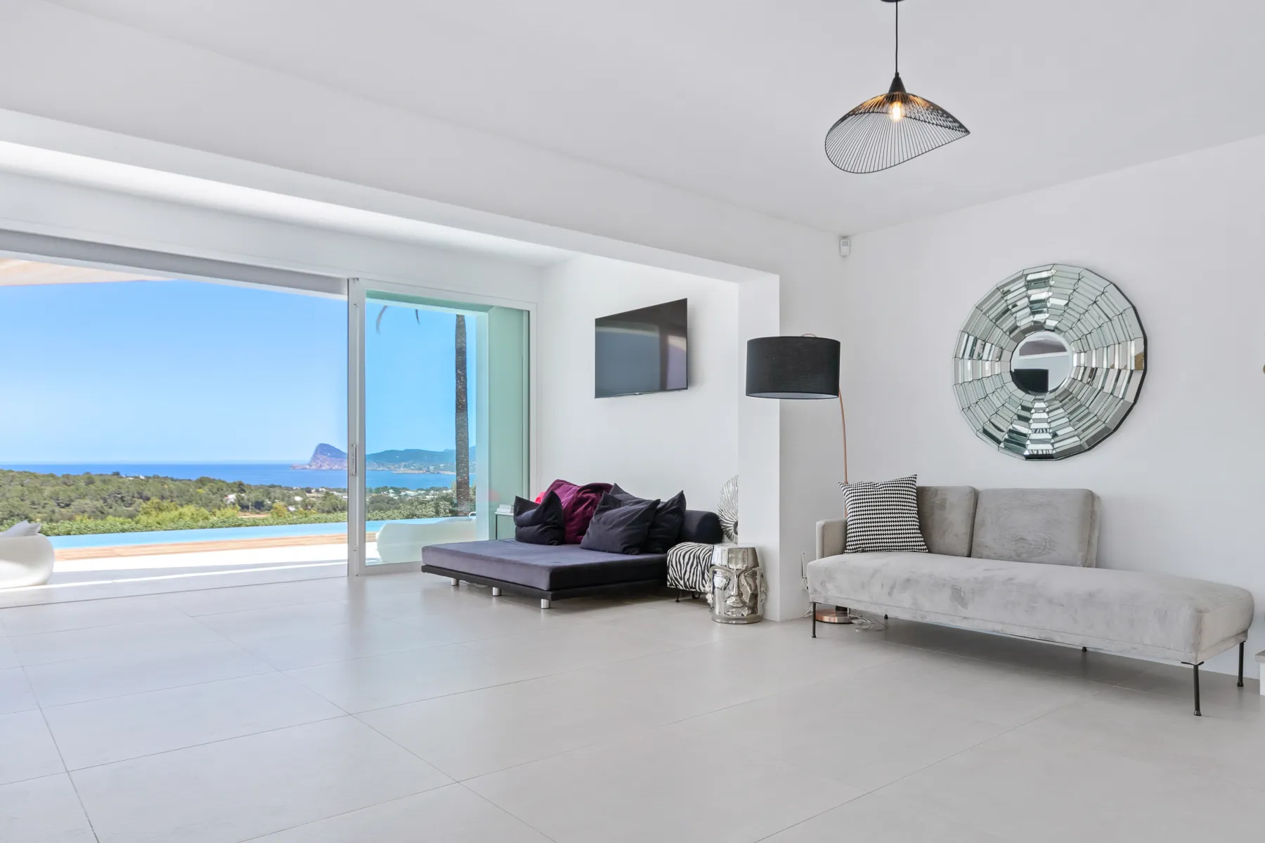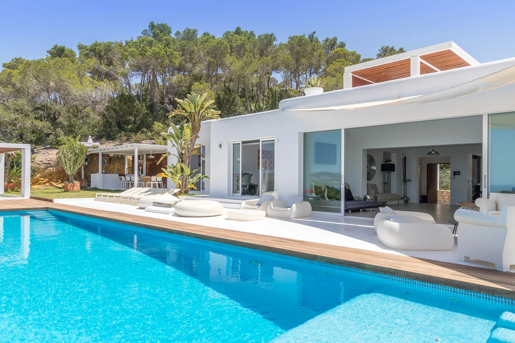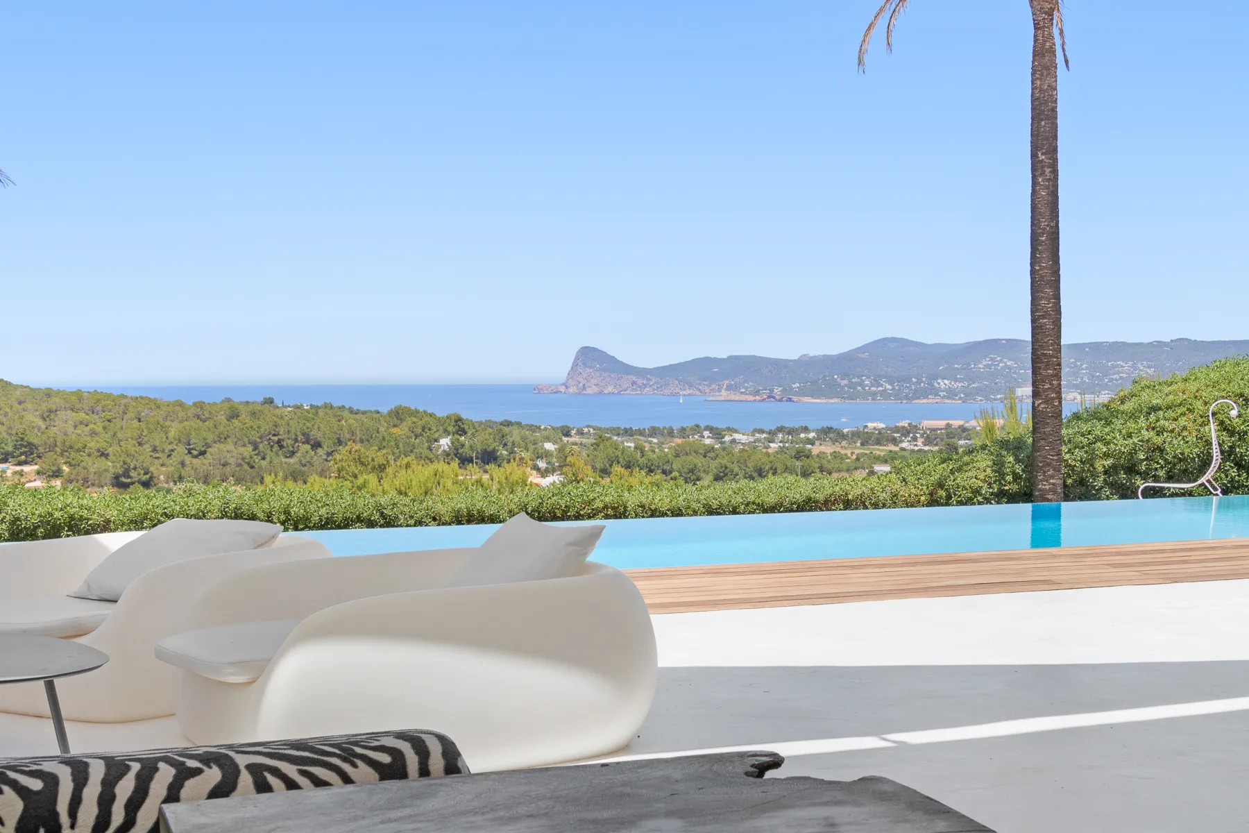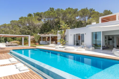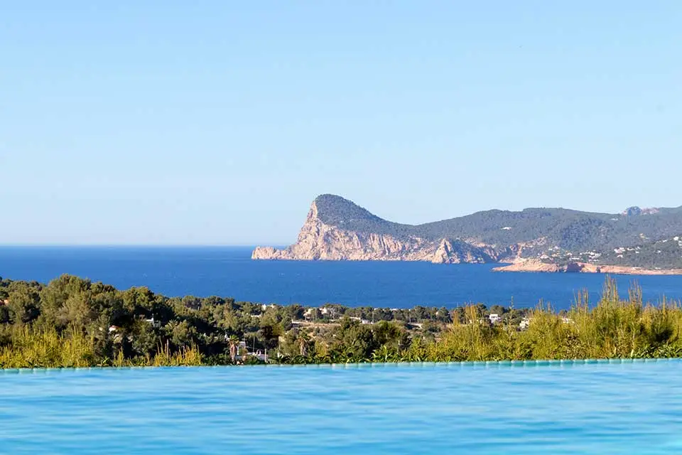 Discover a unique and exclusive private villa located in one of the island’s most desirable areas, just five minutes from Cala Bassa Beach and close to Ibiza Town and its vibrant nightlife. This stunning 400 sqm residence has been meticulously refurbished to a high standard by its British owners and is set within nearly a hectare of beautifully walled private land. Offering some of the finest views in Ibiza, the villa features a spectacular 15 x 4 meter infinity pool, surrounded by expansive terraces and approximately 2000 sqm of lush lawn for your enjoyment.