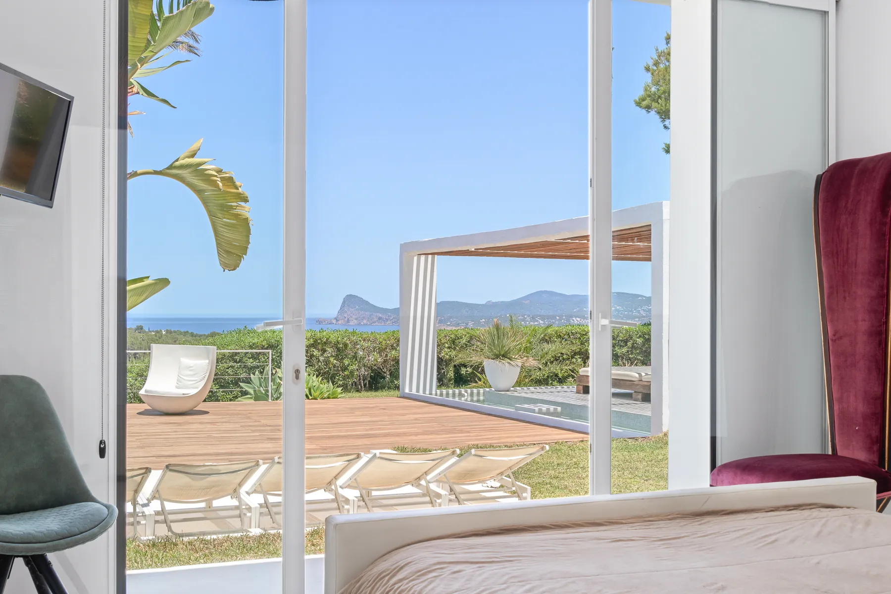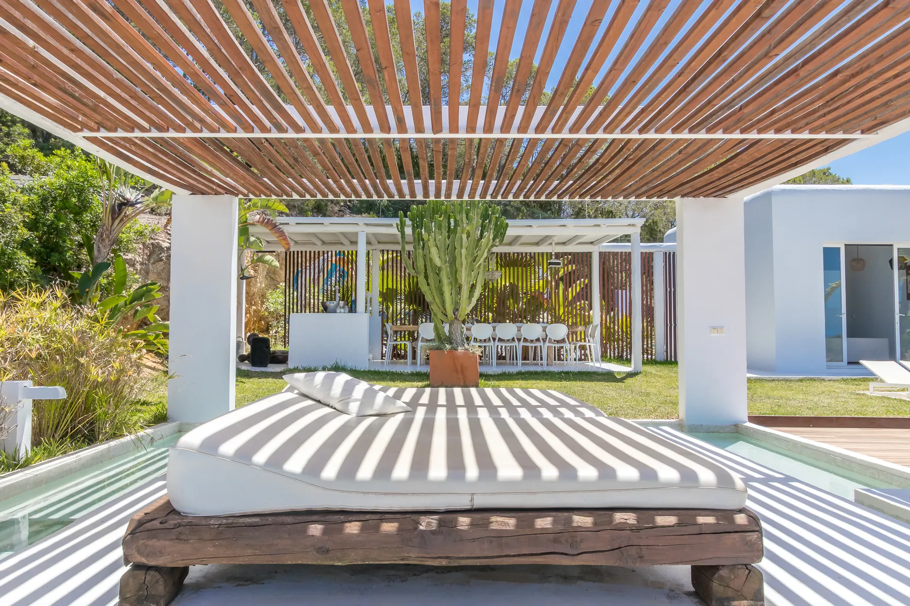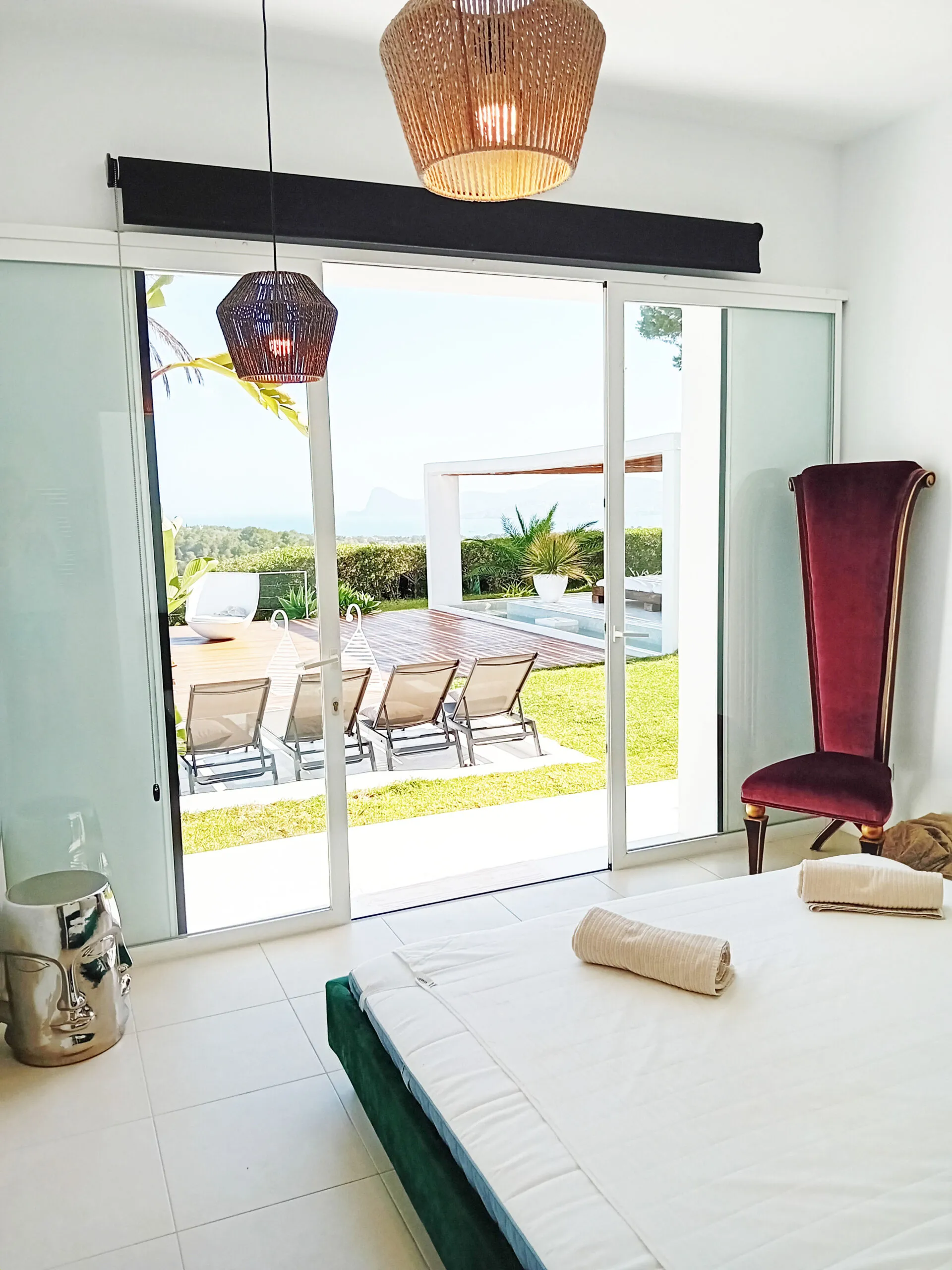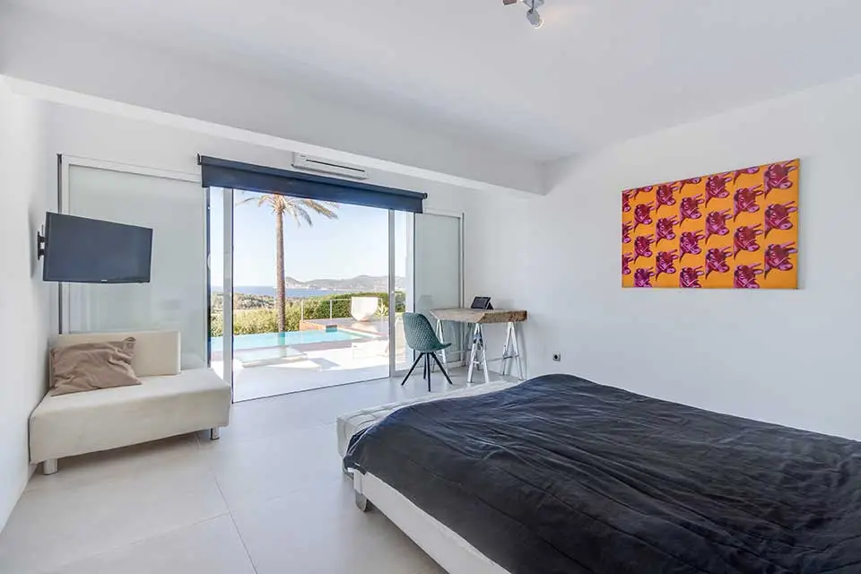 The owners have thoughtfully designed the ambiance at The Josep Villa to enhance your experience. Enjoy the enchanting atmosphere created by automatic colored LED mood lighting that illuminates the main pool and surrounding gardens at night. Water features have been incorporated for both visual and acoustic appeal, further enriching the Villa 101 experience. In addition to the main infinity pool, guests can relax in a second shallow pool area and enjoy the large sail-shaded chill-out island, complete with two super king-sized outdoor beds. For those seeking a magical retreat, there’s also a serene elevated chill-out area within the gardens, offering breathtaking sunset views over the islands off Cala Conta.
