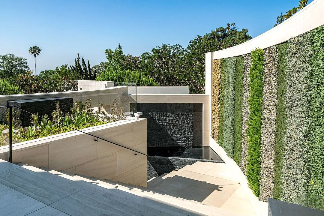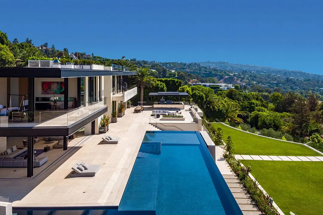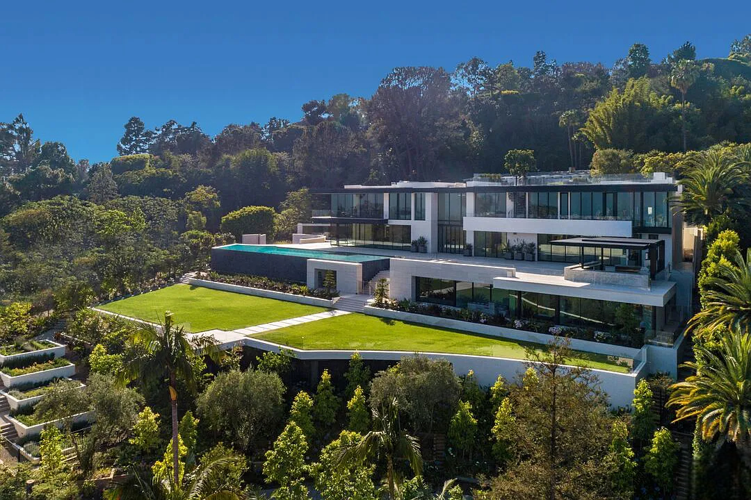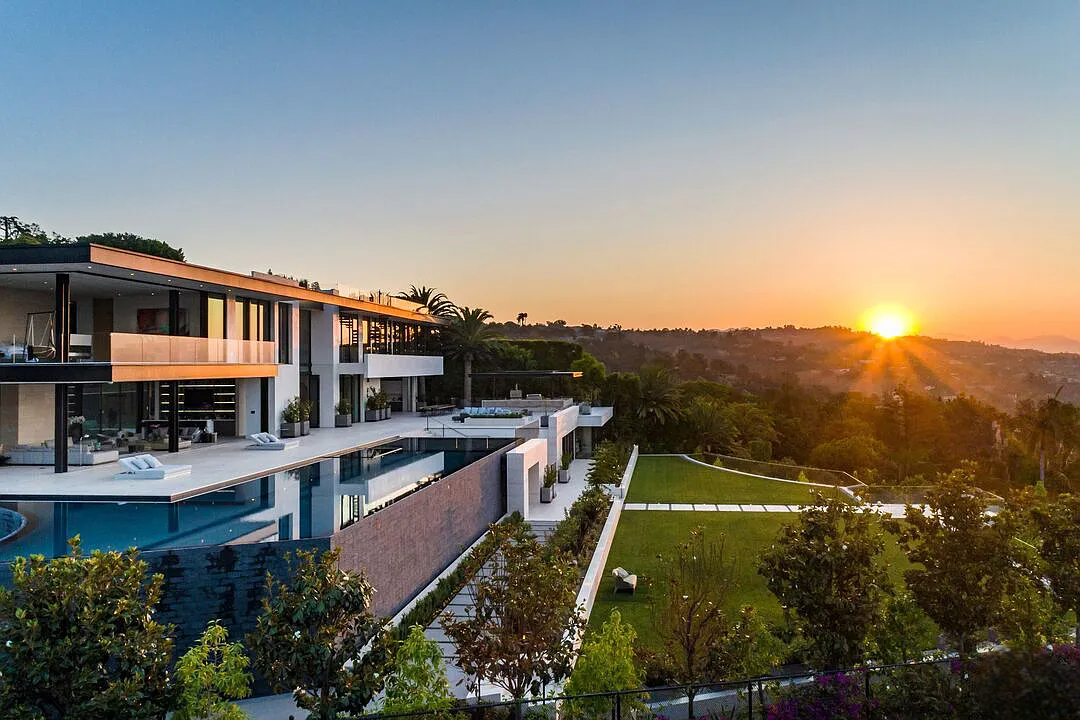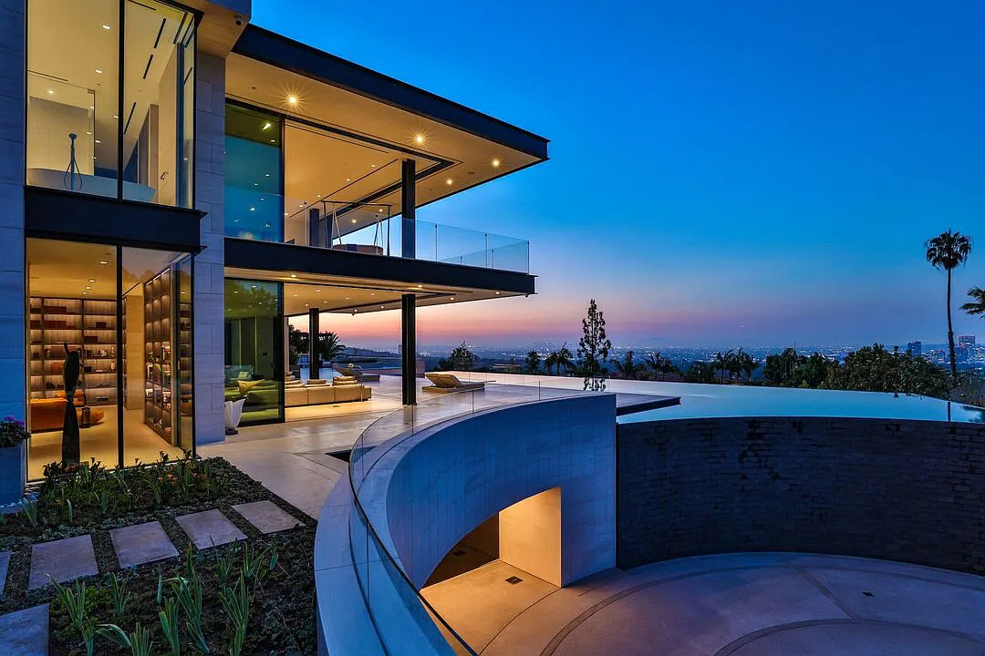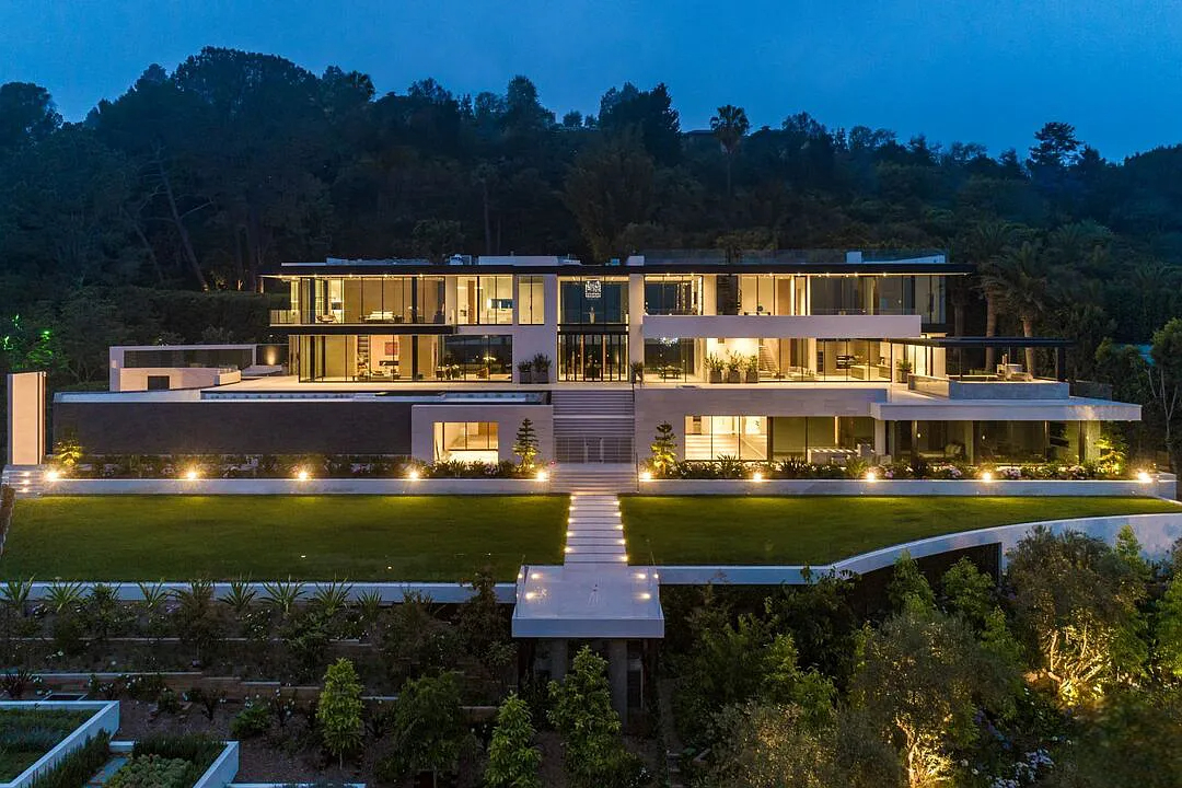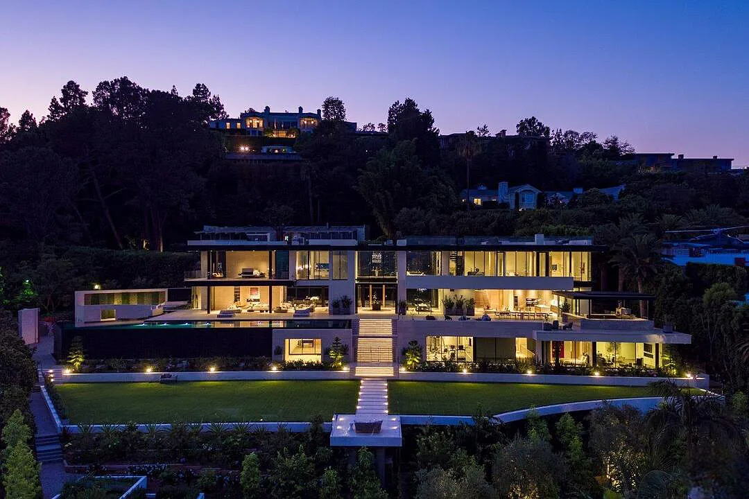 Modern, exotic, and timeless, Biene Villa is a true architectural masterpiece crafted with meticulous precision. This era-defining estate showcases quality at every turn, from its lush landscaped gardens to its striking water features. The grandeur of the home is immediately evident, highlighted by soaring 29-foot entryway ceilings and breathtaking views that stretch from the snow-capped mountains of the Angeles Forest to the idyllic shores of Catalina Island. Spanning an impressive 34,000 square feet, this hilltop sanctuary serves as the ultimate canvas for luxurious living, just moments away from the vibrant Sunset Boulevard.