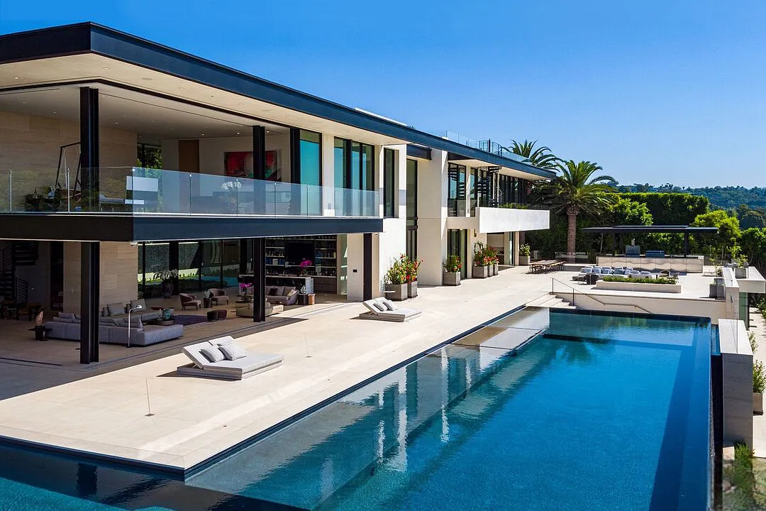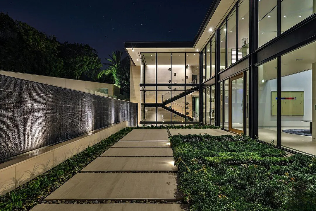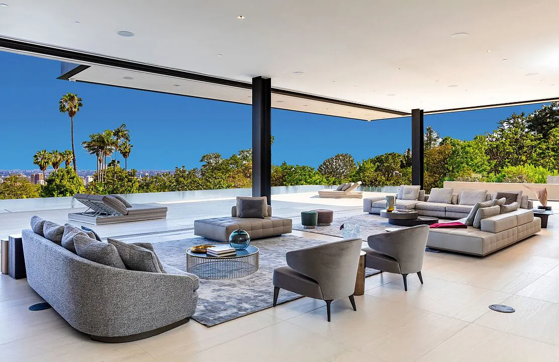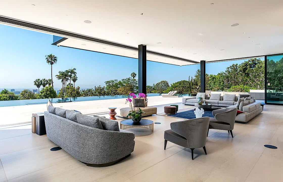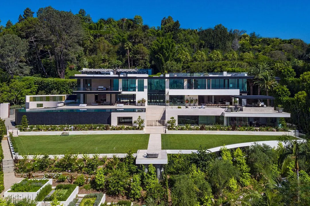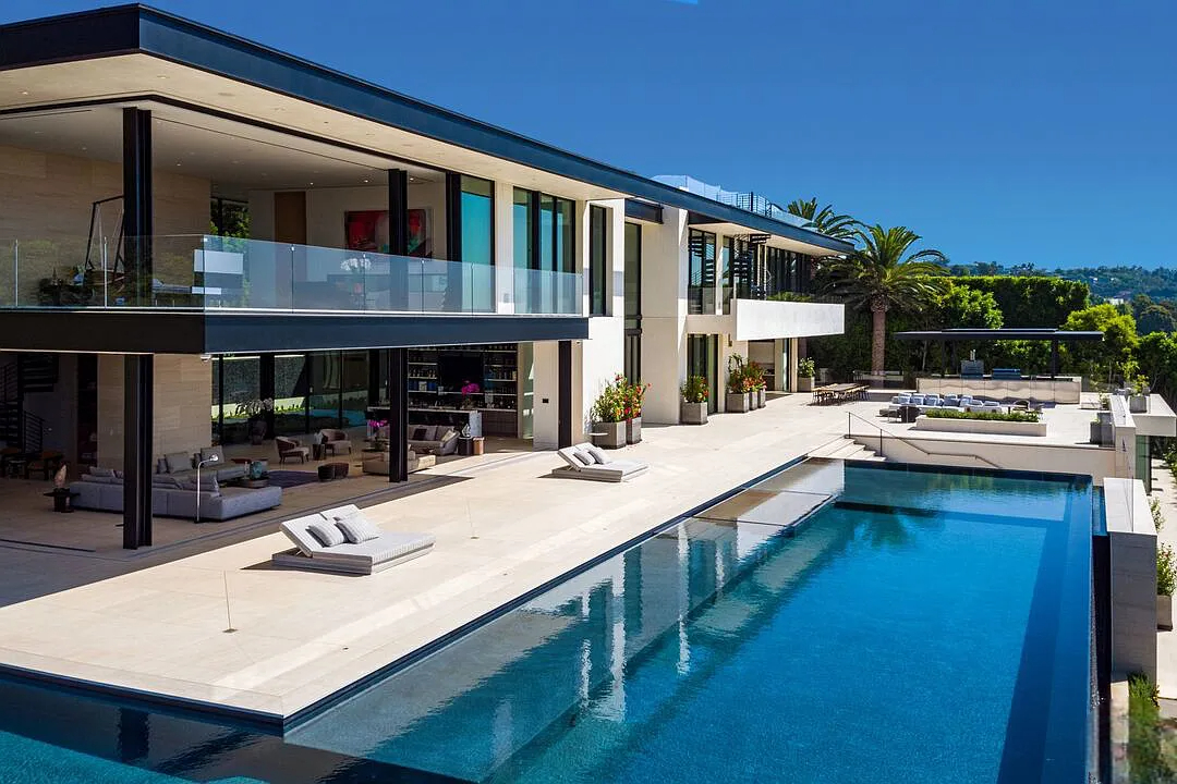 Modern, exotic, and timeless, Biene Villa is a true architectural masterpiece crafted with meticulous precision. This era-defining estate showcases quality at every turn, from its lush landscaped gardens to its striking water features. The grandeur of the home is immediately evident, highlighted by soaring 29-foot entryway ceilings and breathtaking views that stretch from the snow-capped mountains of the Angeles Forest to the idyllic shores of Catalina Island. Spanning an impressive 34,000 square feet, this hilltop sanctuary serves as the ultimate canvas for luxurious living, just moments away from the vibrant Sunset Boulevard.