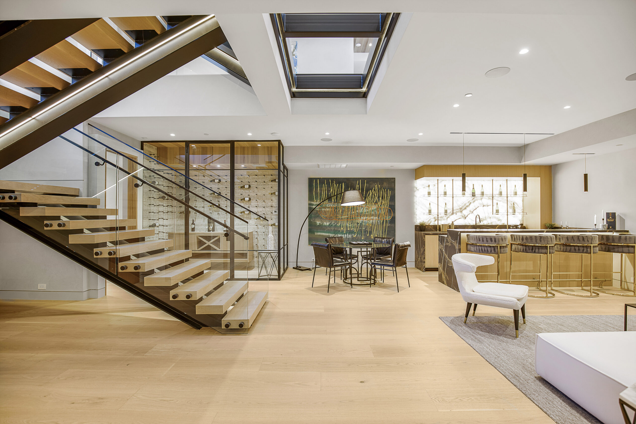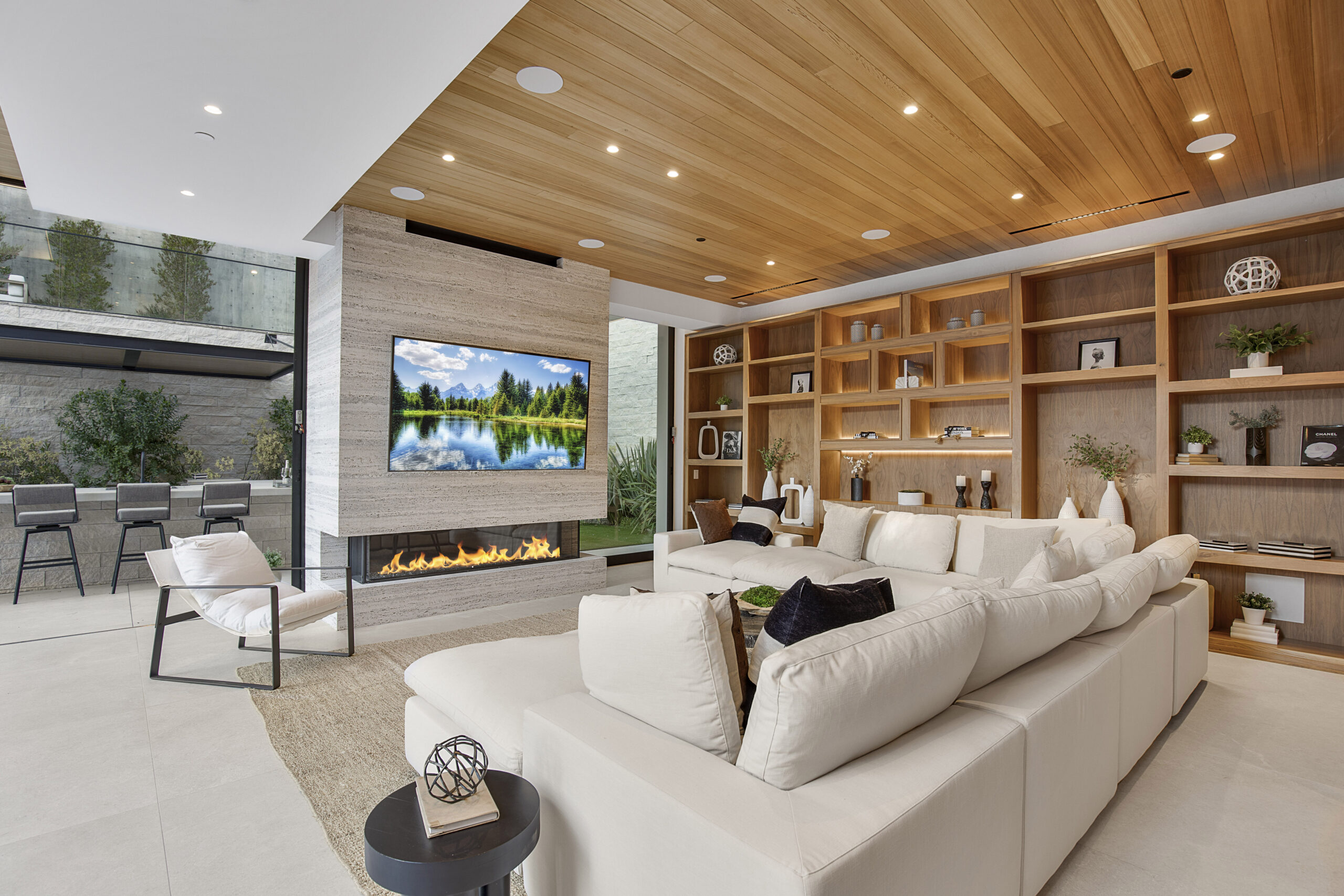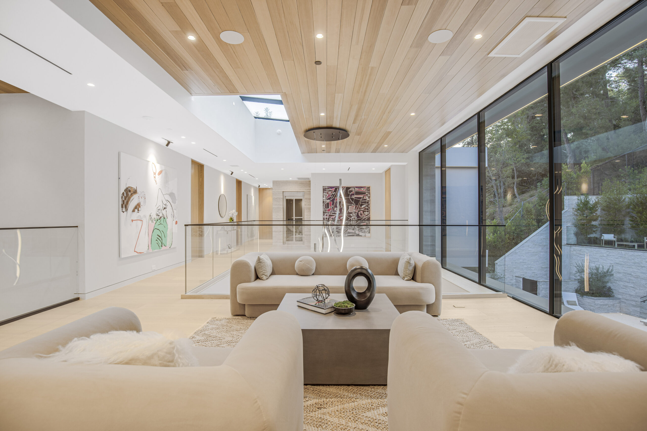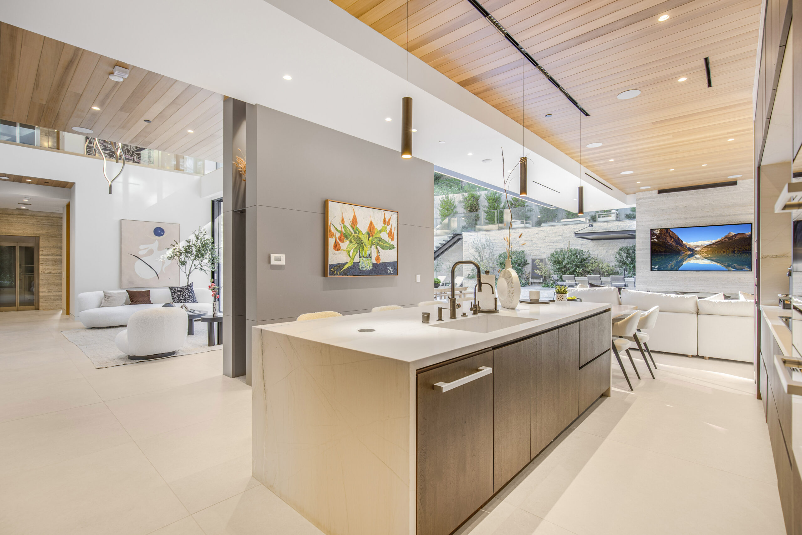 Step outside to an awe-inspiring outdoor oasis featuring a two-level terraced backyard, beautifully landscaped and illuminated hillside, lush foliage, elegant fountains, sleek porcelain stone, and Ipe wood decking. Multiple fire pits, an outdoor kitchen and bar, and a sparkling saltwater pool with spa complete this tranquil retreat ideal for both relaxation and entertaining. The primary suite offers a serene sanctuary with walls of glass, breathtaking views, a stone fireplace, and a private bridge leading to the upper-level backyard. Its luxurious bathroom boasts an oversized steam shower, soaking tub, double vanity with Taj Mahal stone countertops, and Gessi fixtures, paired with a dream walk-in closet featuring LED-lit cabinets and onyx countertops. The lower level enhances the living experience with a 150-bottle wine cellar, fully equipped gym, recreation room with lighted onyx bar, and a state-of-the-art movie theater. Additional highlights include sun-drenched guest bedrooms with ensuite baths, a formal office, a first-class elevator, a spacious three-car garage, Lutron lighting, and integrated smart home automation. Imported Italian stone, wood-paneled ceilings, European oak and porcelain floors, and trimless LED lighting further elevate the interiors, creating a cohesive atmosphere of luxury and sophistication throughout.