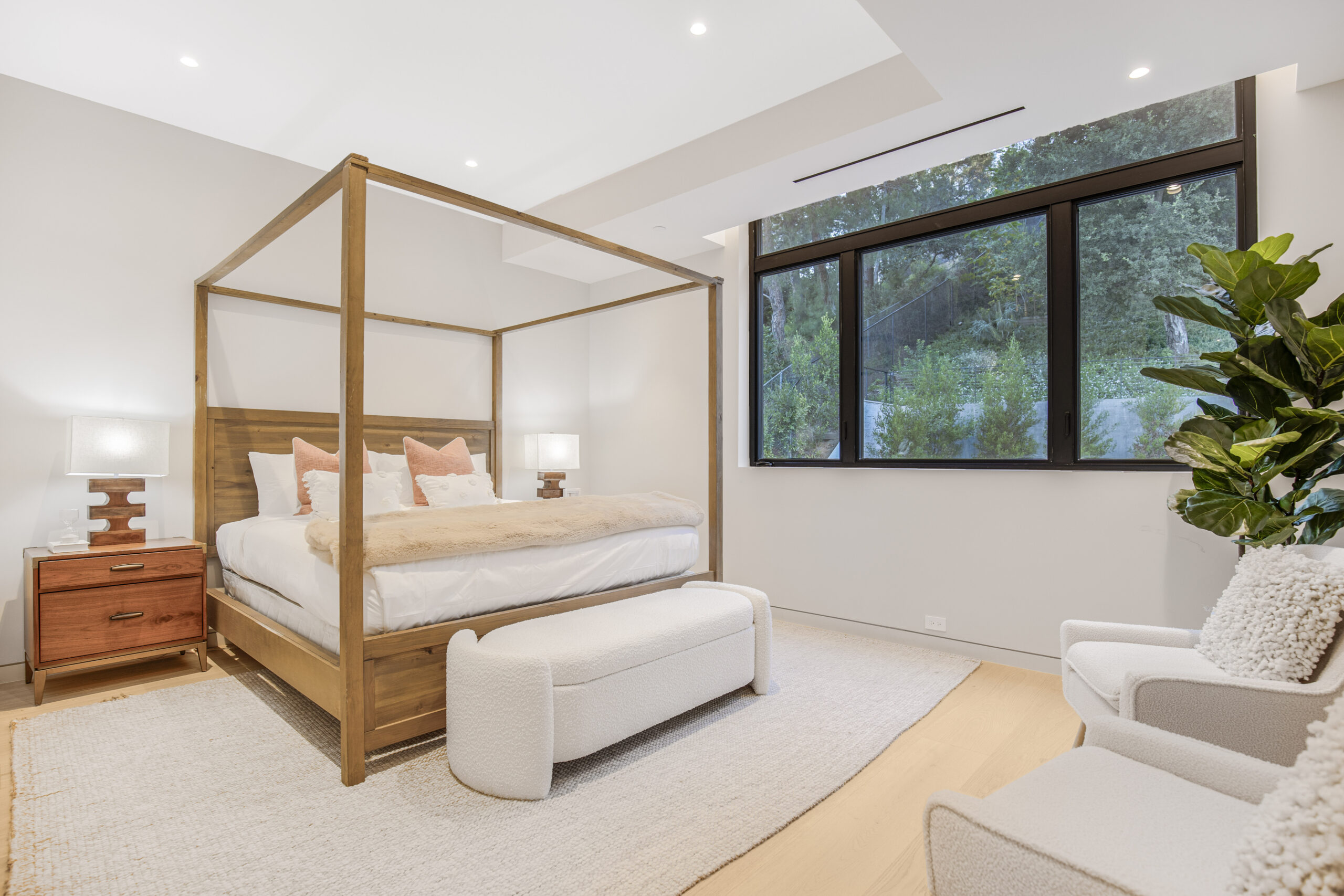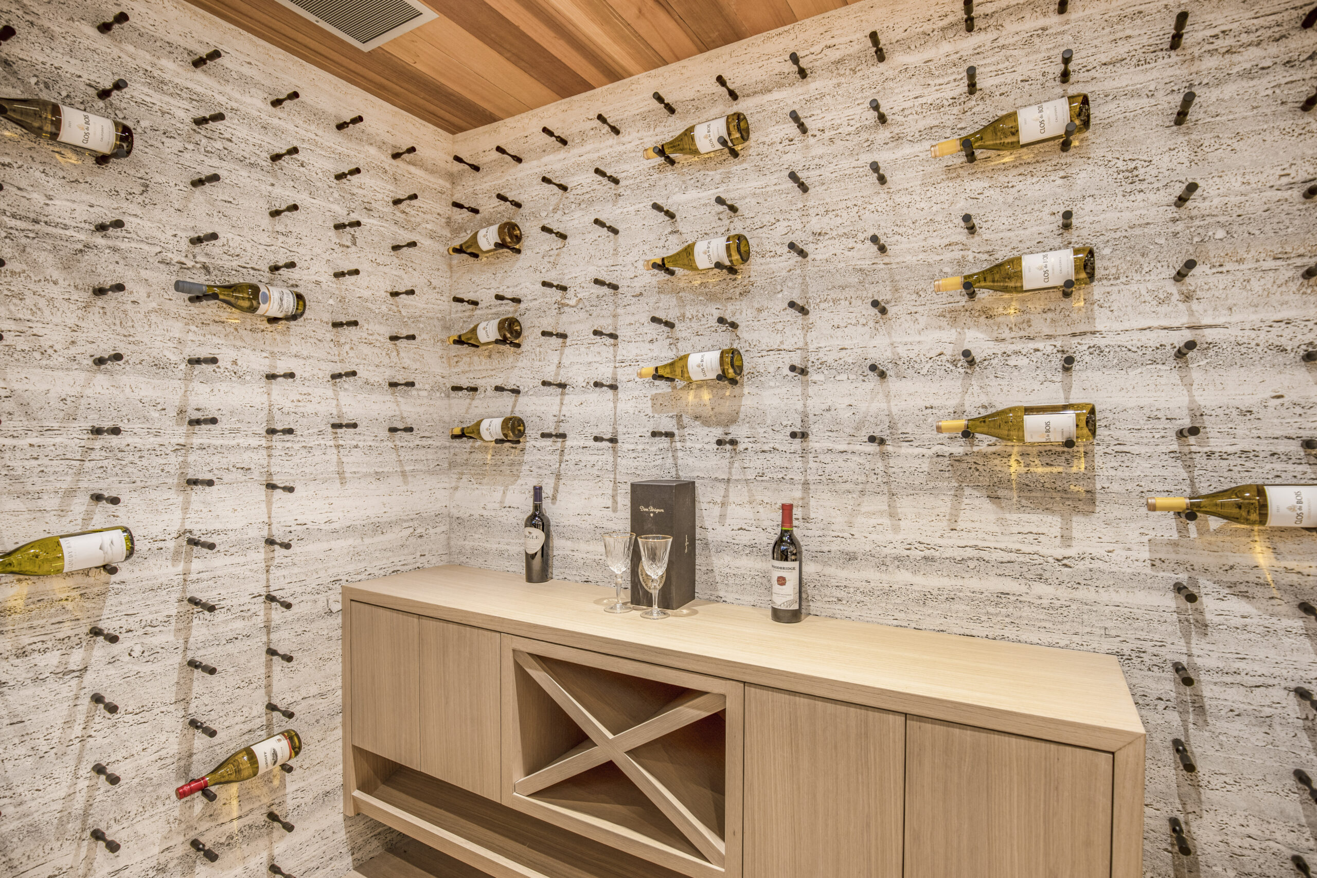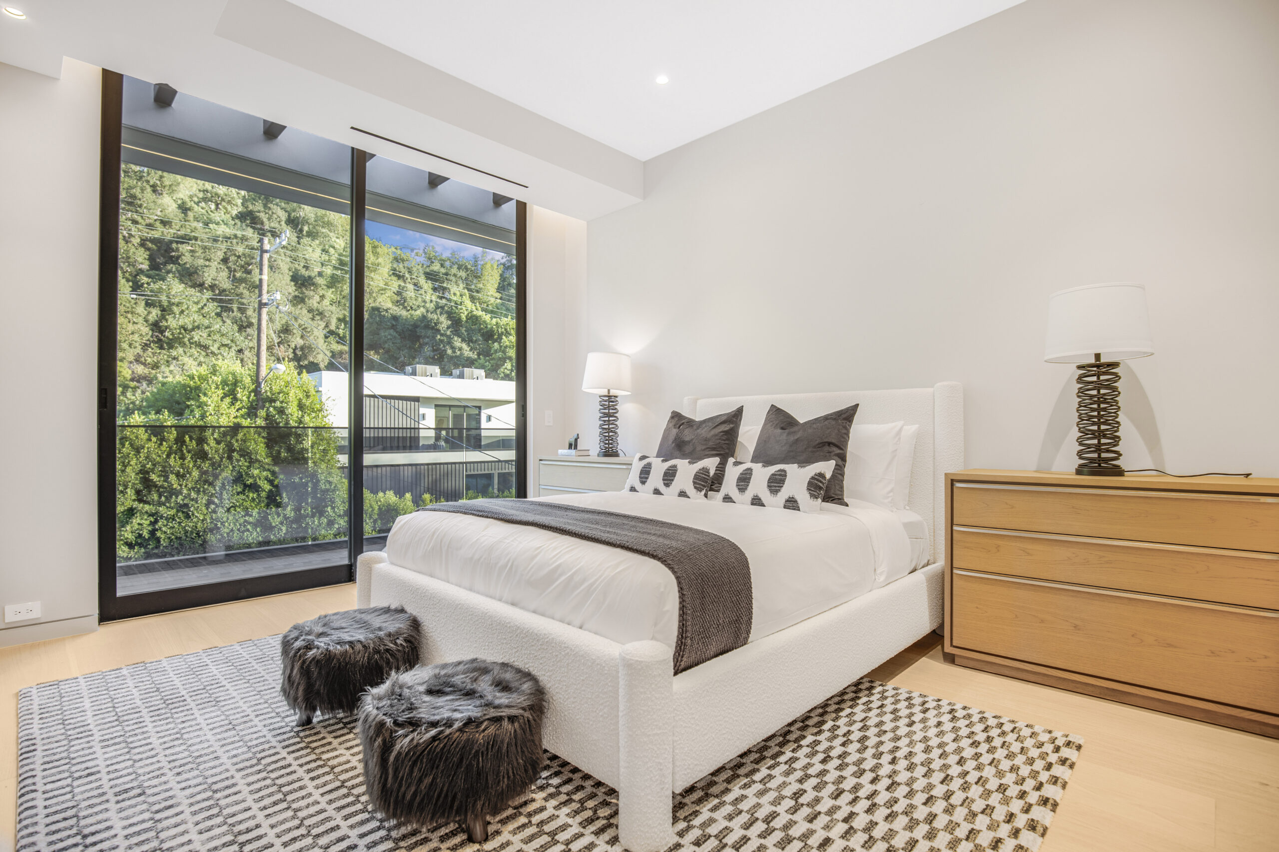 Step outside to an awe-inspiring outdoor oasis featuring a two-level terraced backyard, beautifully landscaped and illuminated hillside, lush foliage, elegant fountains, sleek porcelain stone, and Ipe wood decking. Multiple fire pits, an outdoor kitchen and bar, and a sparkling saltwater pool with spa complete this tranquil retreat ideal for both relaxation and entertaining. The primary suite offers a serene sanctuary with walls of glass, breathtaking views, a stone fireplace, and a private bridge leading to the upper-level backyard. Its luxurious bathroom boasts an oversized steam shower, soaking tub, double vanity with Taj Mahal stone countertops, and Gessi fixtures, paired with a dream walk-in closet featuring LED-lit cabinets and onyx countertops. The lower level enhances the living experience with a 150-bottle wine cellar, fully equipped gym, recreation room with lighted onyx bar, and a state-of-the-art movie theater. Additional highlights include sun-drenched guest bedrooms with ensuite baths, a formal office, a first-class elevator, a spacious three-car garage, Lutron lighting, and integrated smart home automation. Imported Italian stone, wood-paneled ceilings, European oak and porcelain floors, and trimless LED lighting further elevate the interiors, creating a cohesive atmosphere of luxury and sophistication throughout.