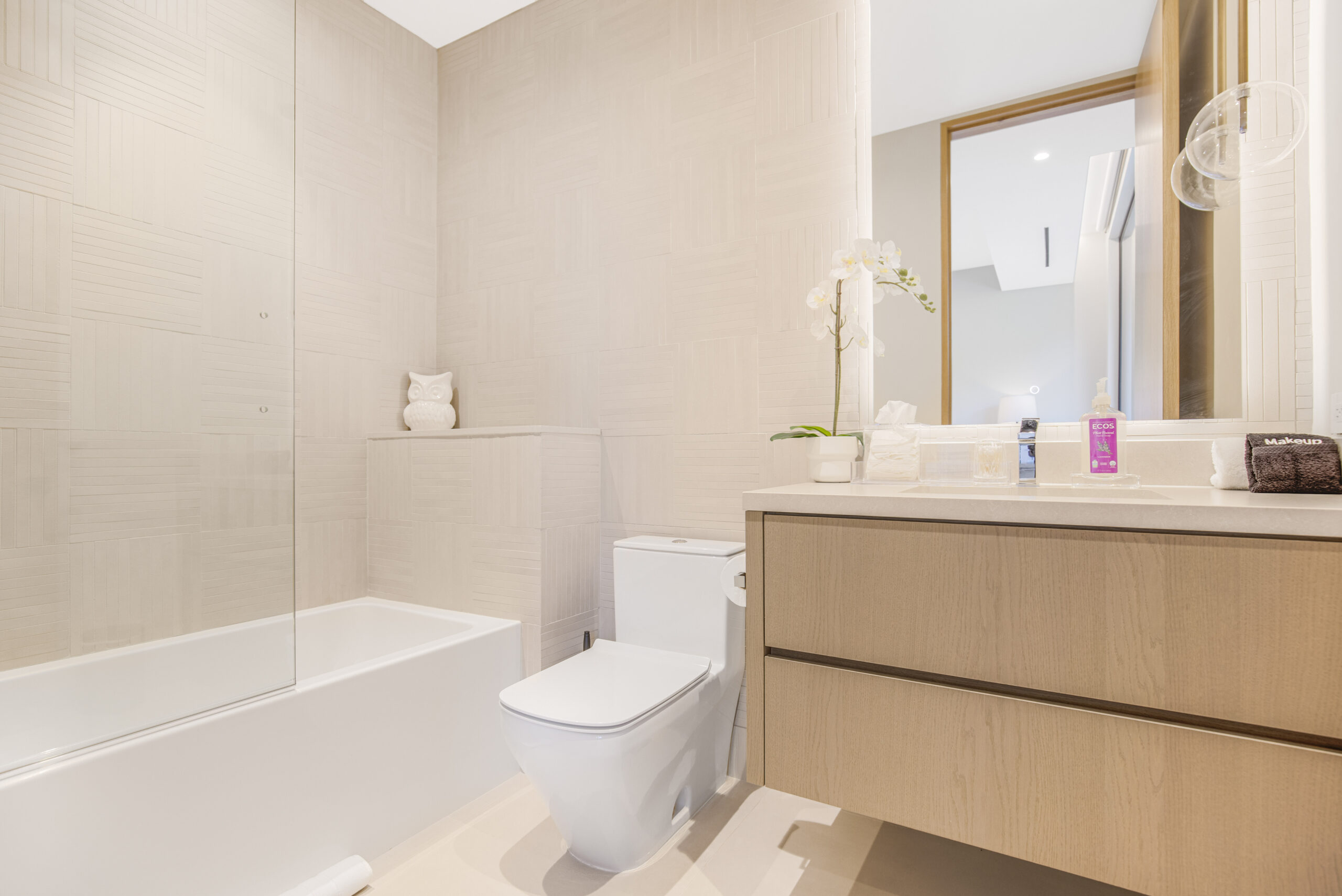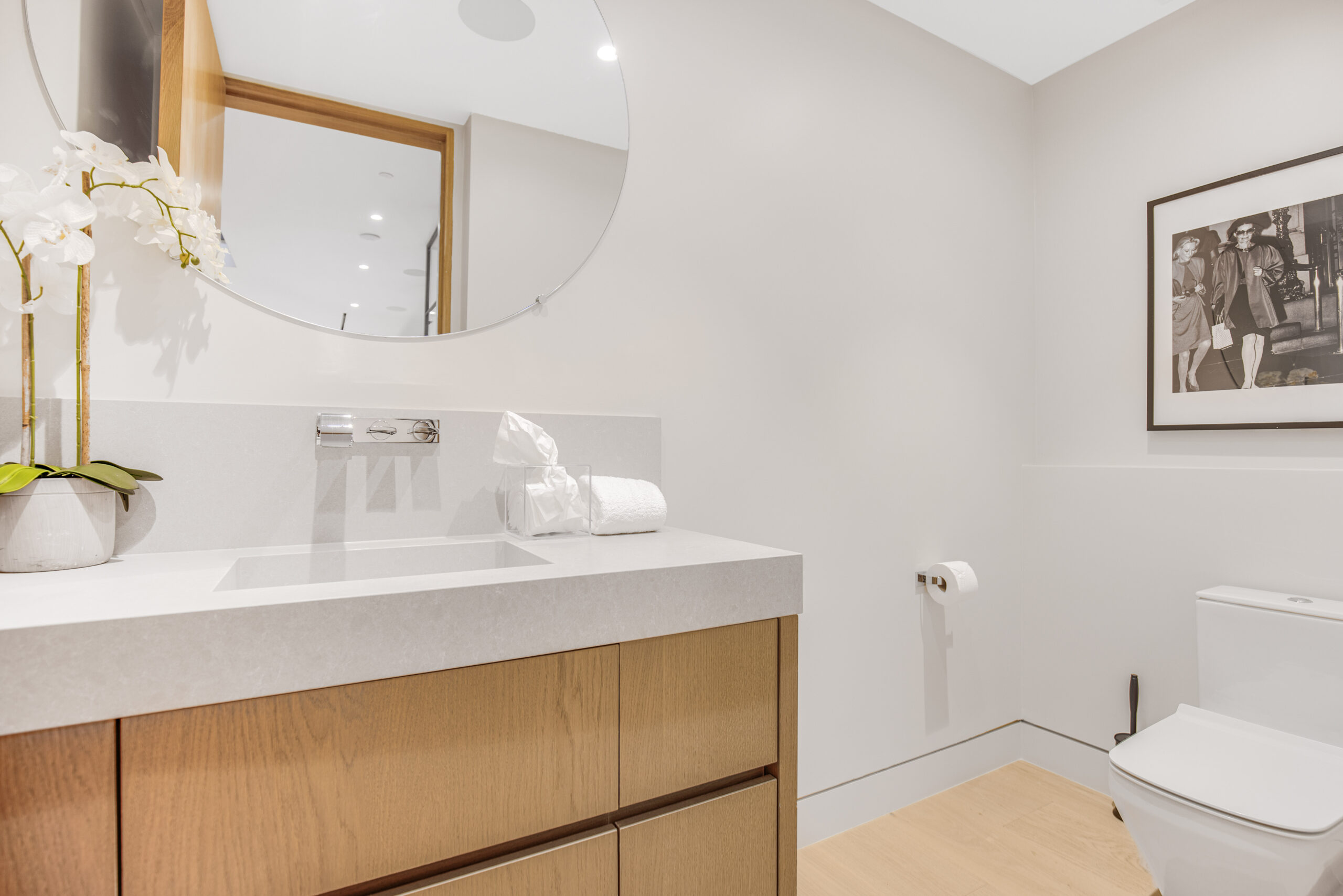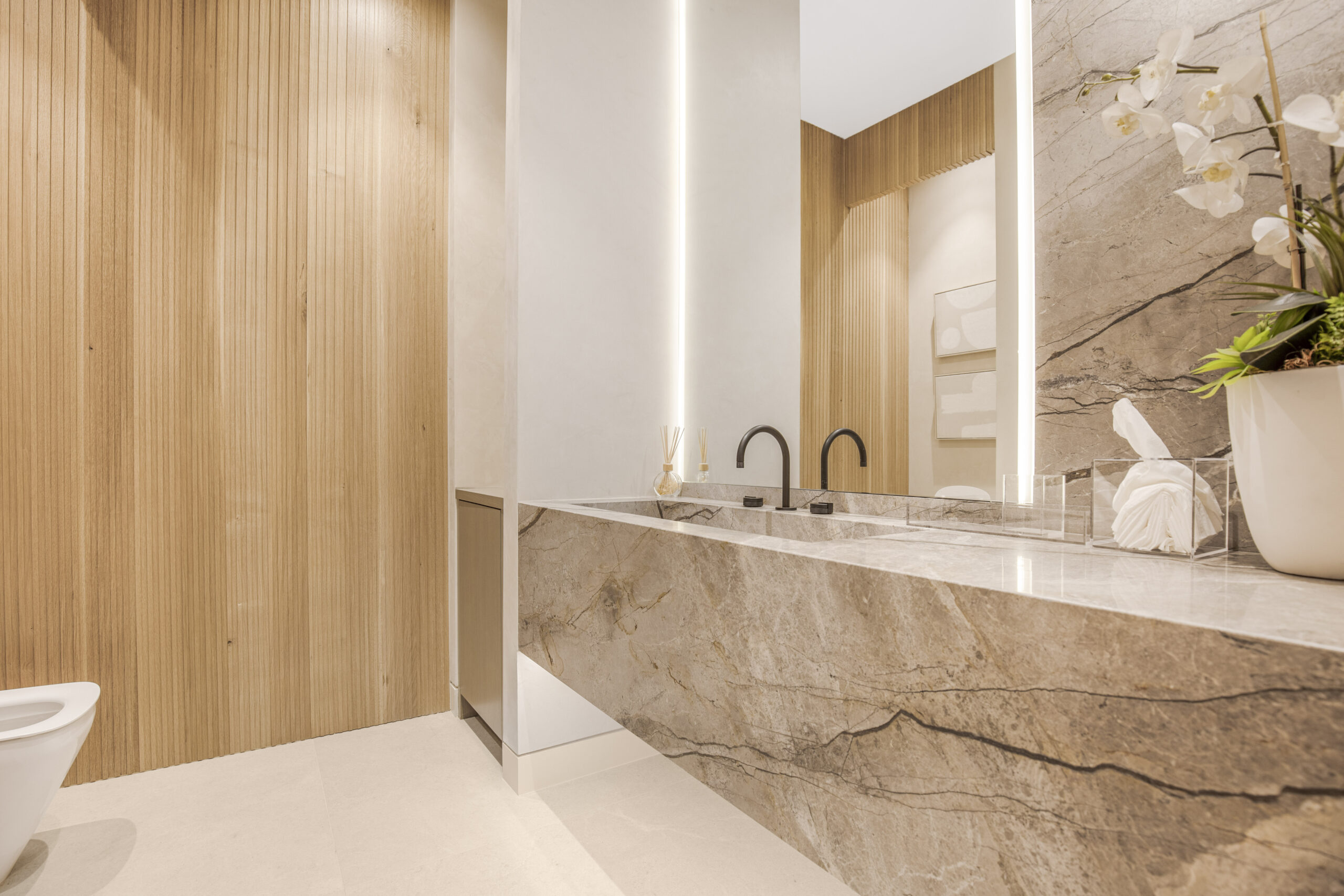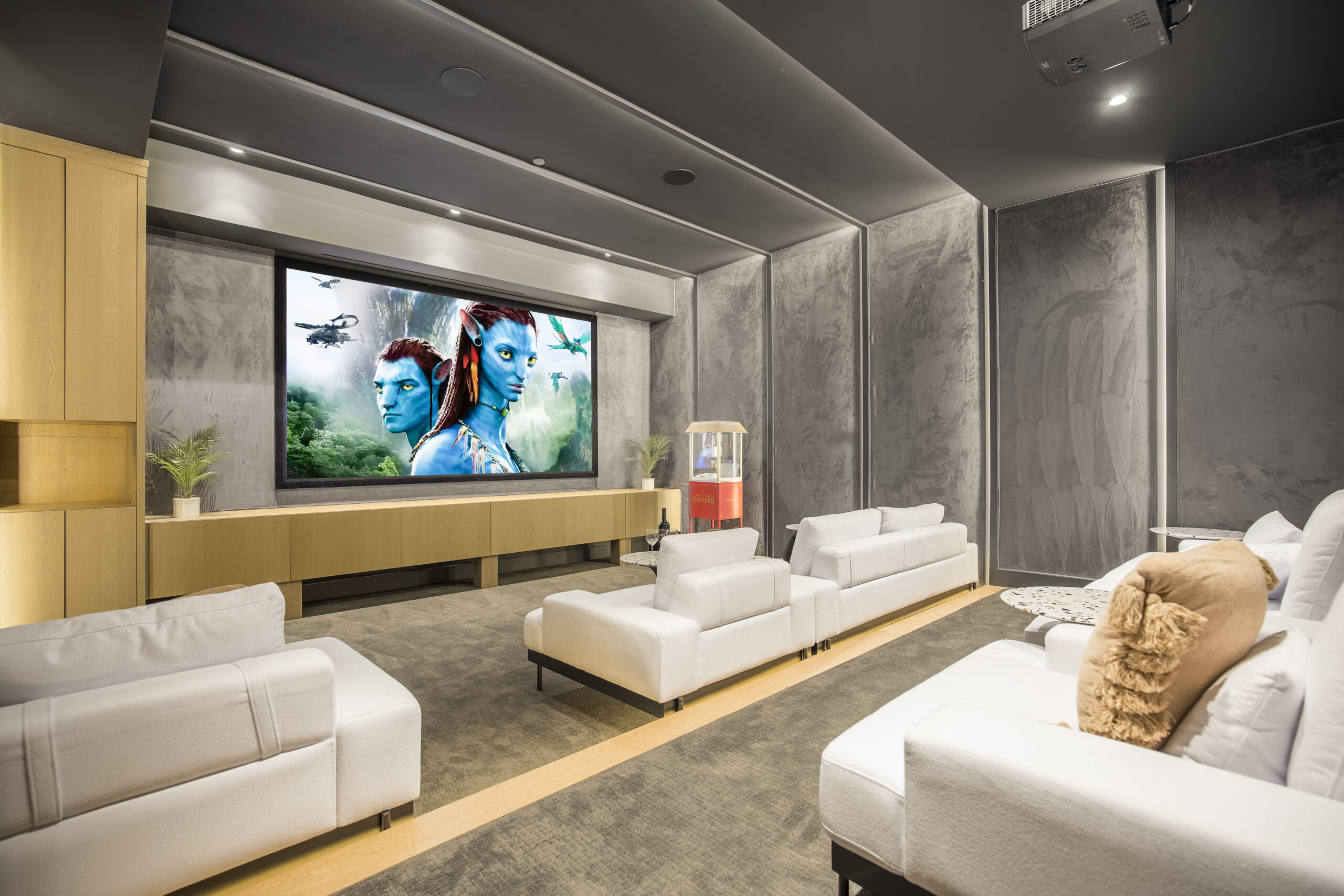 Step outside to an awe-inspiring outdoor oasis featuring a two-level terraced backyard, beautifully landscaped and illuminated hillside, lush foliage, elegant fountains, sleek porcelain stone, and Ipe wood decking. Multiple fire pits, an outdoor kitchen and bar, and a sparkling saltwater pool with spa complete this tranquil retreat ideal for both relaxation and entertaining. The primary suite offers a serene sanctuary with walls of glass, breathtaking views, a stone fireplace, and a private bridge leading to the upper-level backyard. Its luxurious bathroom boasts an oversized steam shower, soaking tub, double vanity with Taj Mahal stone countertops, and Gessi fixtures, paired with a dream walk-in closet featuring LED-lit cabinets and onyx countertops. The lower level enhances the living experience with a 150-bottle wine cellar, fully equipped gym, recreation room with lighted onyx bar, and a state-of-the-art movie theater. Additional highlights include sun-drenched guest bedrooms with ensuite baths, a formal office, a first-class elevator, a spacious three-car garage, Lutron lighting, and integrated smart home automation. Imported Italian stone, wood-paneled ceilings, European oak and porcelain floors, and trimless LED lighting further elevate the interiors, creating a cohesive atmosphere of luxury and sophistication throughout.