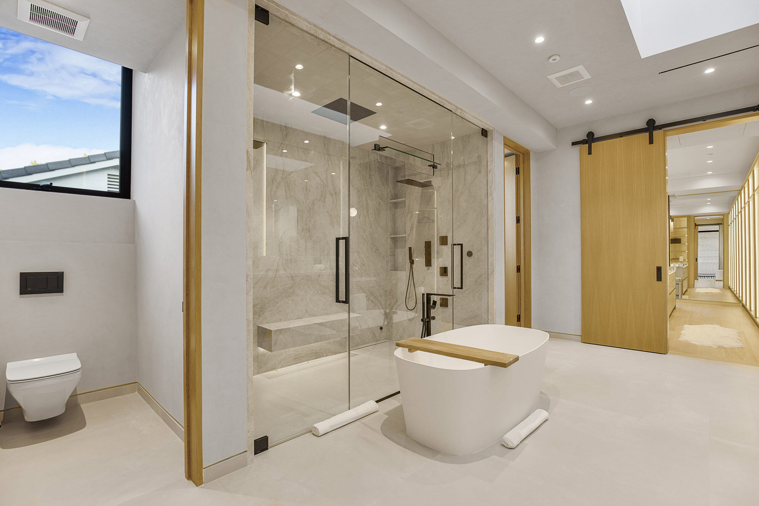 This exceptional three-level estate is a masterpiece of modern design and refined elegance, sprawling across approximately 8,000 square feet on a generous 22,000 square foot gated lot. Featuring 5 bedrooms and 7.5 bathrooms, this private residence is crafted with meticulous attention to detail, using only the finest materials and outfitted with nearly every luxury amenity imaginable. A grand entrance welcomes you with a floating staircase leading into a spacious open floor plan highlighted by soaring ceilings, skylights, and expansive floor-to-ceiling Fleetwood doors. Walls of glass flood the interiors with natural light while seamlessly blending indoor and outdoor living spaces. The designer double kitchen is a chef’s dream, equipped with built-in Miele appliances, a center island, breakfast bar, and high-end European fixtures—perfectly designed for entertaining guests.