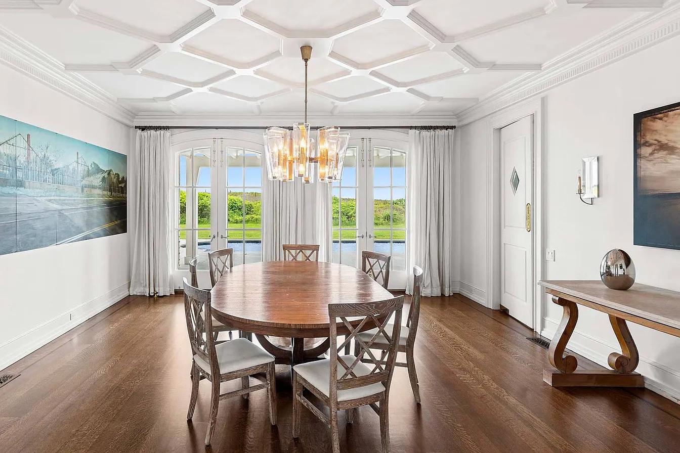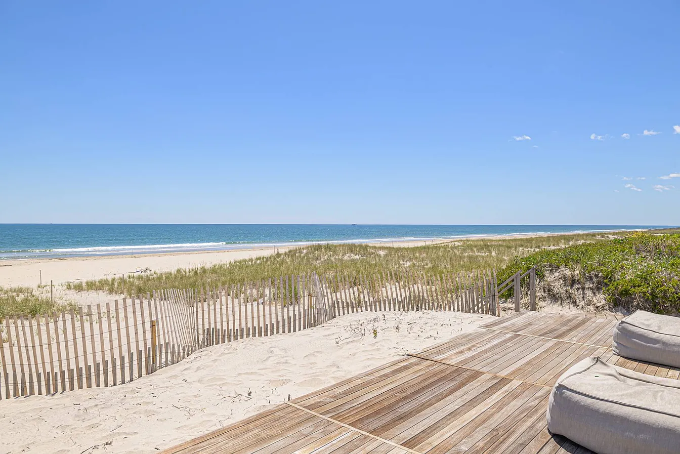 On the ocean side, you’ll find a heated gunite pool and spa, along with both covered and open patios that invite outdoor relaxation. An expansive upper deck overlooks the ocean, while an elevated platform above the dunes is perfect for lounging in the sun. The first-floor living areas encompass a welcoming living room with a fireplace, a billiards and media room, a formal dining room, and an eat-in kitchen equipped with professional-grade appliances and French doors that open to the oceanside deck and pool.