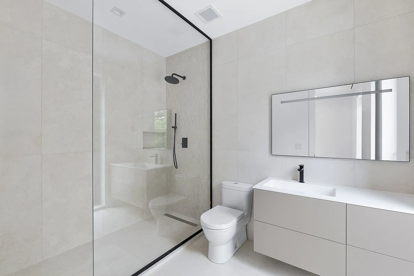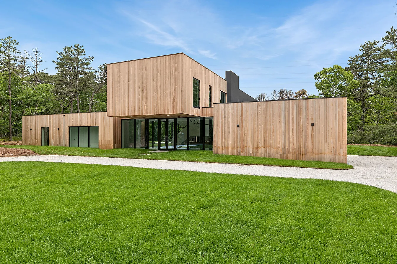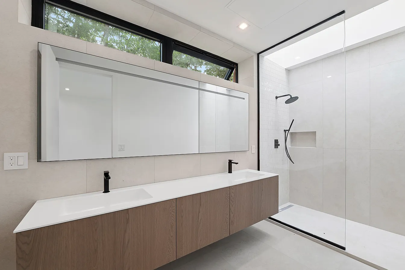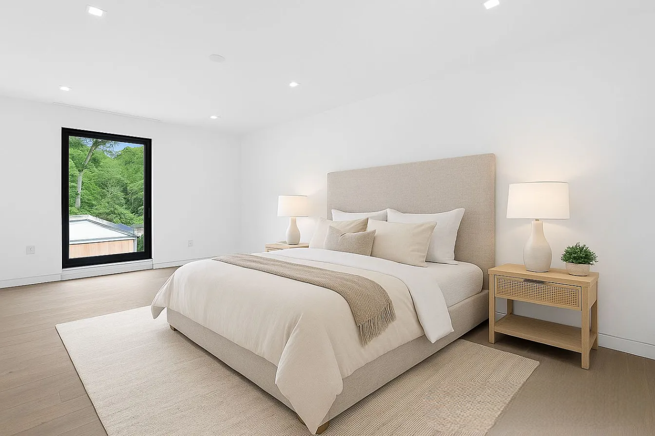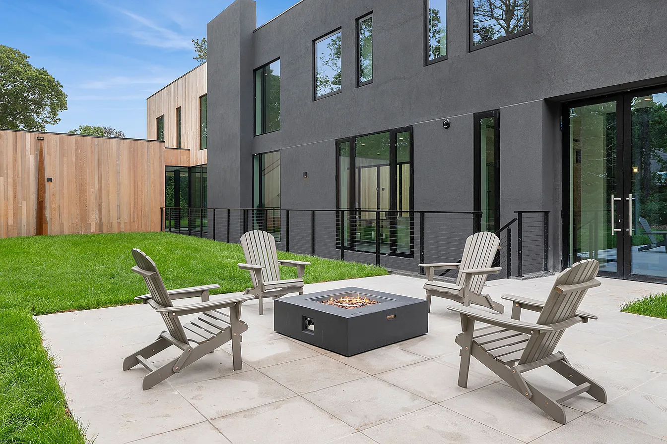 The design masterfully integrates indoor and outdoor living, featuring expansive floor-to-ceiling glass sliders and oversized windows that frame serene views while flooding the interiors with sunlight. The main level showcases modern elegance with 48″ x 48″ Italian porcelain tiles and textured natural rock, while the upper floors are warmed by European oak flooring, enhancing the minimalist aesthetic. At the heart of the dramatic great room is a full-height fireplace clad in imported Italian silver travertine, seamlessly connecting to a 20′ x 40′ heated gunite pool, a pool house, and lush garden terraces, all crafted for year-round enjoyment and privacy.