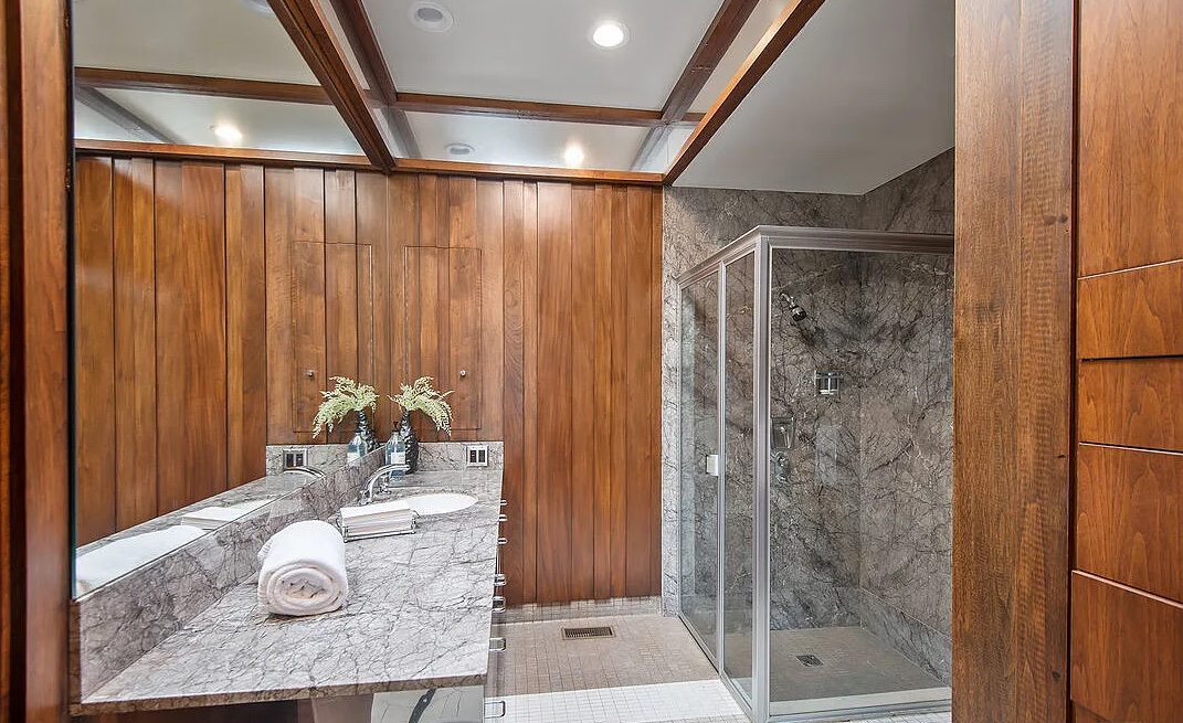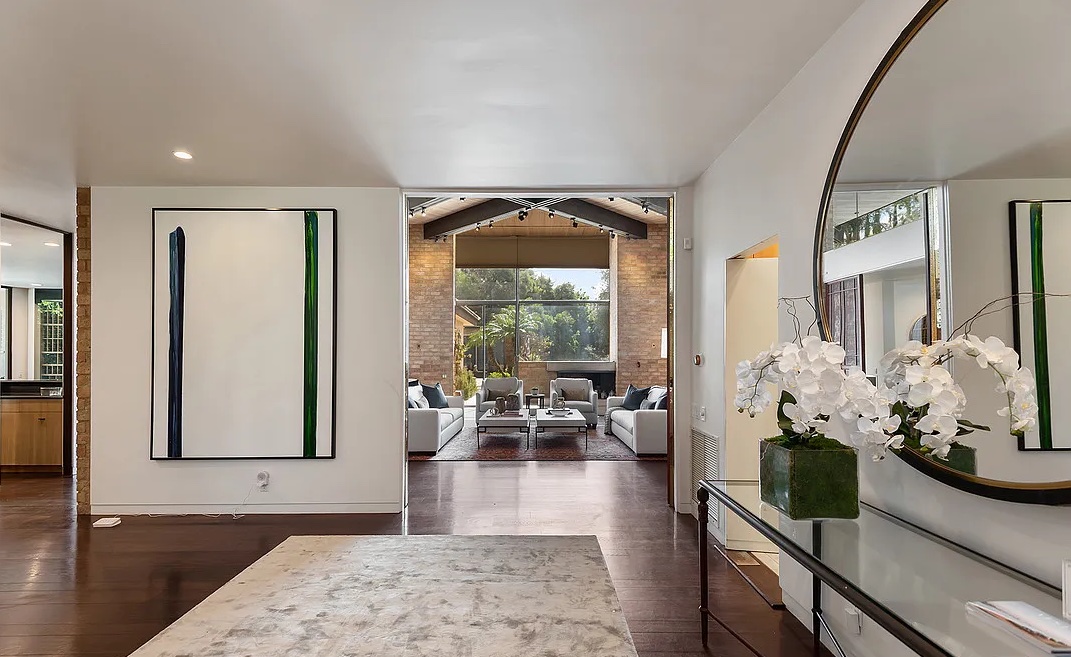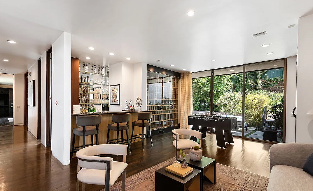 This stunning two-story estate on Lower Summit Drive in Beverly Hills features five bedrooms and nine bathrooms. Upon entering, you are welcomed by a spacious courtyard that leads into a grand living room with a fireplace overlooking a lush backyard filled with mature trees. The home boasts high ceilings and hardwood floors throughout, creating an elegant and warm ambiance. A large formal dining room and an open den with a bar and temperature-controlled wine cellars offer perfect spaces for both entertaining and relaxing.