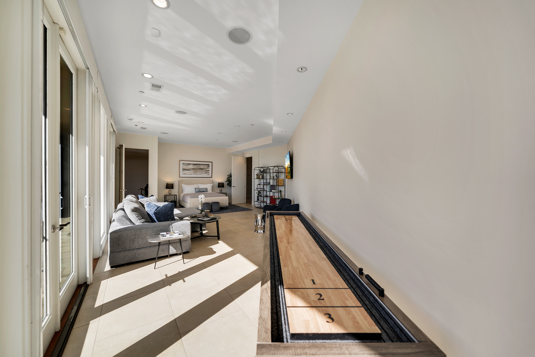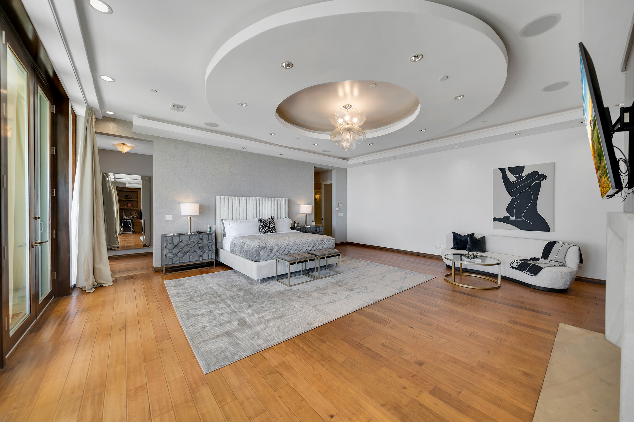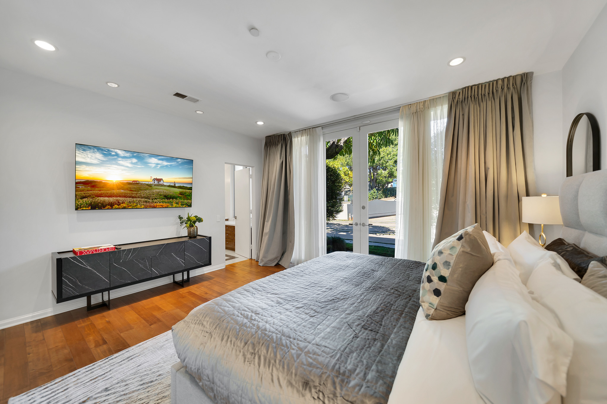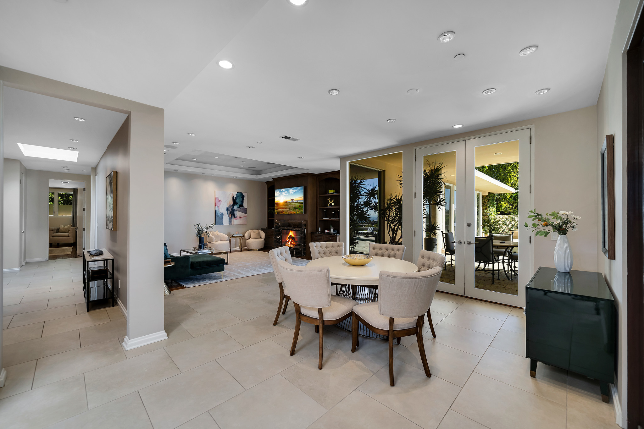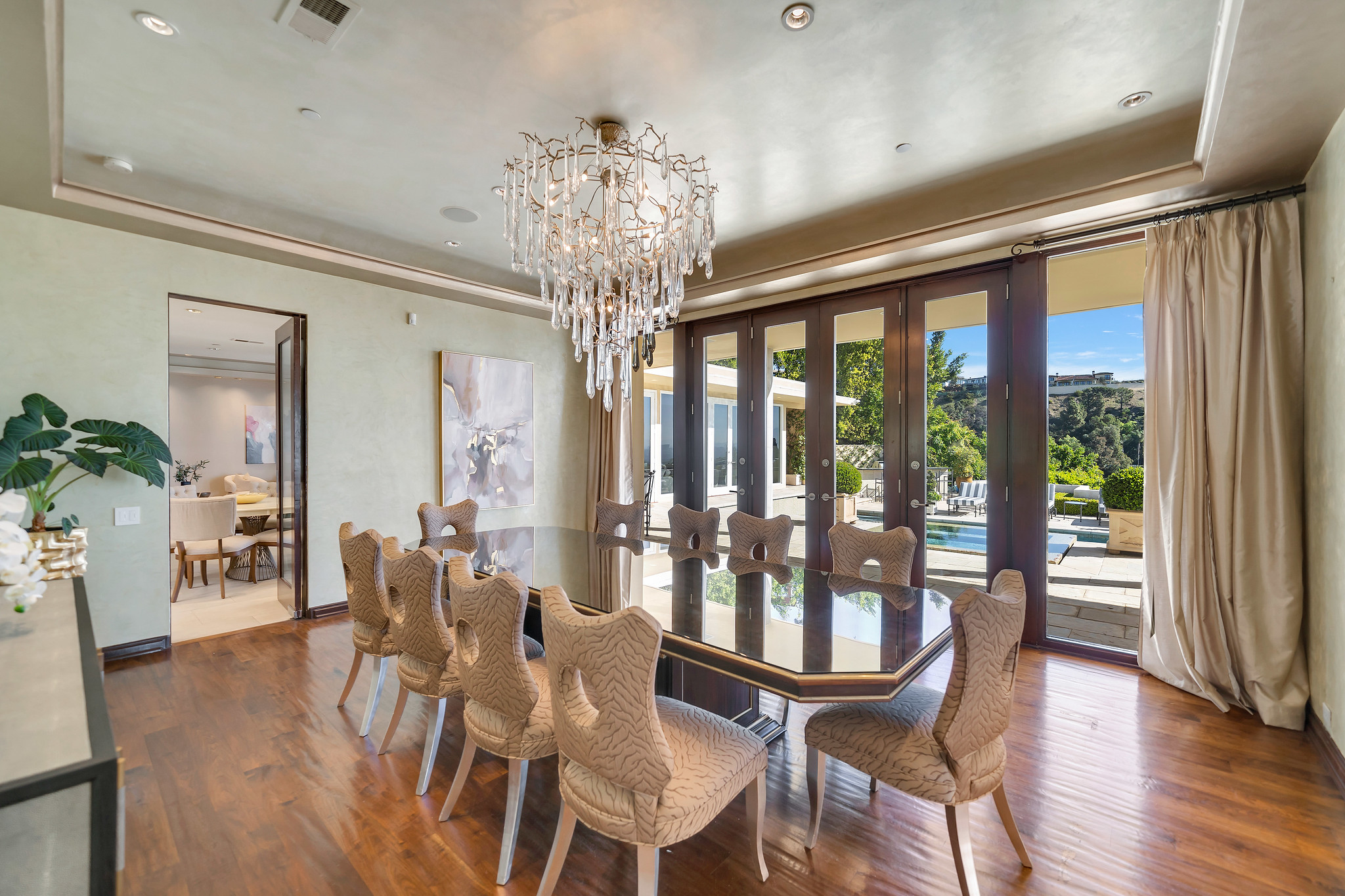 With floor-to-ceiling glass French doors gracing much of the home, an abundance of natural light floods the interiors, creating a seamless blend of indoor and outdoor living that enhances the overall experience.
