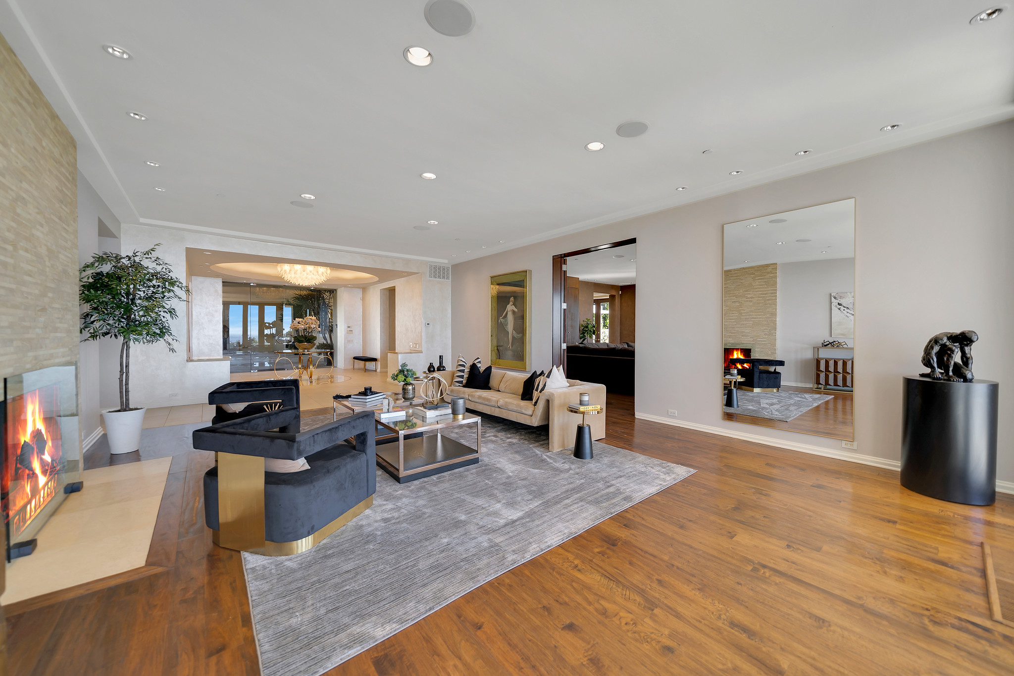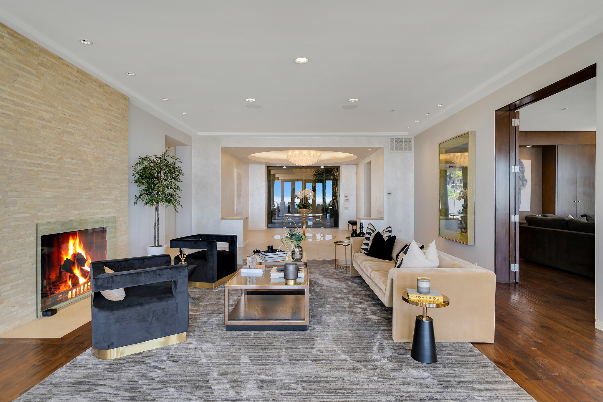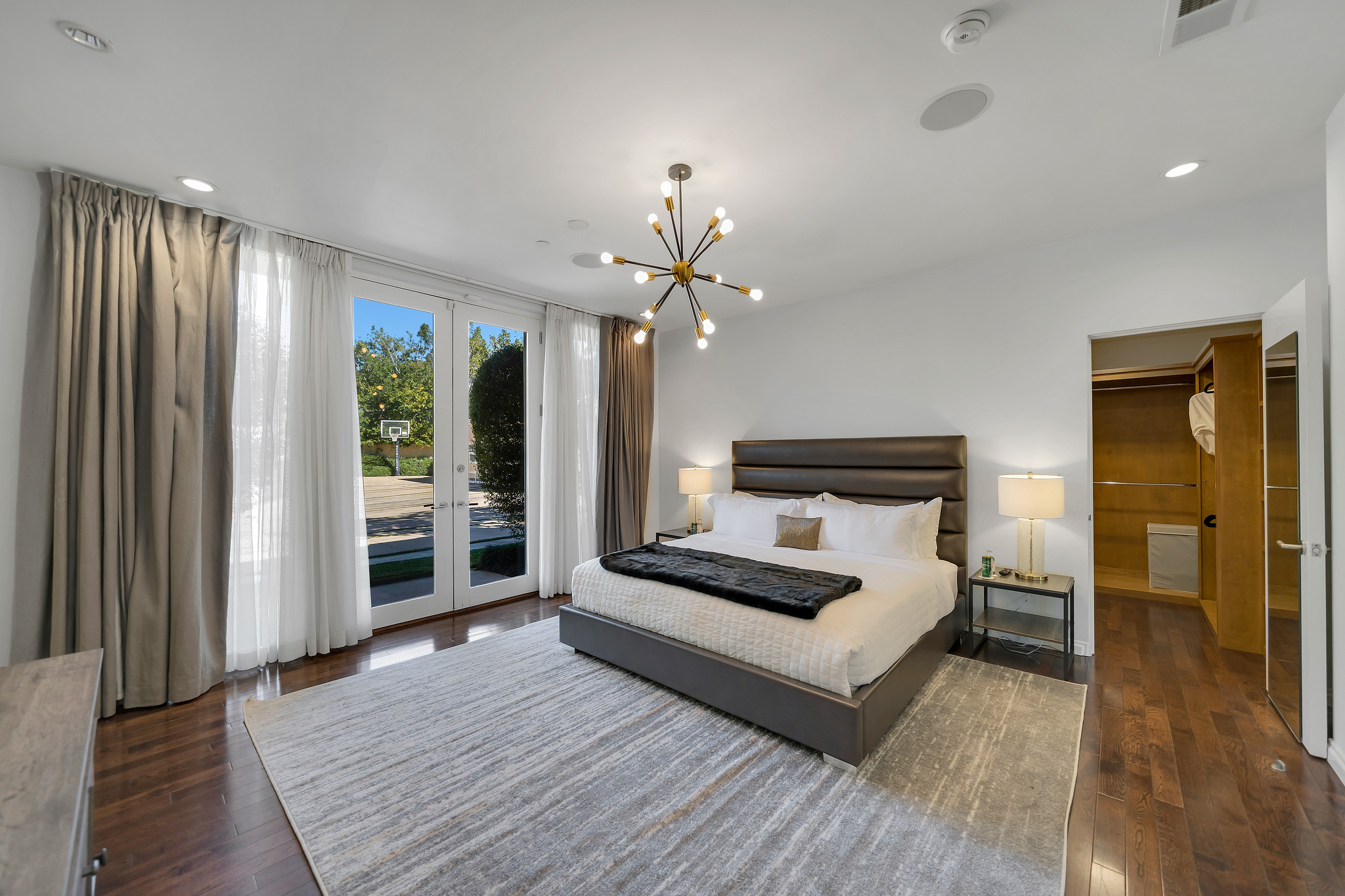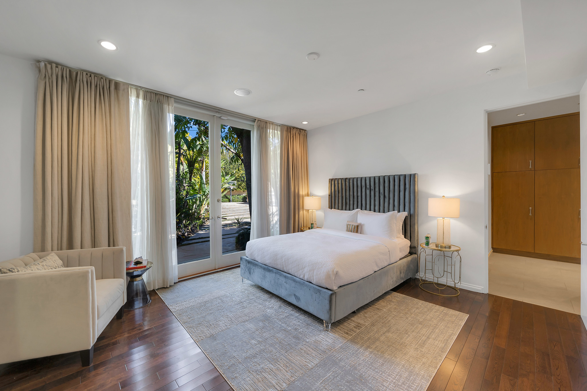With floor-to-ceiling glass French doors gracing much of the home, an abundance of natural light floods the interiors, creating a seamless blend of indoor and outdoor living that enhances the overall experience.