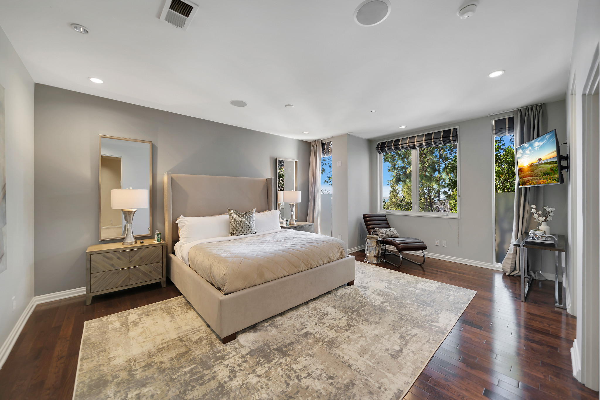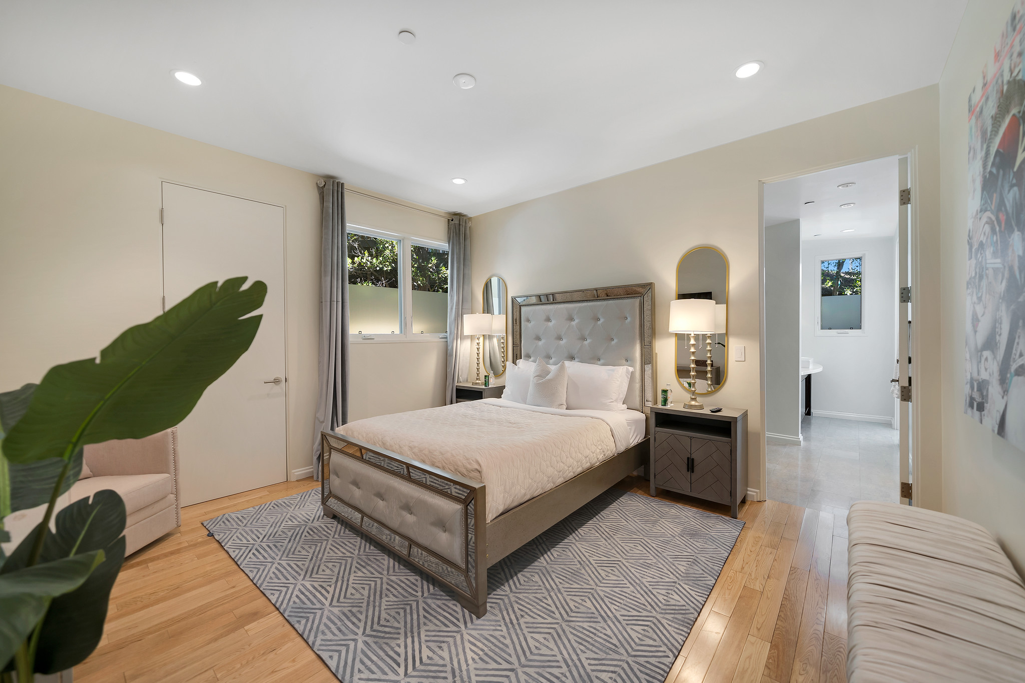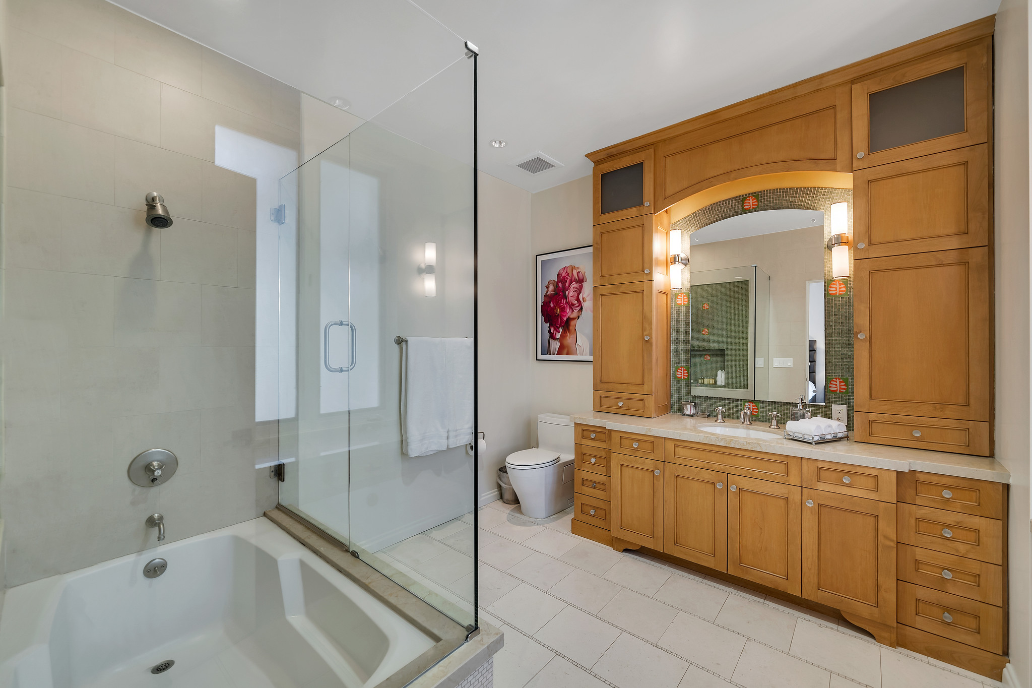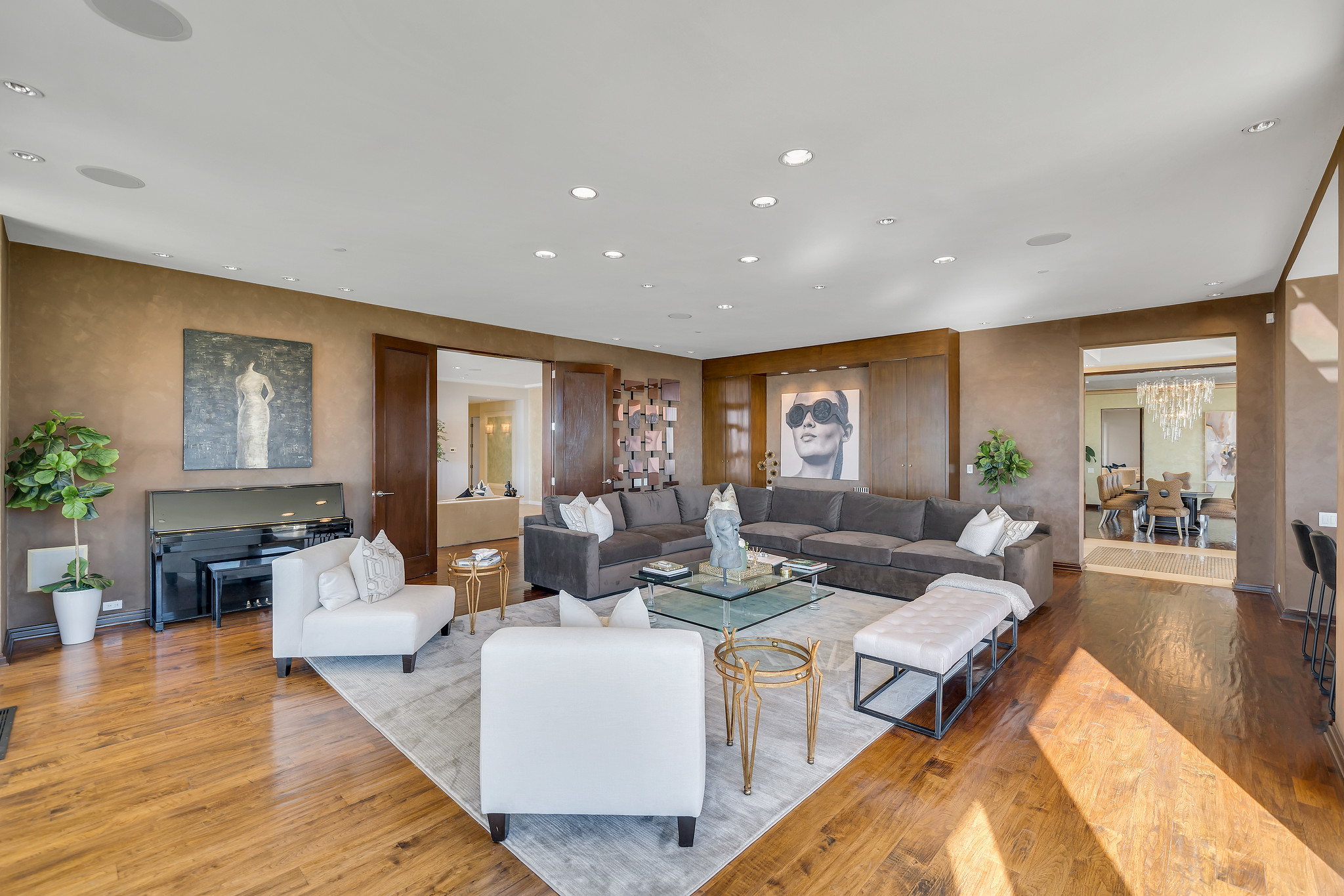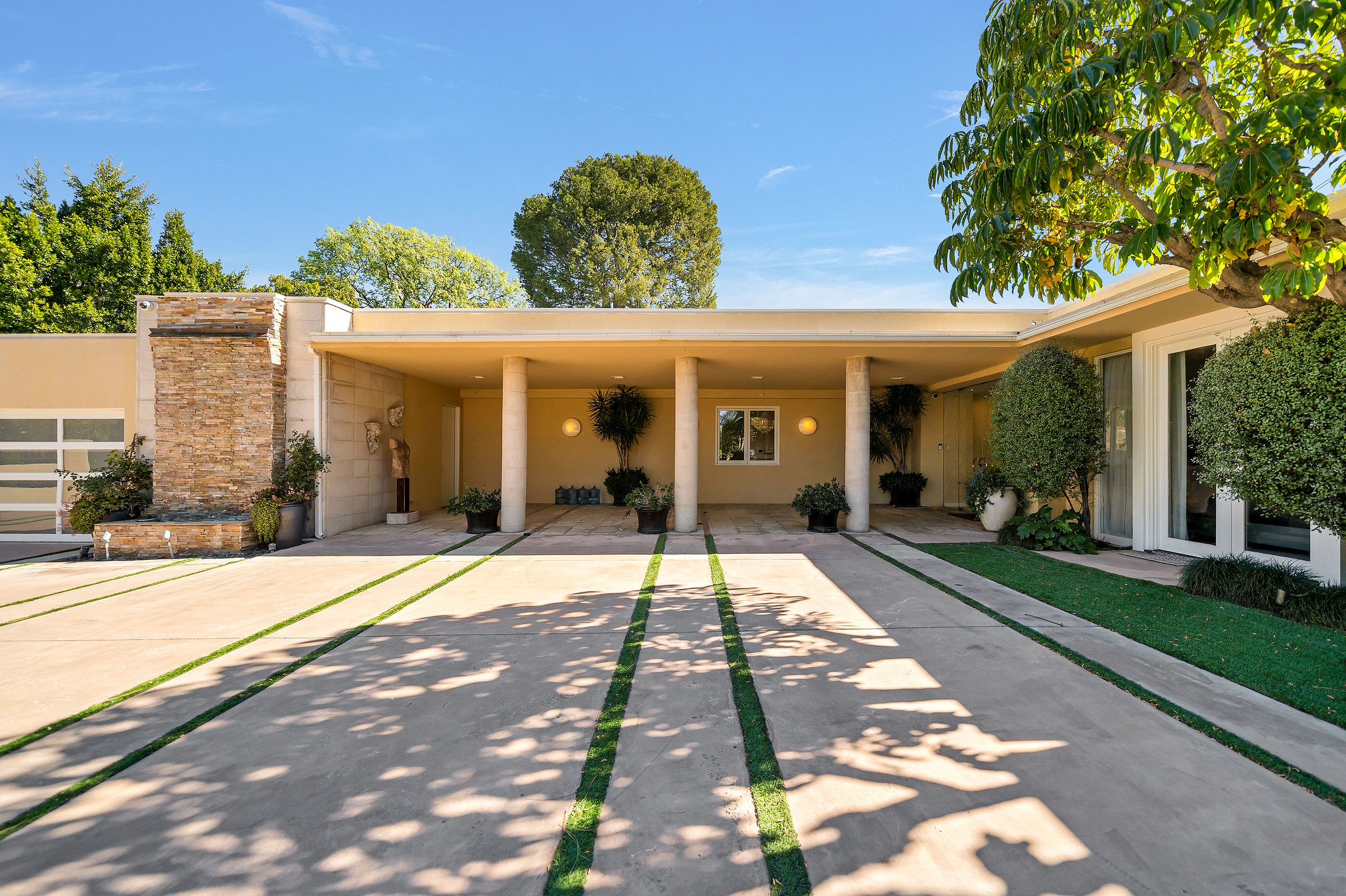 With floor-to-ceiling glass French doors gracing much of the home, an abundance of natural light floods the interiors, creating a seamless blend of indoor and outdoor living that enhances the overall experience.