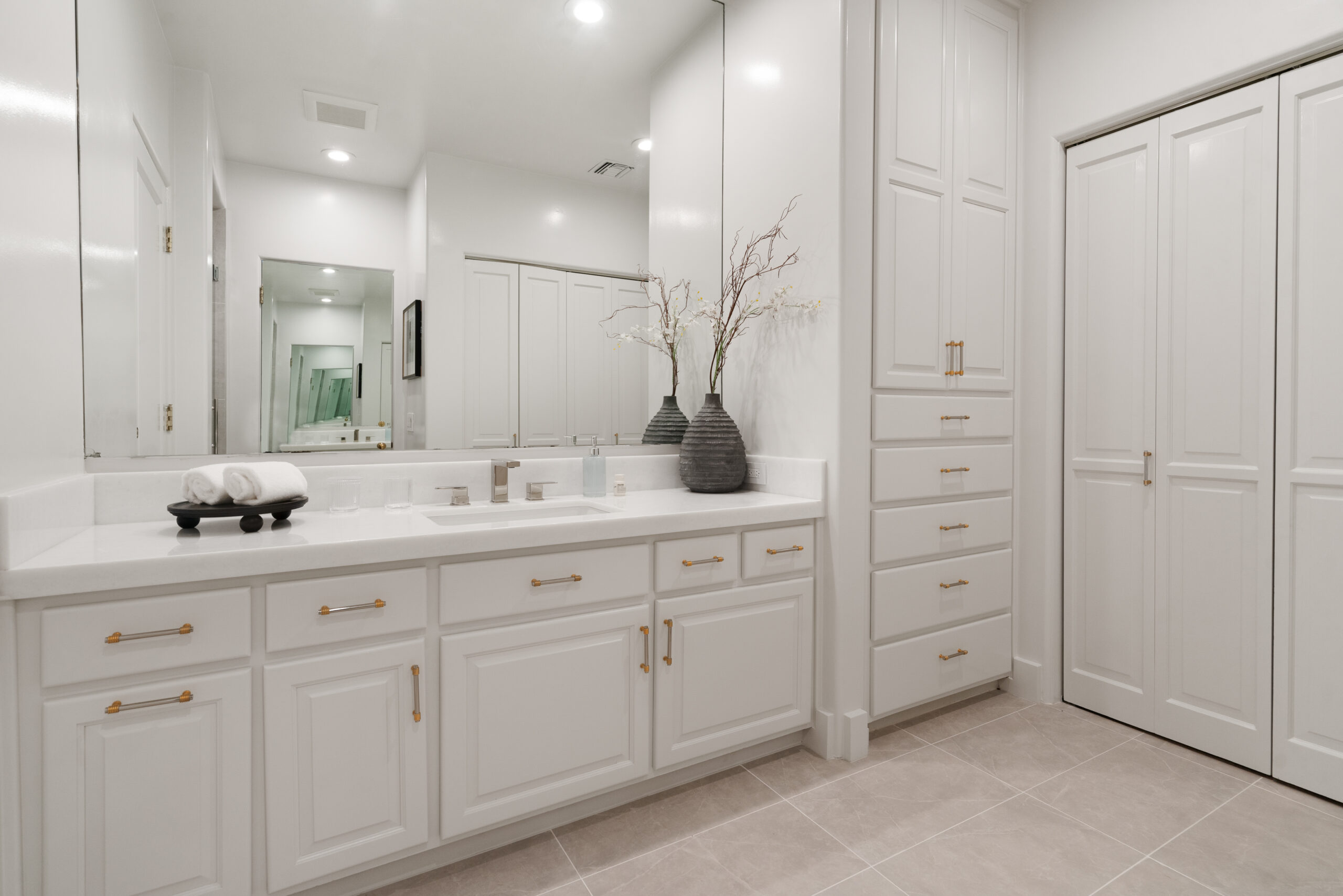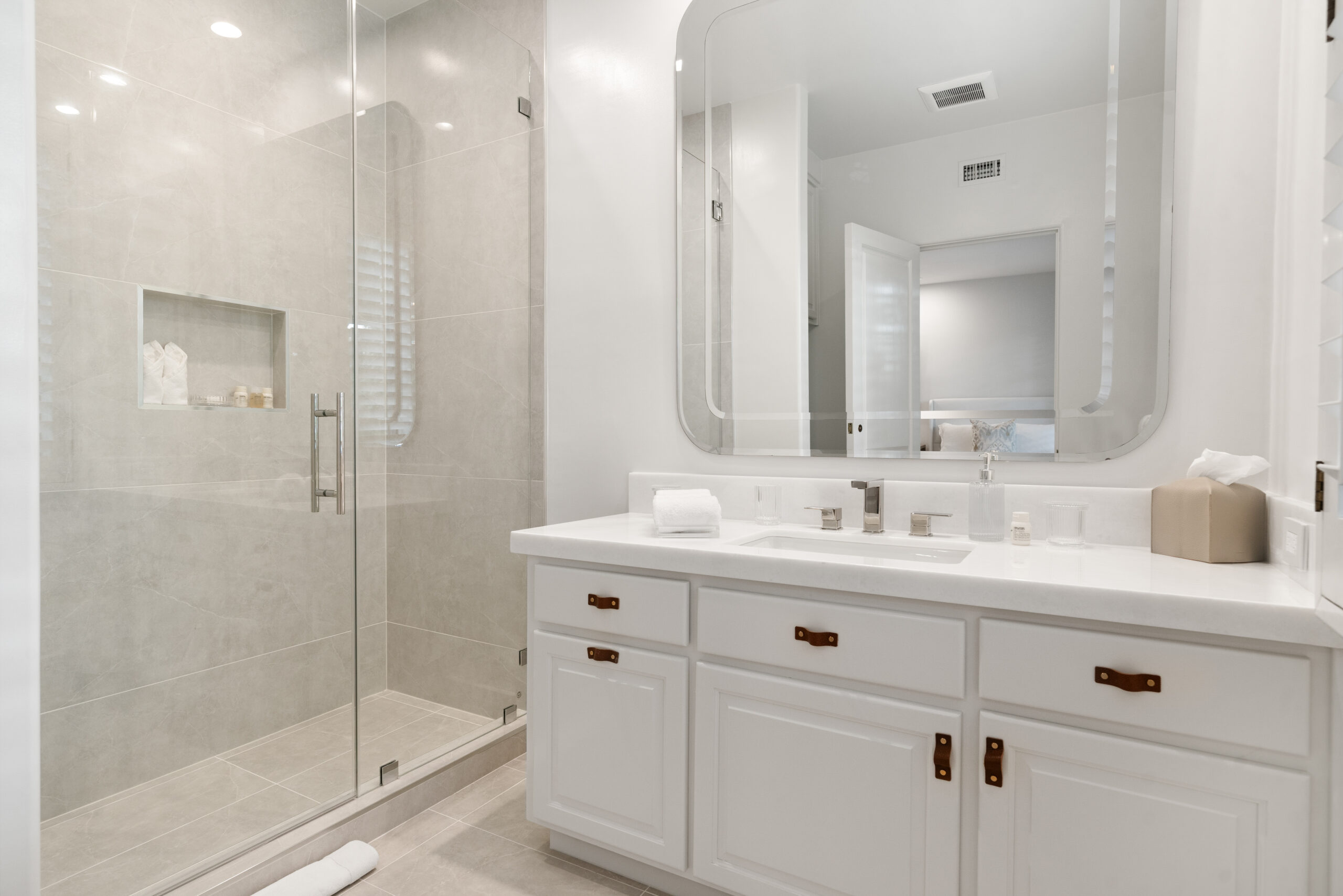 The expansive backyard is an entertainer’s dream, boasting a large patio, built-in barbecue, swimming pool, and spa—perfect for gatherings and relaxation. The luxurious primary suite on the first floor opens to the backyard through French doors and includes a generous bathroom and two oversized walk-in closets. Upstairs, you’ll find four additional bedrooms, each with ensuite bathrooms, including a versatile room that can serve as a second primary suite. The property also offers a gated motor court and an attached two-car garage for added convenience and privacy.
