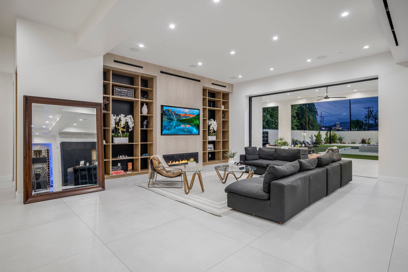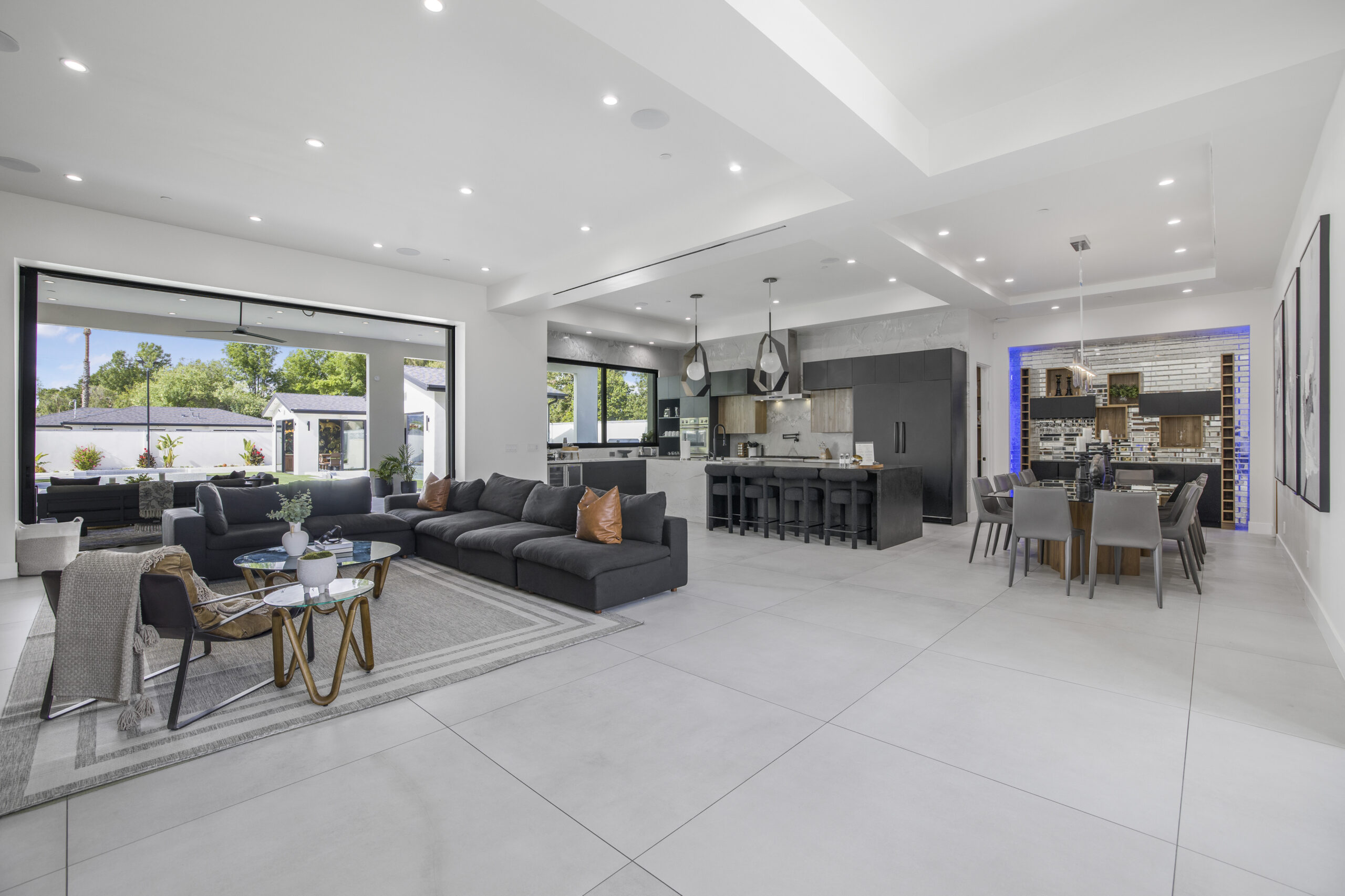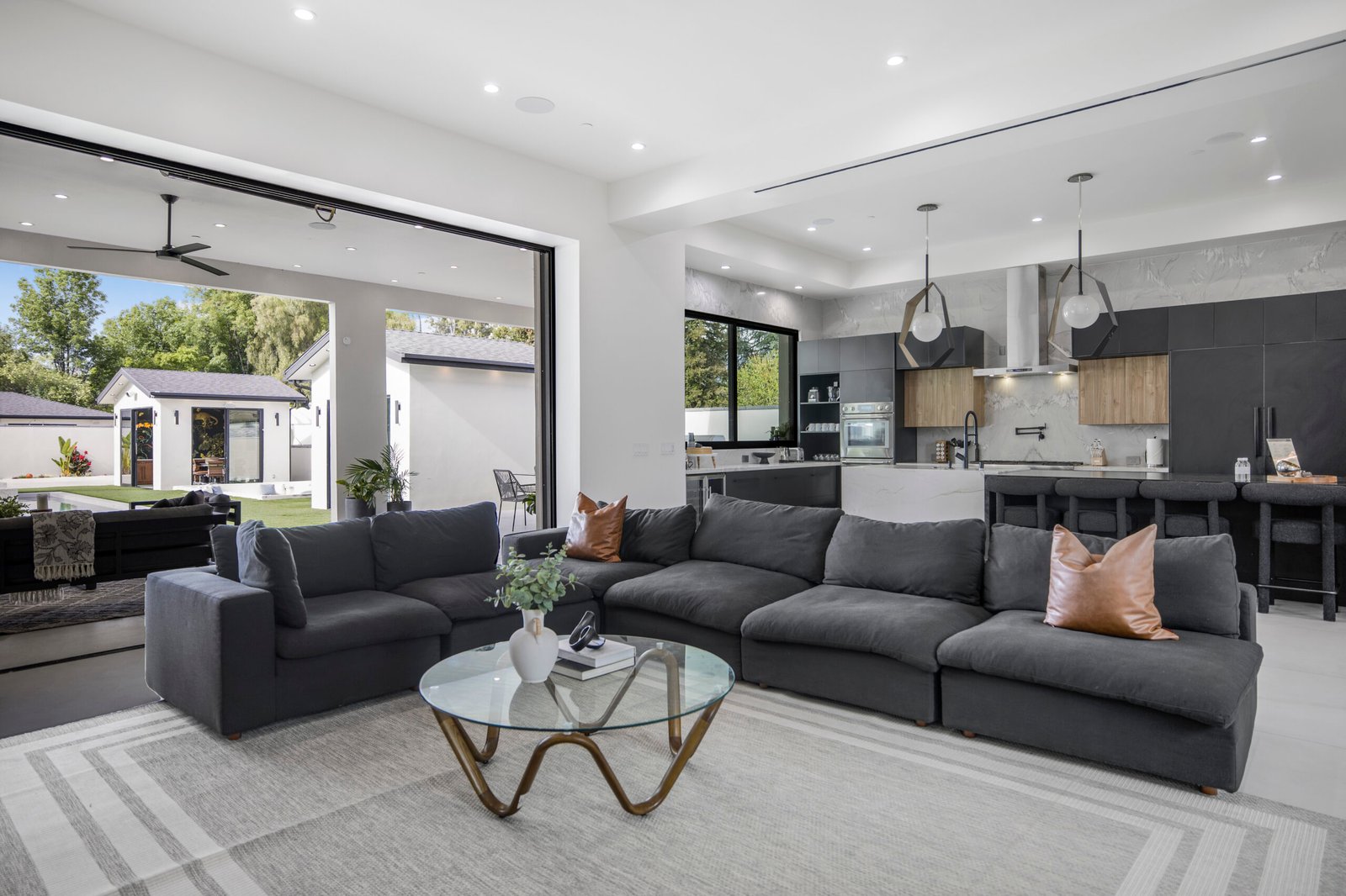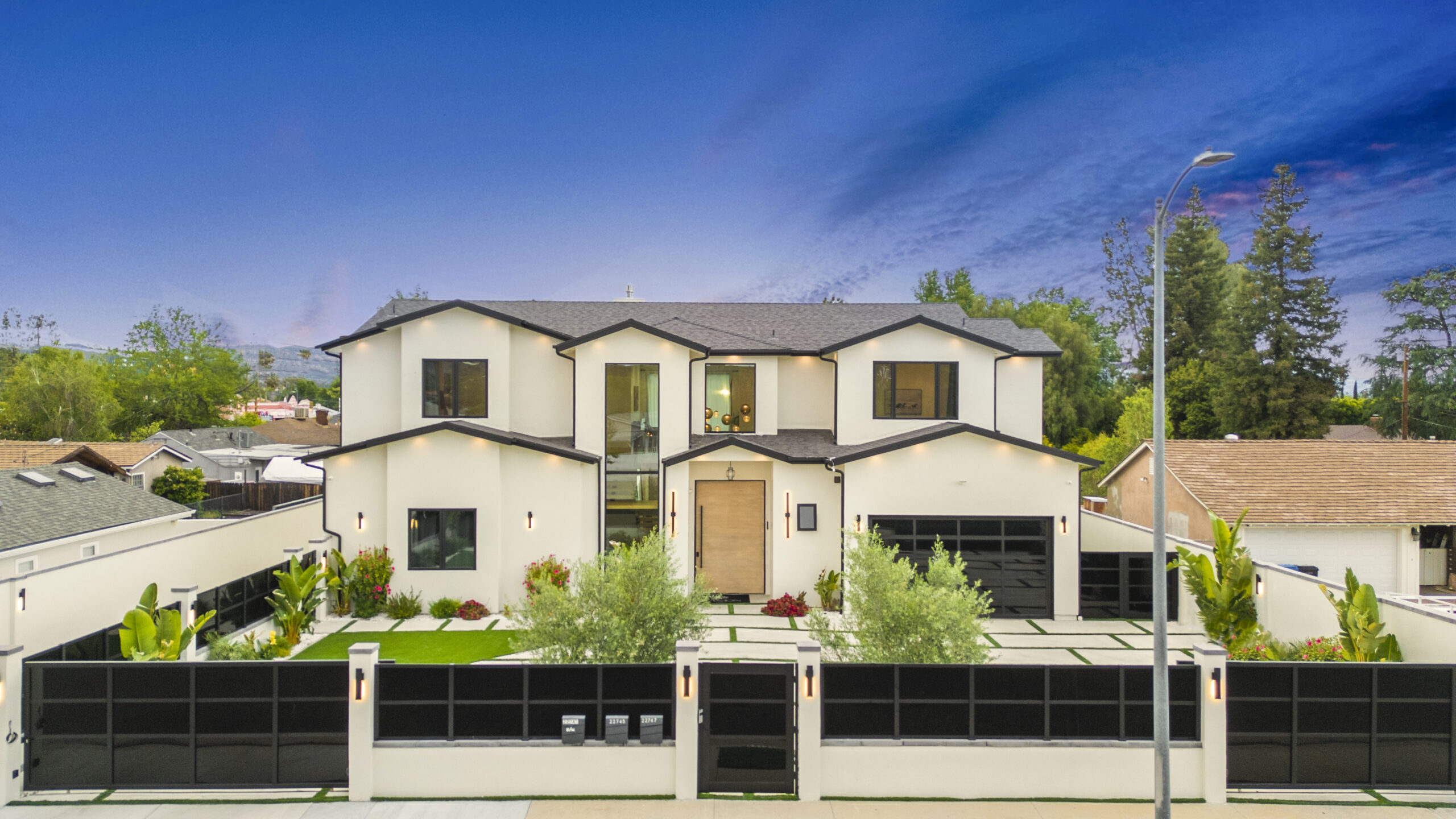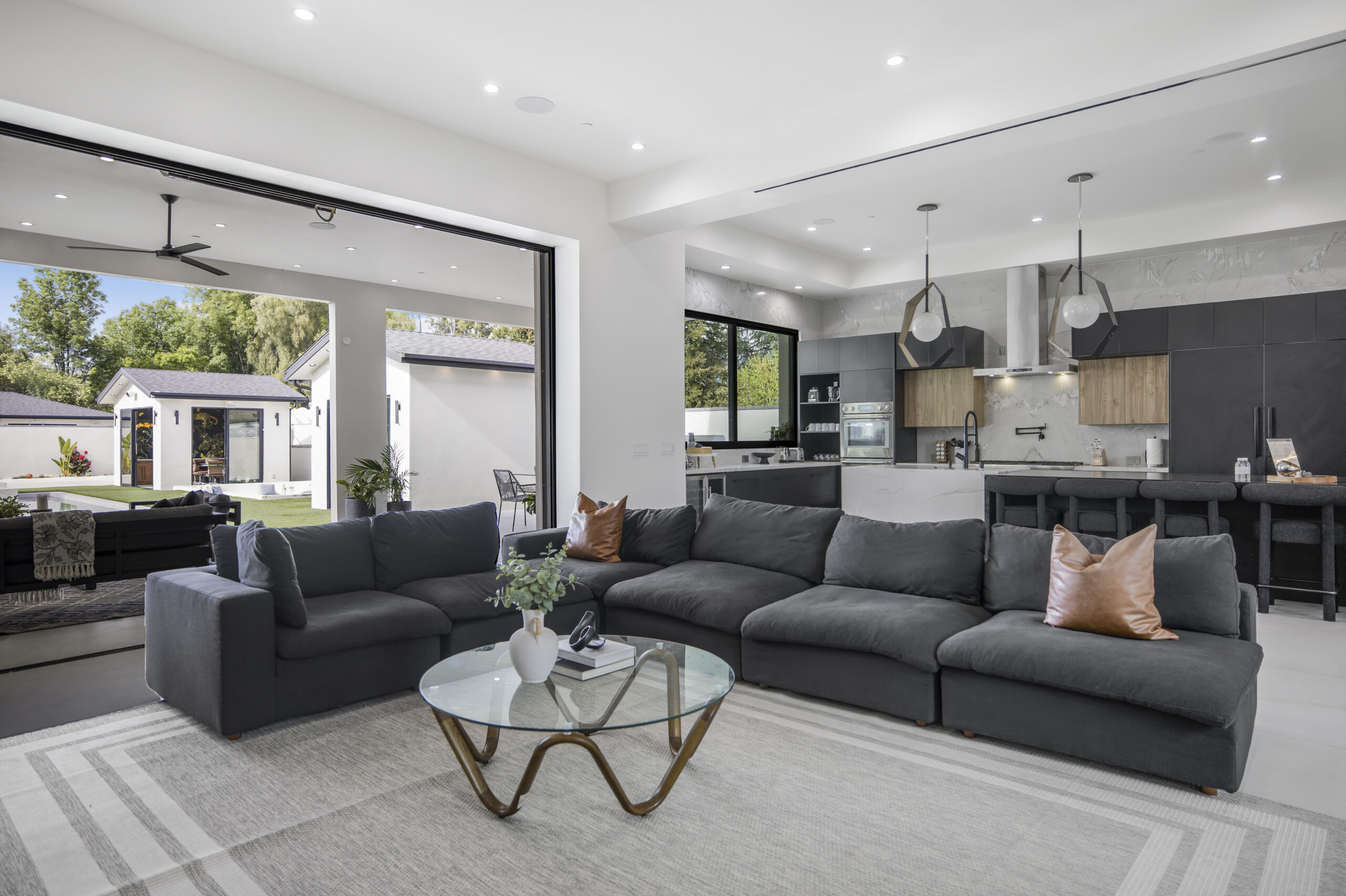 Experience the ultimate in luxury, privacy, and exceptional income potential with this newly built, gated estate. The grand main residence spans an impressive 6,387 sq. ft. and is complemented by two income-generating ADUs totaling 2,100 sq. ft.—a truly rare opportunity. Inside, you’ll find elegant interiors featuring soaring 12-foot ceilings, Venetian plaster walls, and a state-of-the-art Crestron smart home system. Enjoy cozy evenings by the fireplace or entertain guests in the private theater room, thoughtfully designed with plush seating for eight.