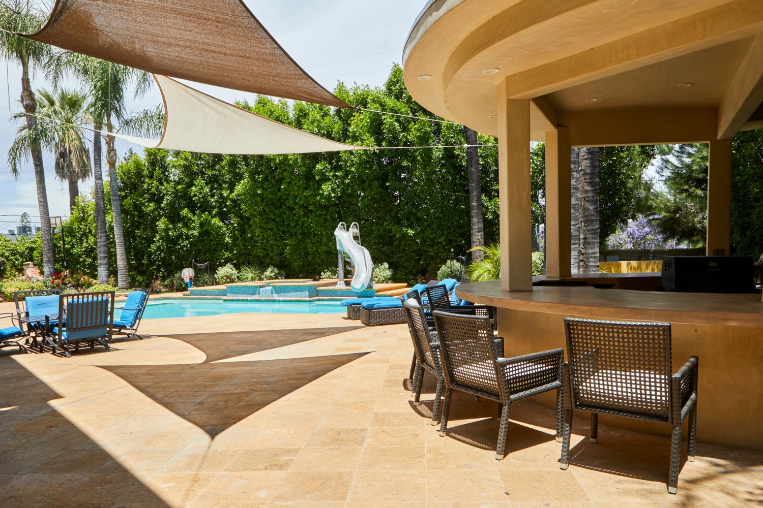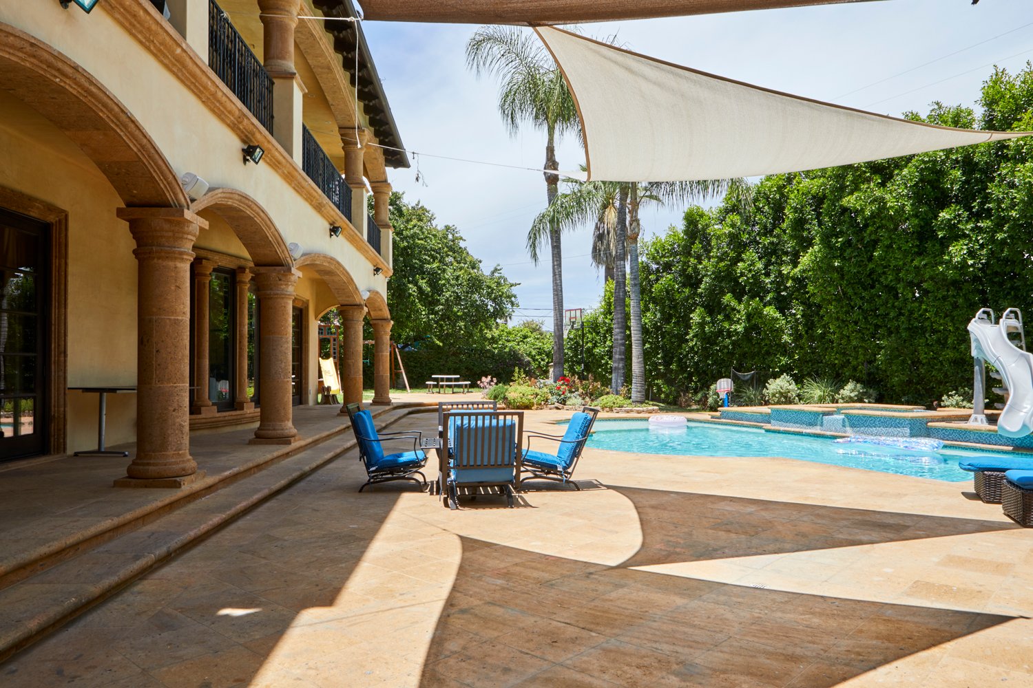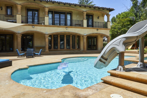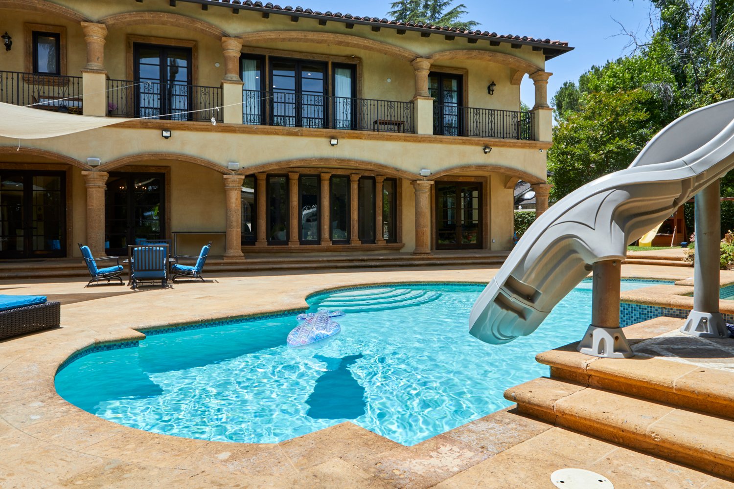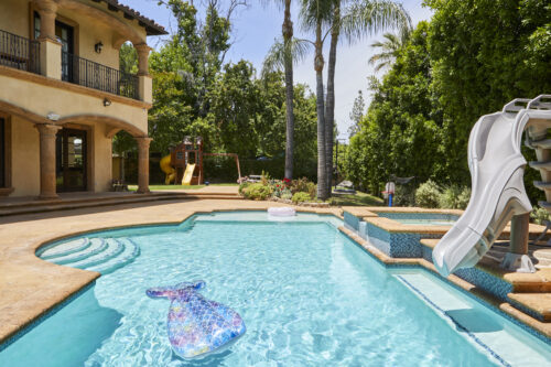 Featuring 7 spacious bedrooms and 8 elegant bathrooms, the residence is tucked away at the end of a peaceful cul-de-sac, just moments from Ventura Boulevard. The expansive open floor plan boasts soaring ceilings, a private theater room, a dedicated office space, and a modern, fully equipped kitchen perfect for entertaining. The expansive master suite serves as a tranquil retreat, complete with a cozy sitting area, custom walk-in closets, and a spa-inspired bathroom featuring dual sinks, a vanity, a walk-in shower, and a separate soaking tub. Outside, the generous backyard is a private oasis, showcasing a large pool with a fun slide, a relaxing Jacuzzi, and a playset, perfect for both relaxation and family fun.
