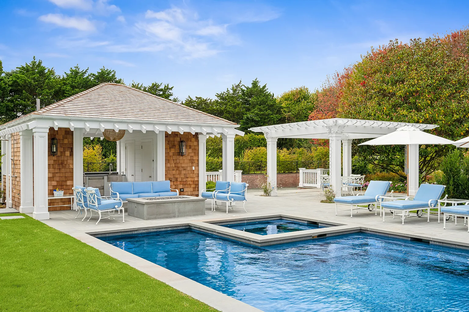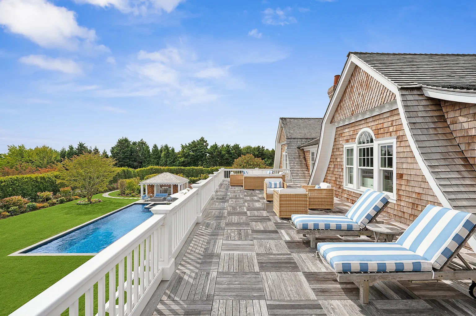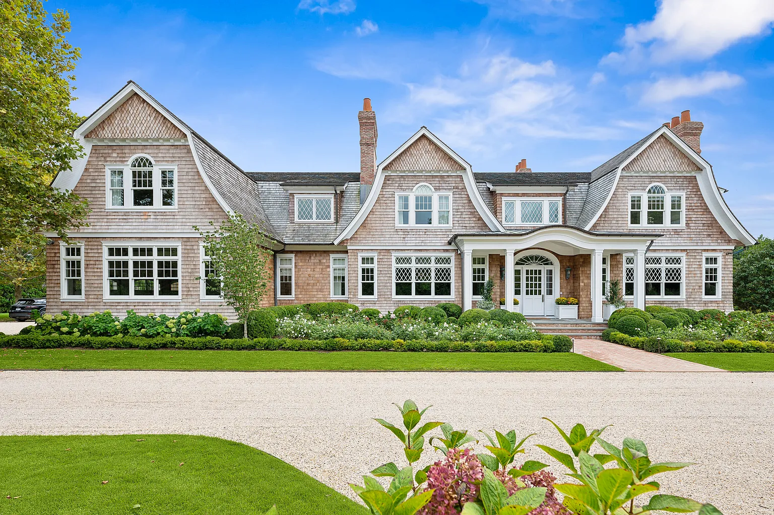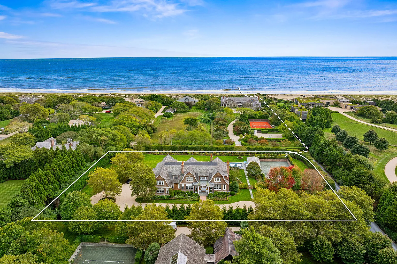 This prestigious Further Lane estate spans over 2 acres and features a 9,795 SF home with 10 bedrooms and 10 full plus 2 half bathrooms. Recently expanded with elegant architectural details, the residence offers seamless indoor-outdoor living with NanaWalls that open to a covered porch, a 55′ heated gunite pool with spa, and a stylish pool/tennis house complete with an outdoor kitchen and bathroom. Additional amenities include an outdoor grill adjacent to the main kitchen, mature gardens, hornbeam hedges, and landscape lighting throughout.