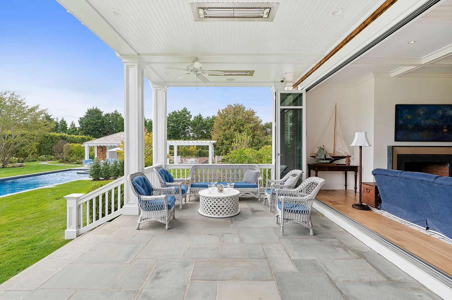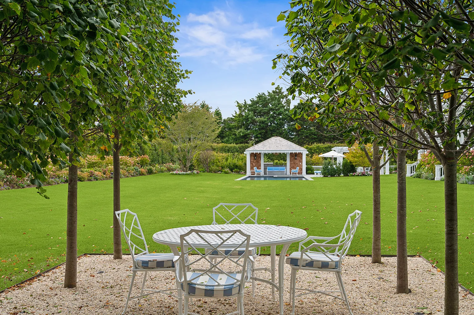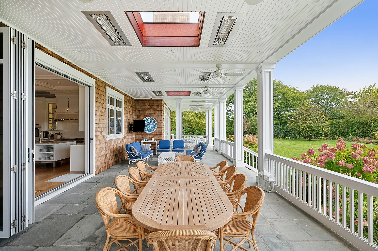 This prestigious Further Lane estate spans over 2 acres and features a 9,795 SF home with 10 bedrooms and 10 full plus 2 half bathrooms. Recently expanded with elegant architectural details, the residence offers seamless indoor-outdoor living with NanaWalls that open to a covered porch, a 55′ heated gunite pool with spa, and a stylish pool/tennis house complete with an outdoor kitchen and bathroom. Additional amenities include an outdoor grill adjacent to the main kitchen, mature gardens, hornbeam hedges, and landscape lighting throughout.