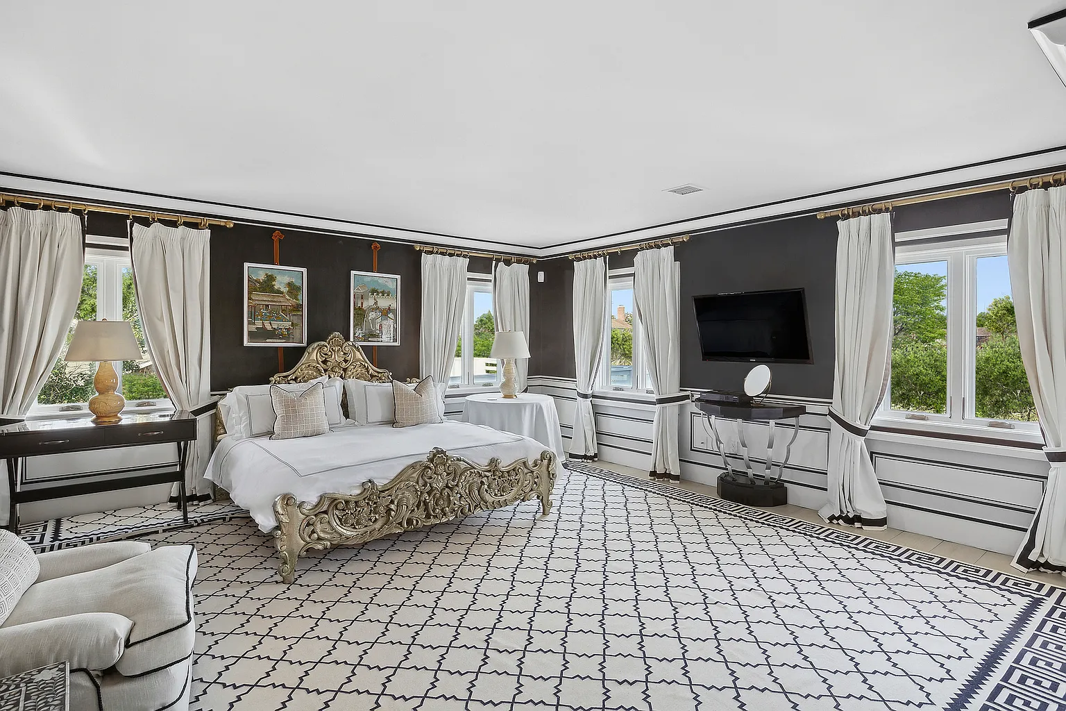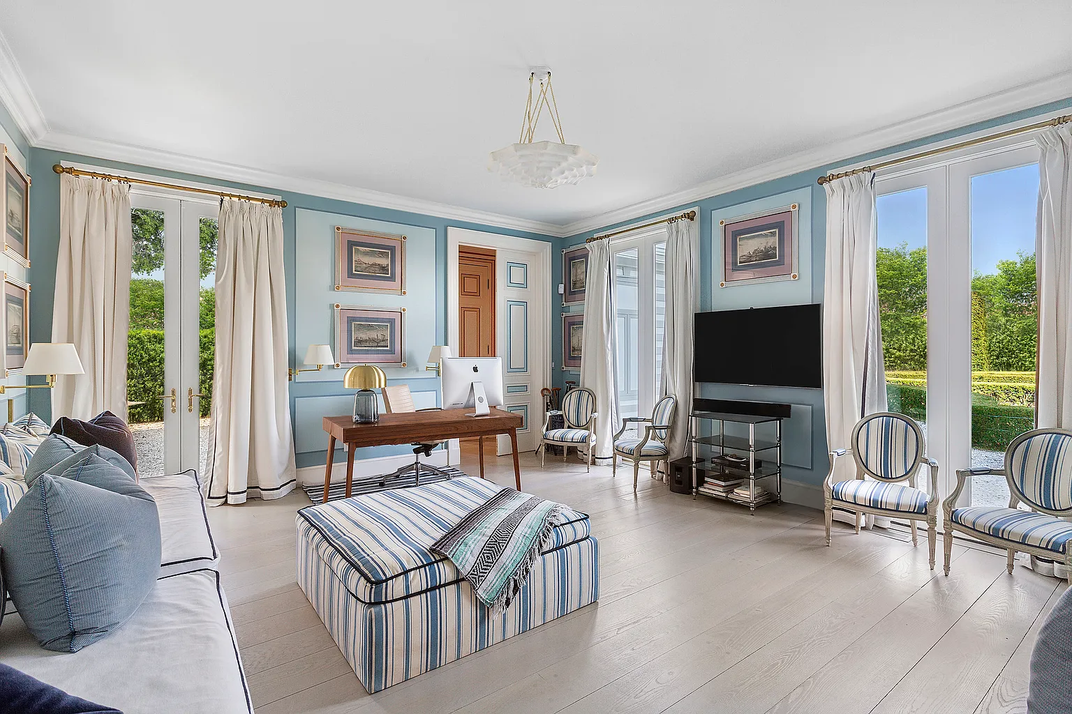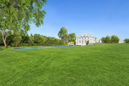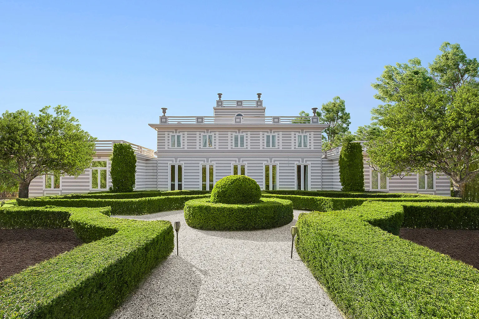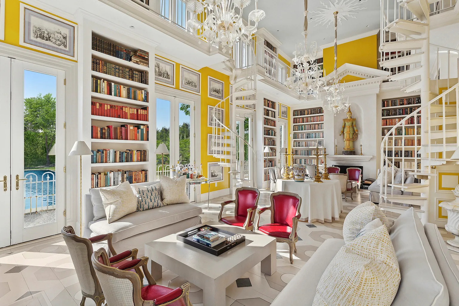 Covering over 7,500 square feet, this remarkable estate boasts eight elegantly designed bedrooms, six full bathrooms, and four powder rooms. Inspired by the stunning Lazienki Palace in Warsaw, Poland, this home masterfully combines timeless elegance with contemporary sophistication. Nestled on 1.5 meticulously landscaped acres, the property is accessed through a gated entrance, revealing a stunning 90-foot reflecting pond and a beautifully crafted English garden. The estate is a collaboration of acclaimed architect Peter Cook, renowned builder RLW, and celebrated designer Thomas Britt, showcasing exceptional craftsmanship and design expertise throughout. The open living spaces are impeccably decorated, offering sweeping views of the expansive grounds.