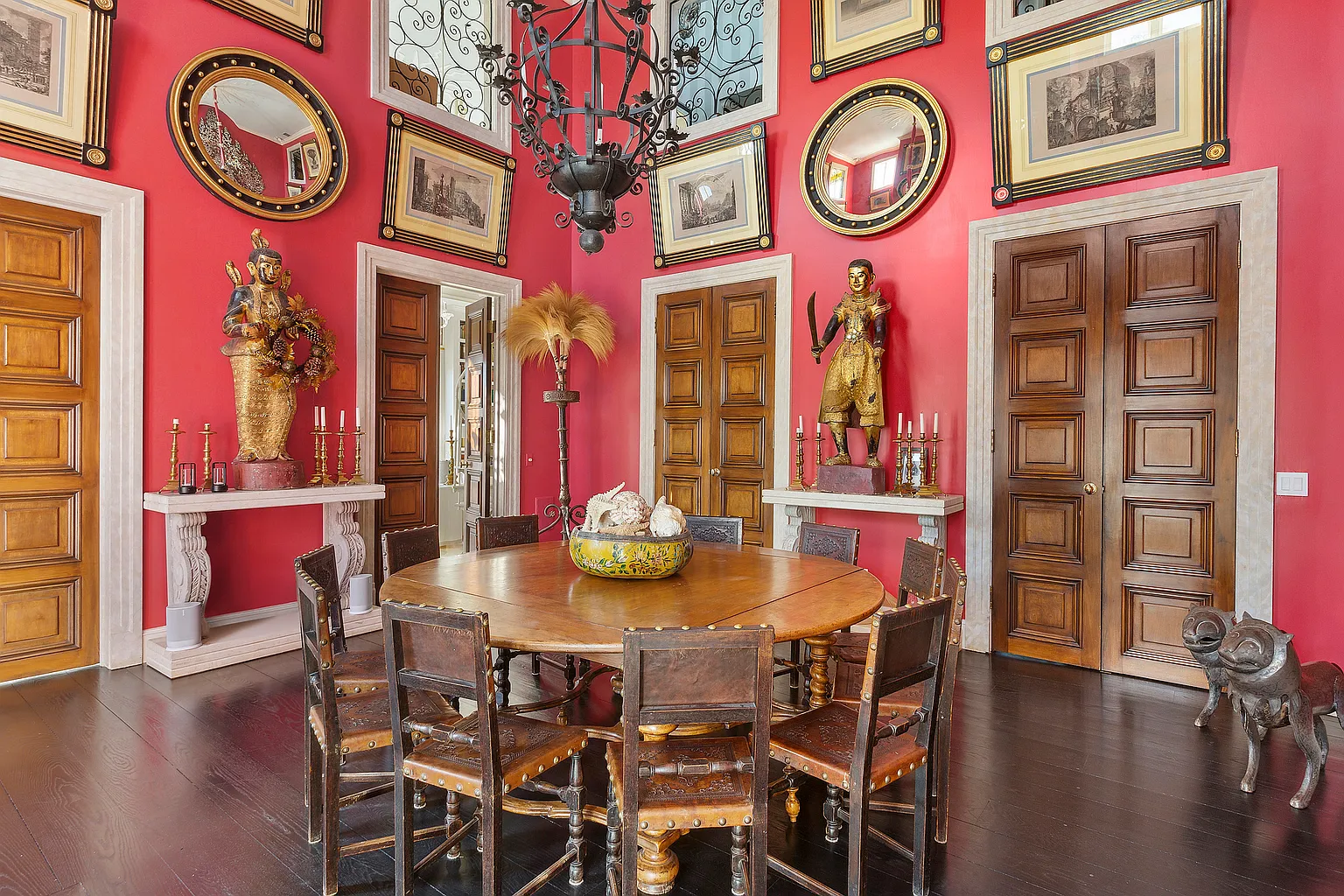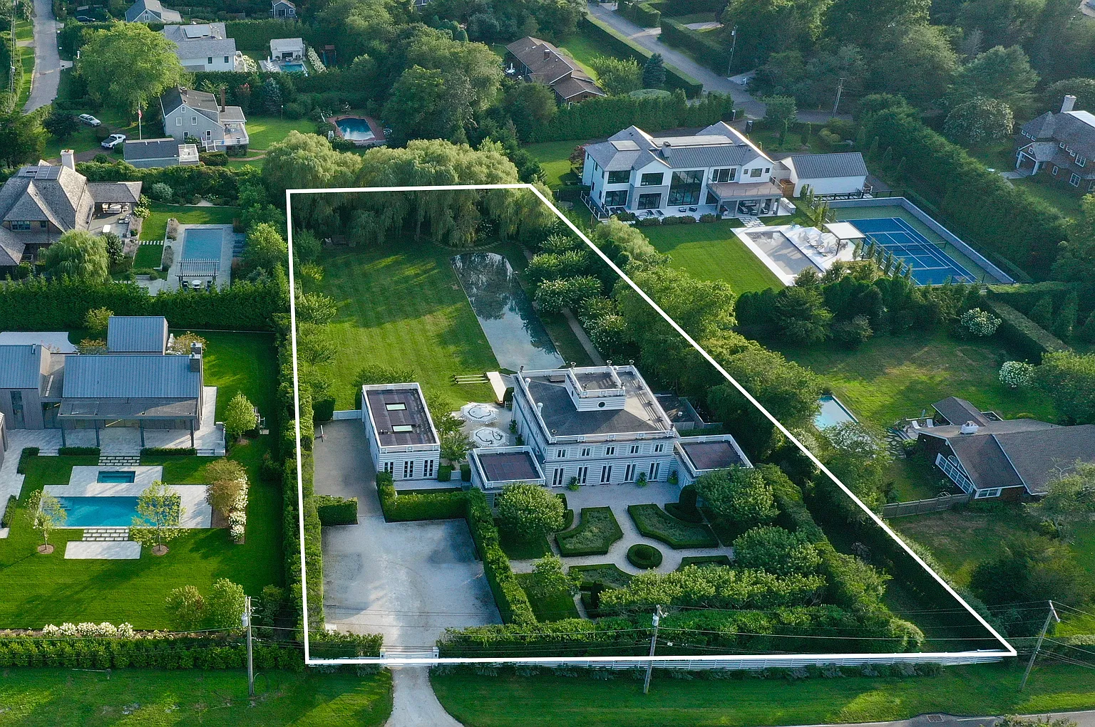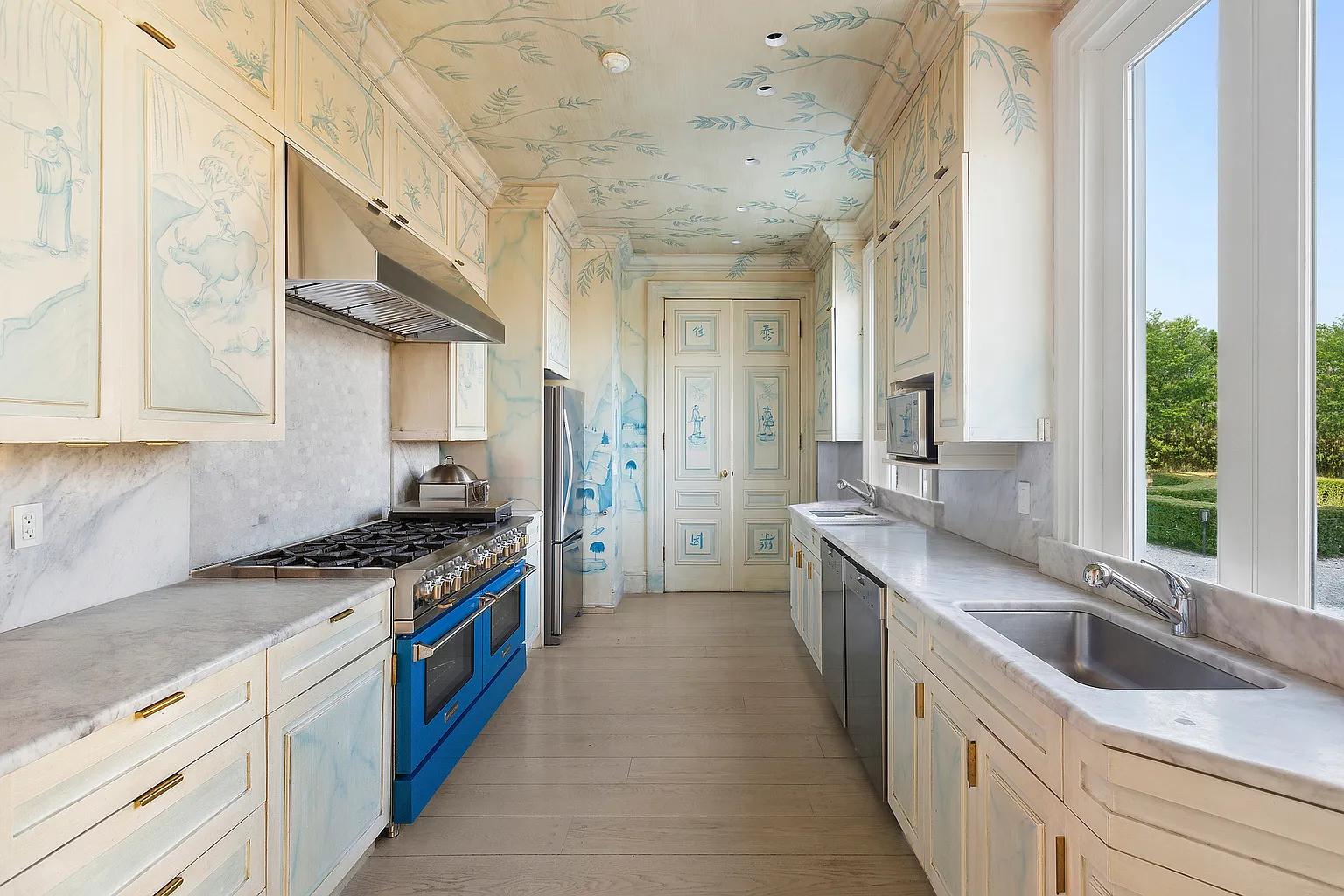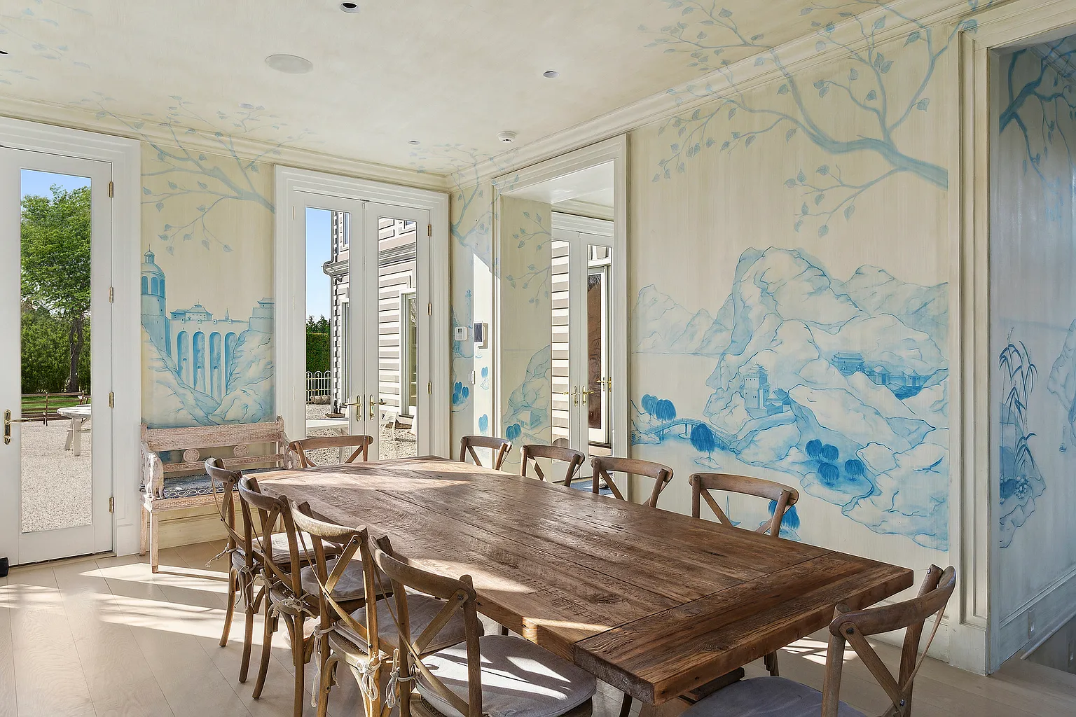 Covering over 7,500 square feet, this remarkable estate boasts eight elegantly designed bedrooms, six full bathrooms, and four powder rooms. Inspired by the stunning Lazienki Palace in Warsaw, Poland, this home masterfully combines timeless elegance with contemporary sophistication. Nestled on 1.5 meticulously landscaped acres, the property is accessed through a gated entrance, revealing a stunning 90-foot reflecting pond and a beautifully crafted English garden. The estate is a collaboration of acclaimed architect Peter Cook, renowned builder RLW, and celebrated designer Thomas Britt, showcasing exceptional craftsmanship and design expertise throughout. The open living spaces are impeccably decorated, offering sweeping views of the expansive grounds.