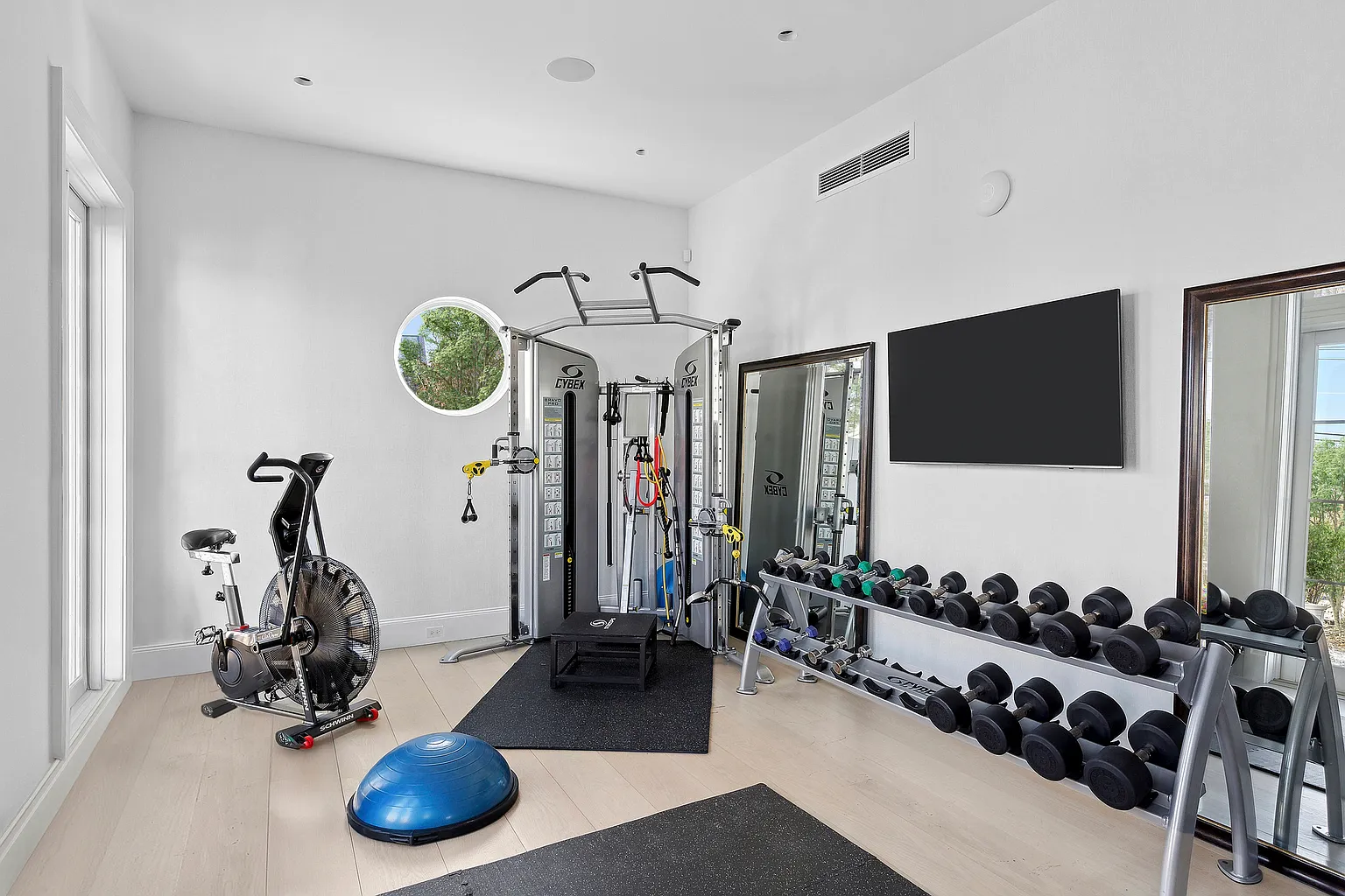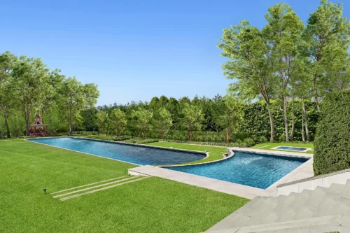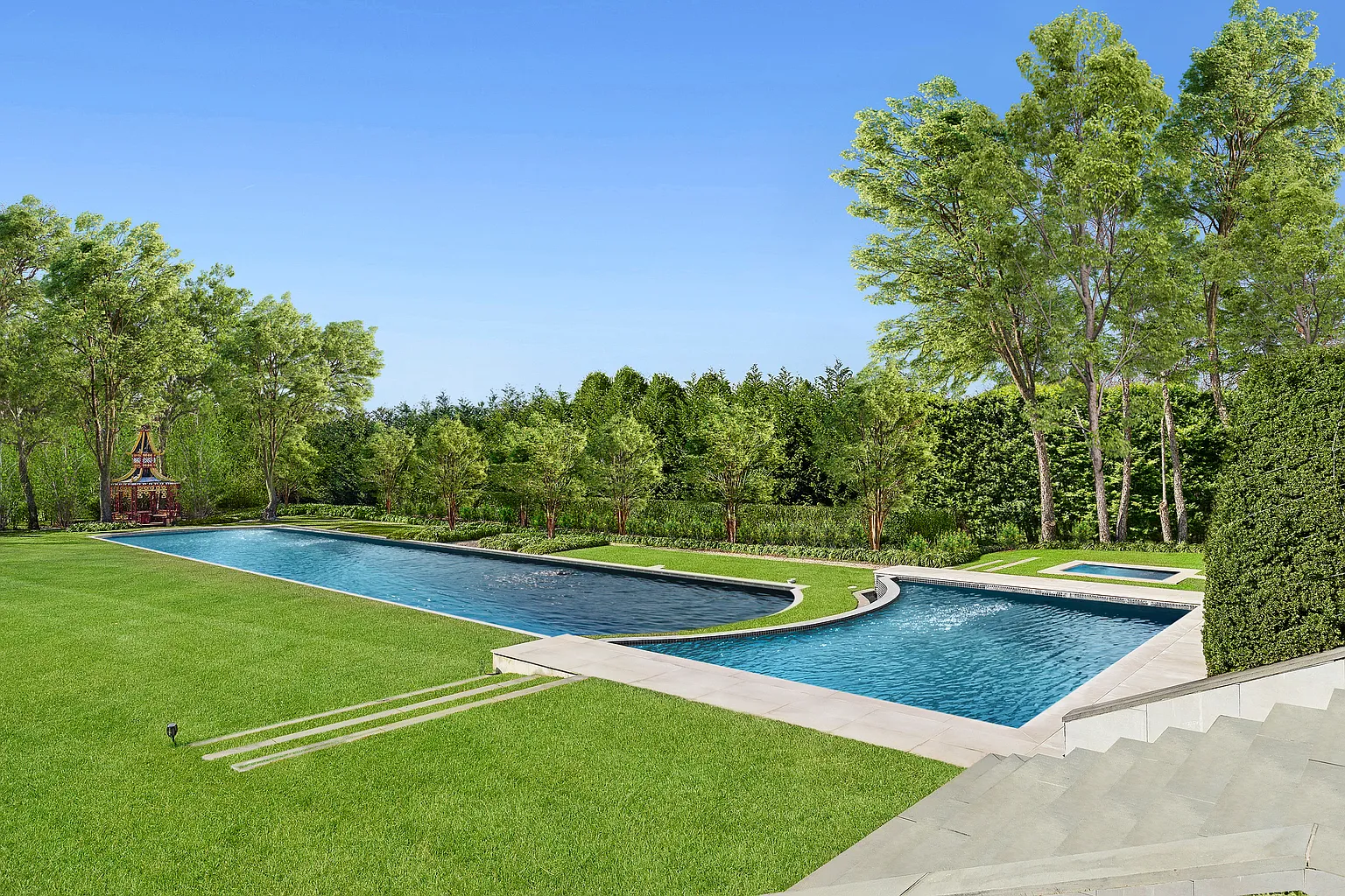 The outdoor areas are equally inviting, featuring a heated gunite pool and an 8-by-8-foot spa for ultimate relaxation. The breathtaking reflecting pond serves as a centerpiece, surrounded by lush lawns and thoughtfully designed outdoor living and dining spaces, perfect for al fresco entertaining. Enhancing the estate’s appeal is a 1,000-square-foot detached three-car garage, which includes a fully equipped gym, a bathroom, and a lower-level bedroom, striking a perfect balance between luxury and practicality. The parking court accommodates eight to ten vehicles, making it ideal for guests. This private retreat provides a serene escape, situated south of the highway, embodying modern convenience alongside unparalleled sophistication.