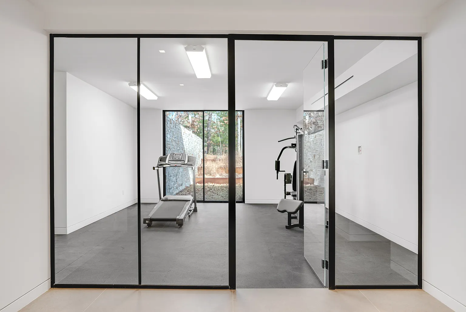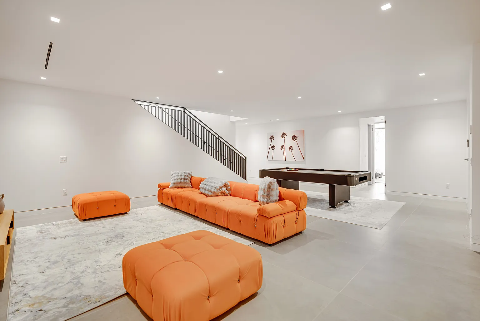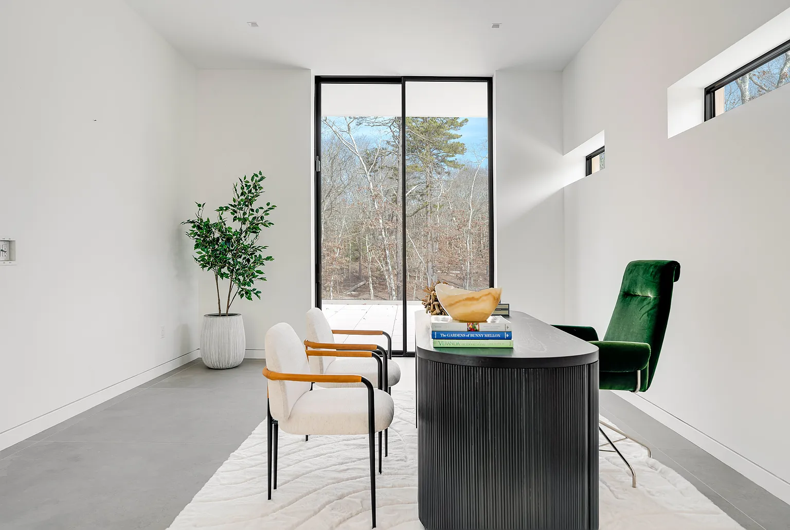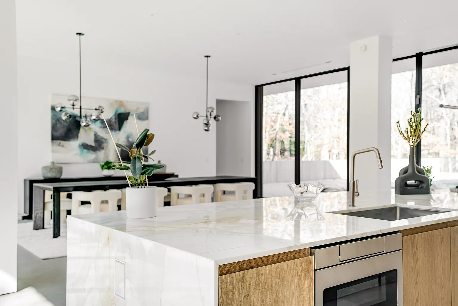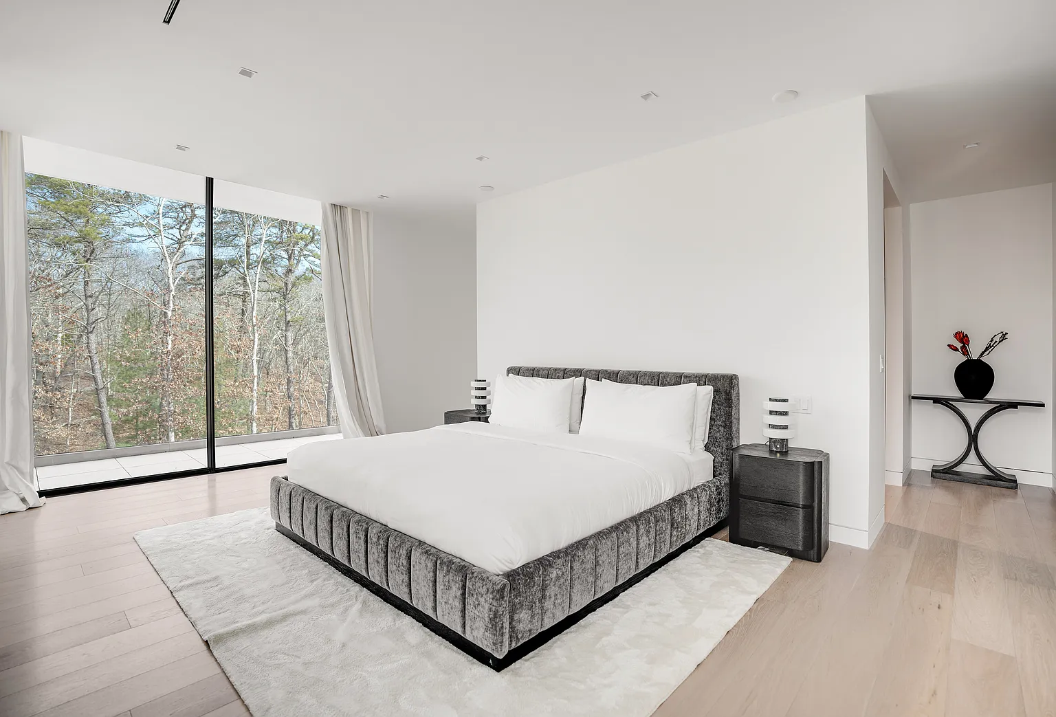 Discover a breathtaking modern residence nestled amidst lush greenery. This expansive 10,585-square-foot home features open, airy layouts that are bathed in natural light. With sliding glass doors that fully retract, the interior seamlessly blends with the outdoors, providing tranquil views from every angle.