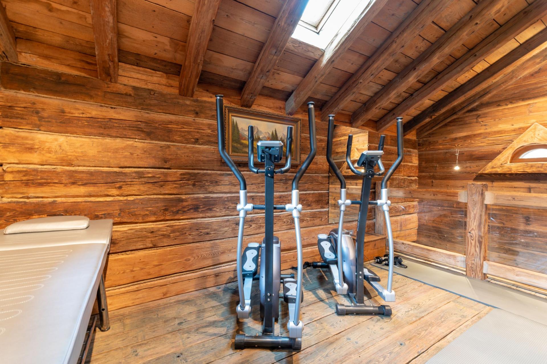 The first floor boasts two double bedrooms with a large south-facing terrace, offering breathtaking mountain views, along with a children’s bedroom accommodating five, complete with its own bathroom. A sauna for six is also available on this level. On the second floor, you’ll find a spacious dining room and a fully equipped American kitchen, alongside a living room with expansive bay windows and a grand fireplace, ideal for cozy evenings. The third floor features a majestic master bedroom with three bay windows and two balconies, accompanied by a luxurious bathroom with dual sinks carved from natural stone, a walk-in shower, and a bathtub with stunning peak views. Finally, the fourth floor includes a gym with a massage table and a relaxation room to unwind after your workout.
