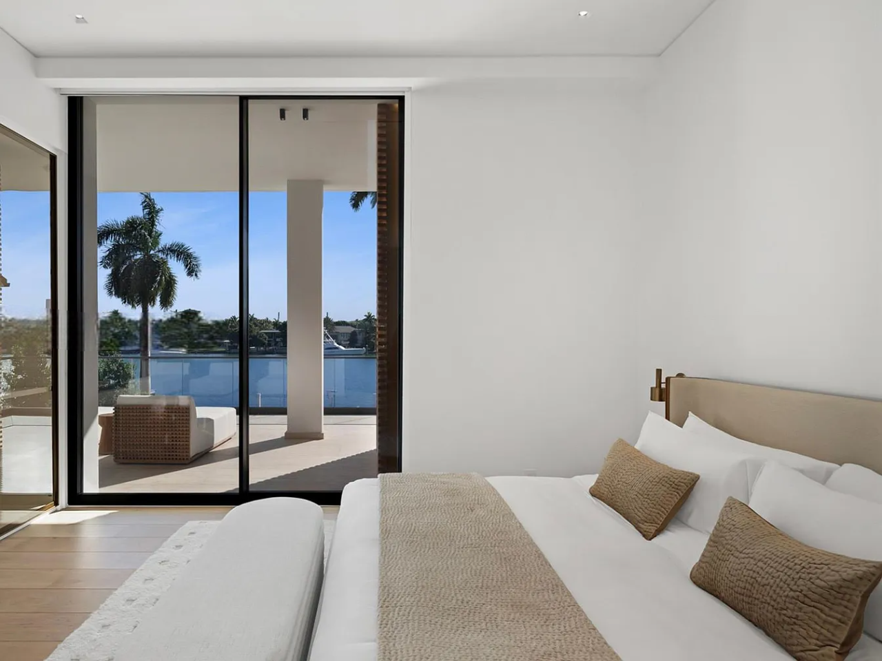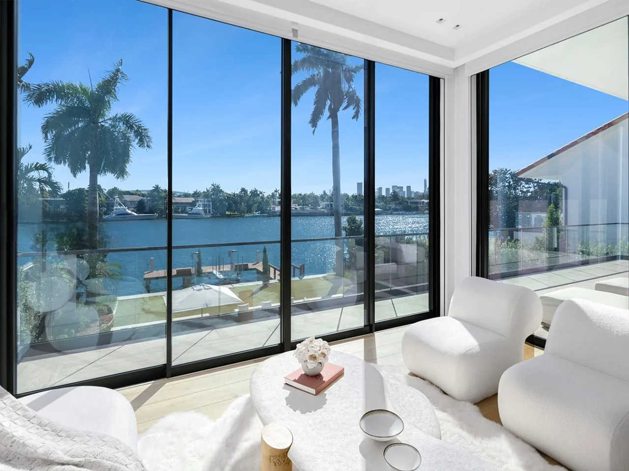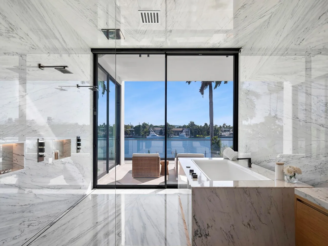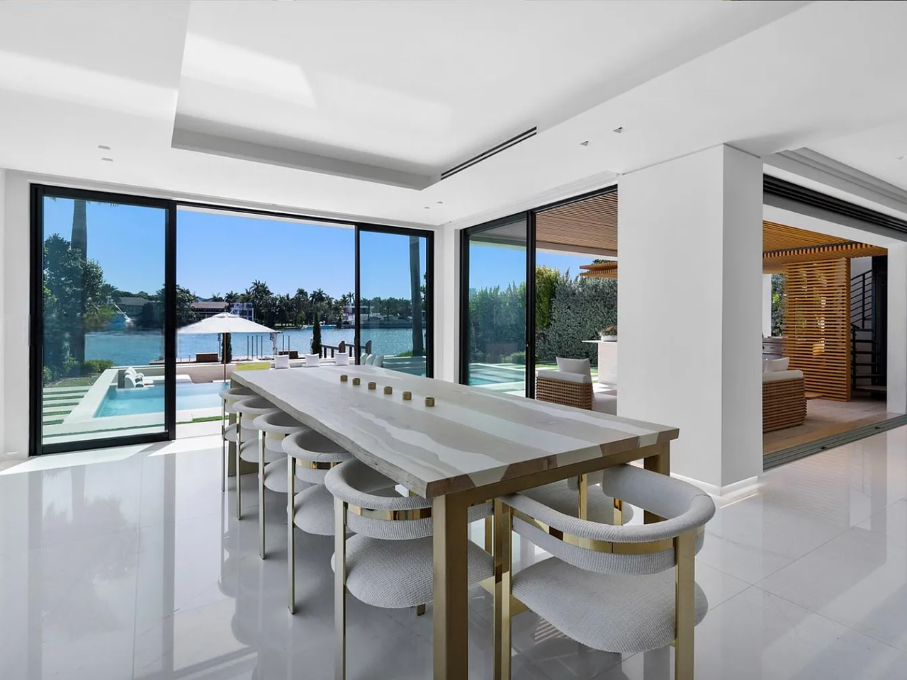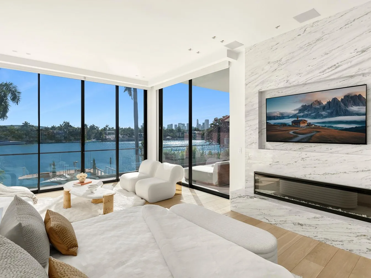 Welcome to this stunning modern home on gated Hibiscus Island, where exceptional design meets breathtaking downtown views. The impressive 23-foot steel door opens to a waterfront salon, beautifully illuminated by telescopic glass, complete with a cozy fireplace and sleek lighting. The culinary space is a chef’s dream, featuring marble and fluted oak finishes, a hosting island, a wine wall, and a bright dining area. A floating staircase leads to an office and four elegantly appointed suites with oak flooring. The primary suite is a true retreat, boasting two sitting lounges, a grand dressing room, a midnight bar, and a luxurious marble-clad bath that opens to an expansive terrace showcasing skyline vistas.