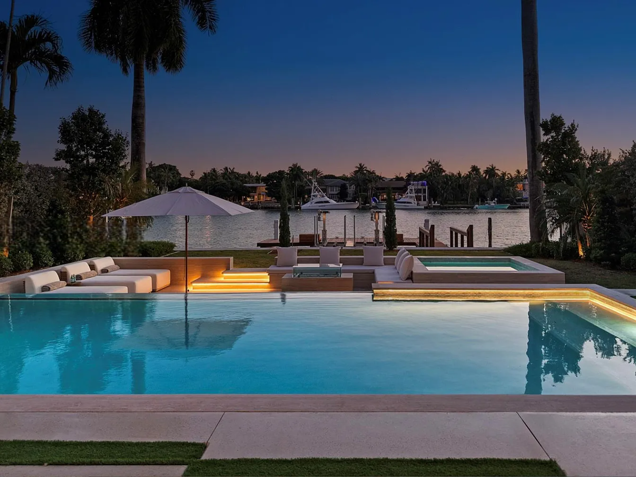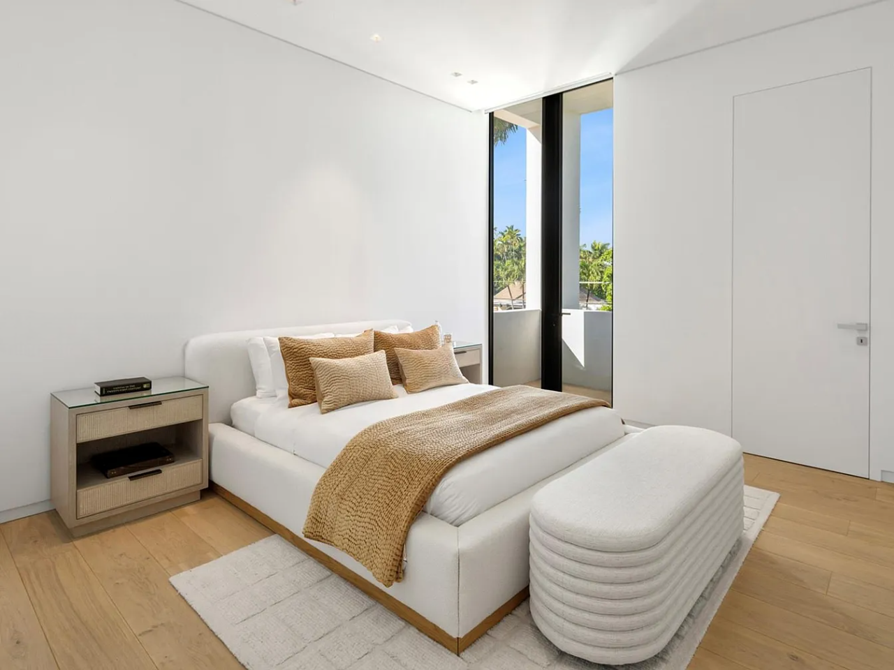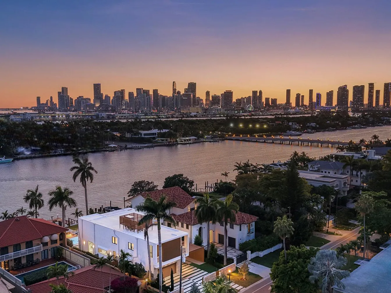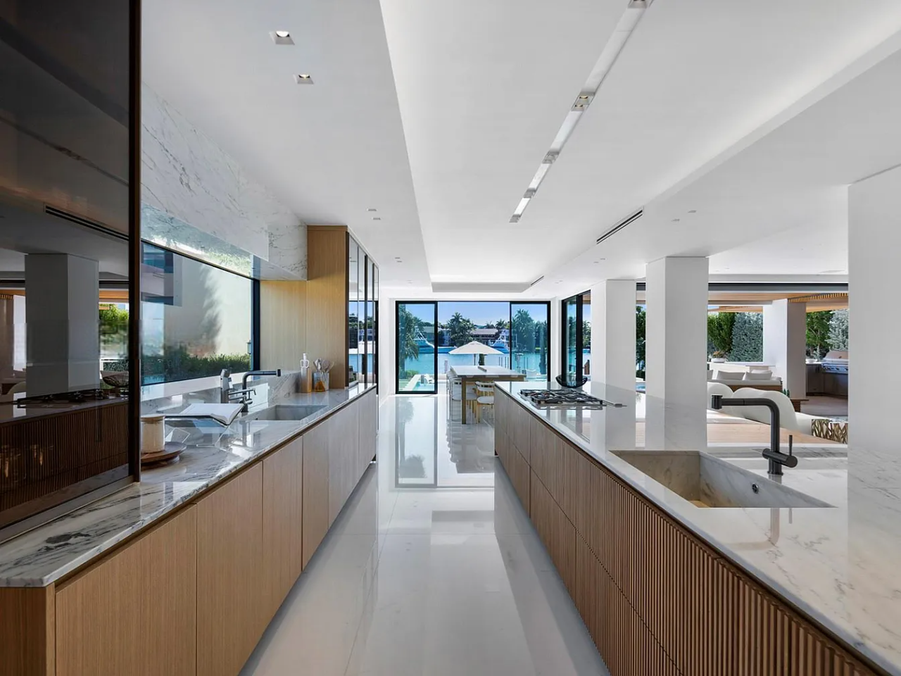 Welcome to this stunning modern home on gated Hibiscus Island, where exceptional design meets breathtaking downtown views. The impressive 23-foot steel door opens to a waterfront salon, beautifully illuminated by telescopic glass, complete with a cozy fireplace and sleek lighting. The culinary space is a chef’s dream, featuring marble and fluted oak finishes, a hosting island, a wine wall, and a bright dining area. A floating staircase leads to an office and four elegantly appointed suites with oak flooring. The primary suite is a true retreat, boasting two sitting lounges, a grand dressing room, a midnight bar, and a luxurious marble-clad bath that opens to an expansive terrace showcasing skyline vistas.