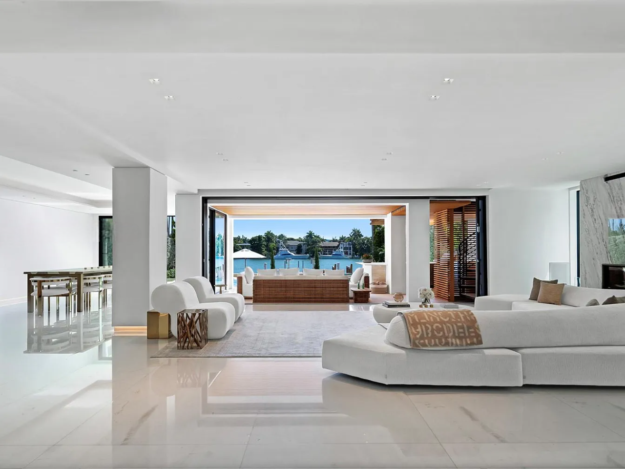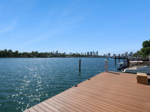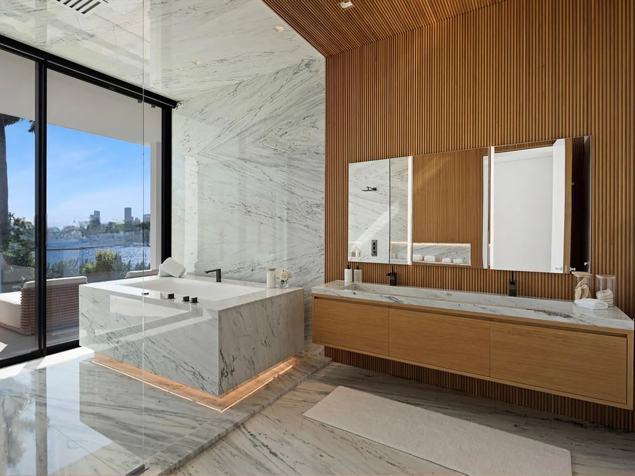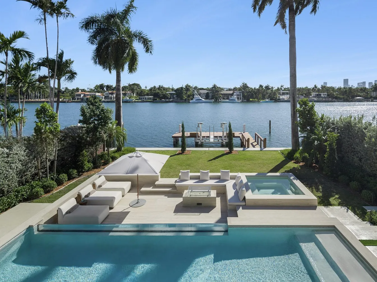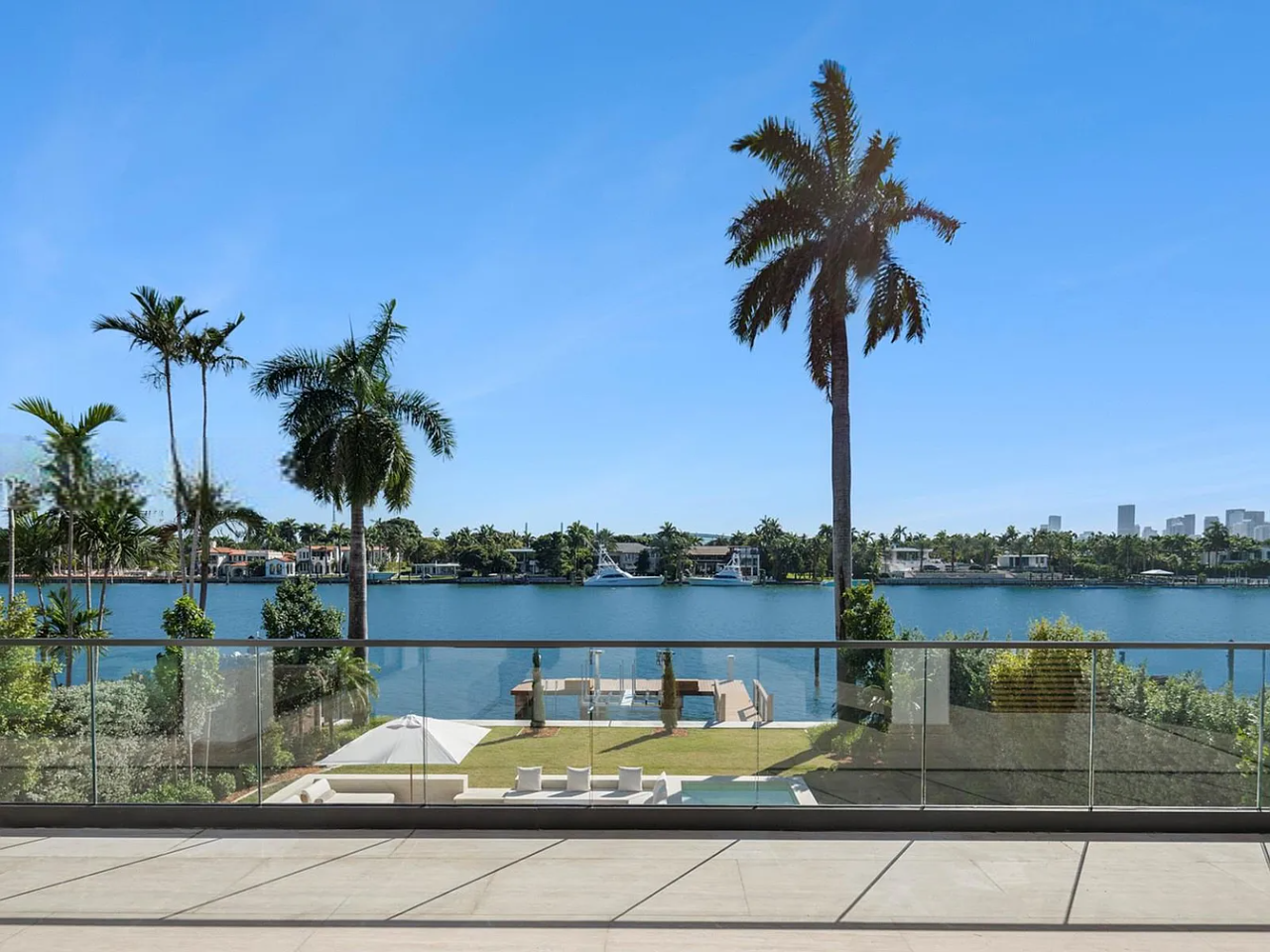 Welcome to this stunning modern home on gated Hibiscus Island, where exceptional design meets breathtaking downtown views. The impressive 23-foot steel door opens to a waterfront salon, beautifully illuminated by telescopic glass, complete with a cozy fireplace and sleek lighting. The culinary space is a chef’s dream, featuring marble and fluted oak finishes, a hosting island, a wine wall, and a bright dining area. A floating staircase leads to an office and four elegantly appointed suites with oak flooring. The primary suite is a true retreat, boasting two sitting lounges, a grand dressing room, a midnight bar, and a luxurious marble-clad bath that opens to an expansive terrace showcasing skyline vistas.