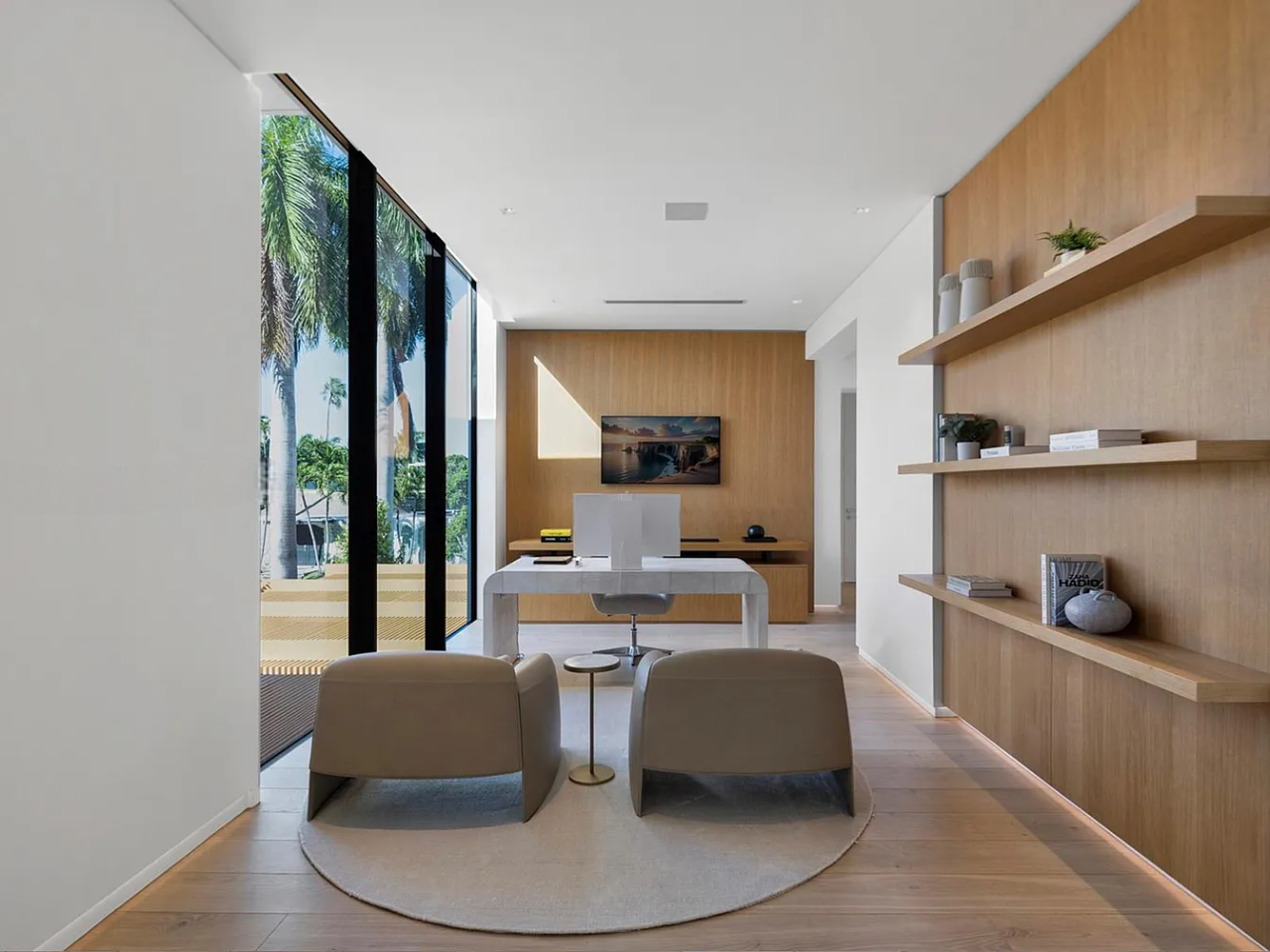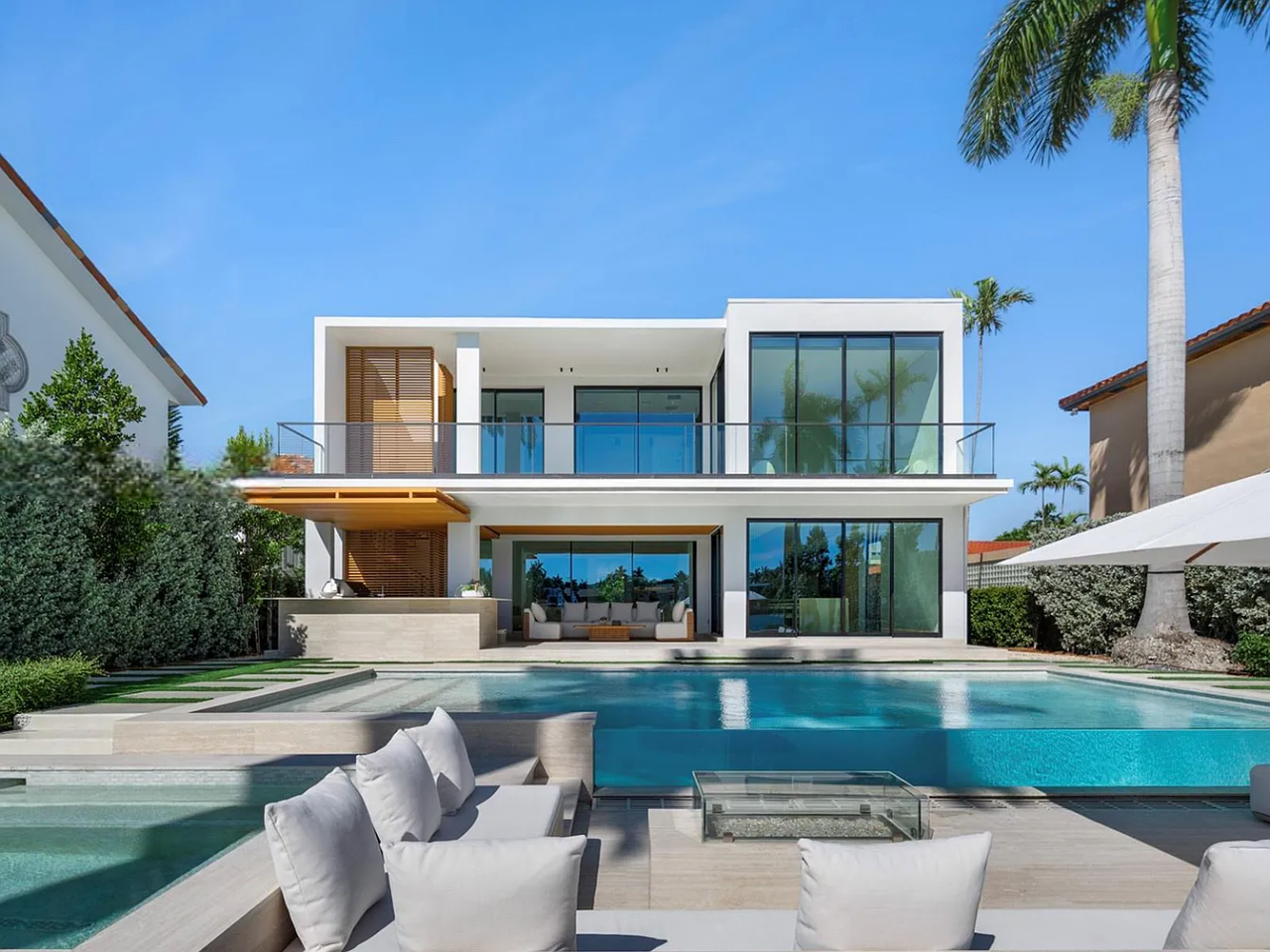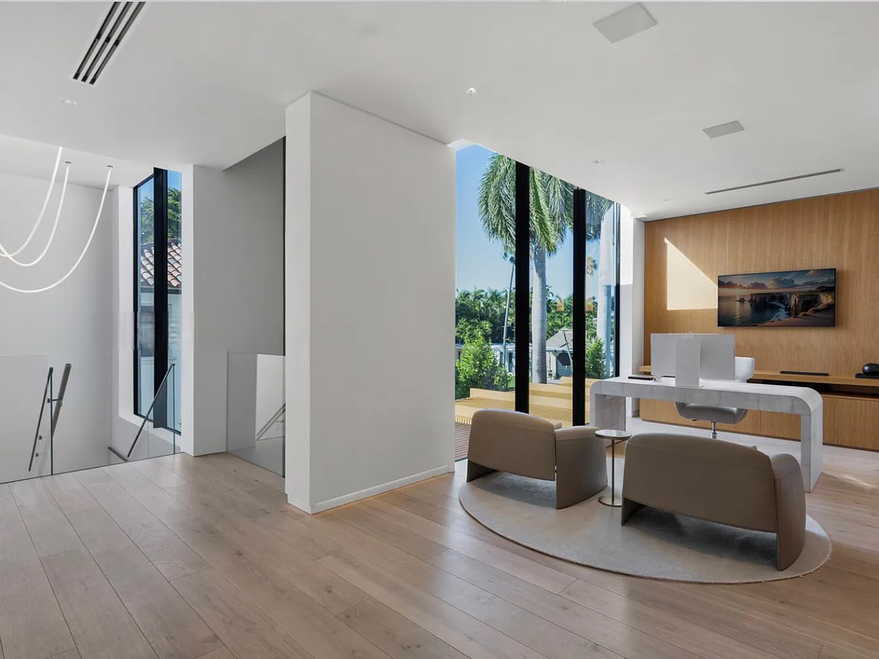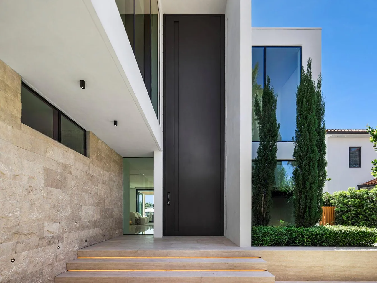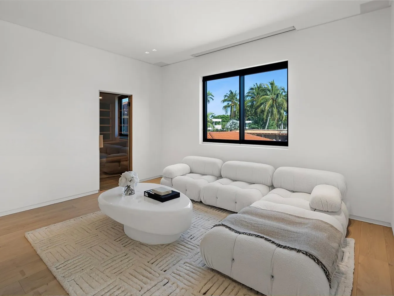 Welcome to this stunning modern home on gated Hibiscus Island, where exceptional design meets breathtaking downtown views. The impressive 23-foot steel door opens to a waterfront salon, beautifully illuminated by telescopic glass, complete with a cozy fireplace and sleek lighting. The culinary space is a chef’s dream, featuring marble and fluted oak finishes, a hosting island, a wine wall, and a bright dining area. A floating staircase leads to an office and four elegantly appointed suites with oak flooring. The primary suite is a true retreat, boasting two sitting lounges, a grand dressing room, a midnight bar, and a luxurious marble-clad bath that opens to an expansive terrace showcasing skyline vistas.