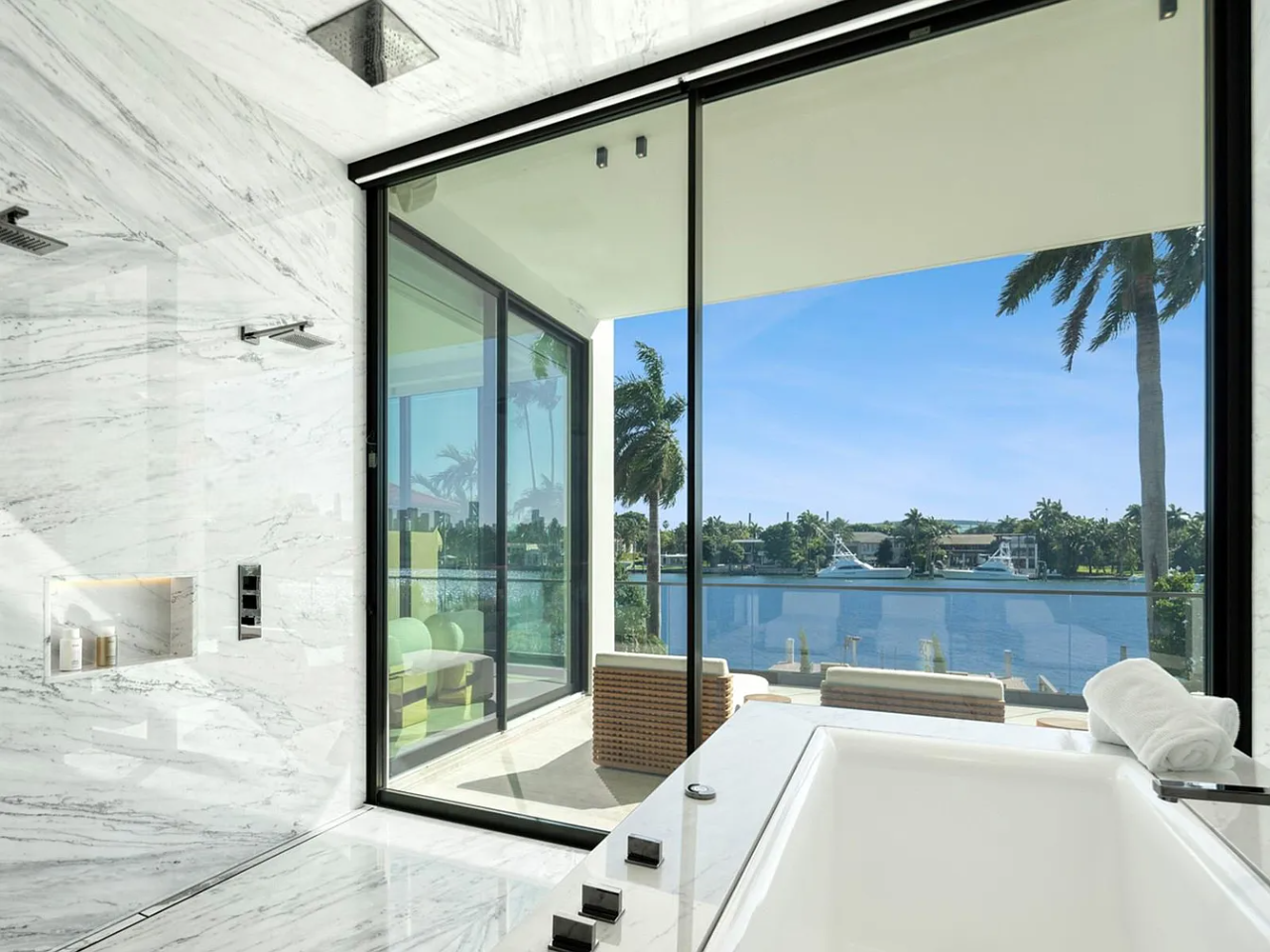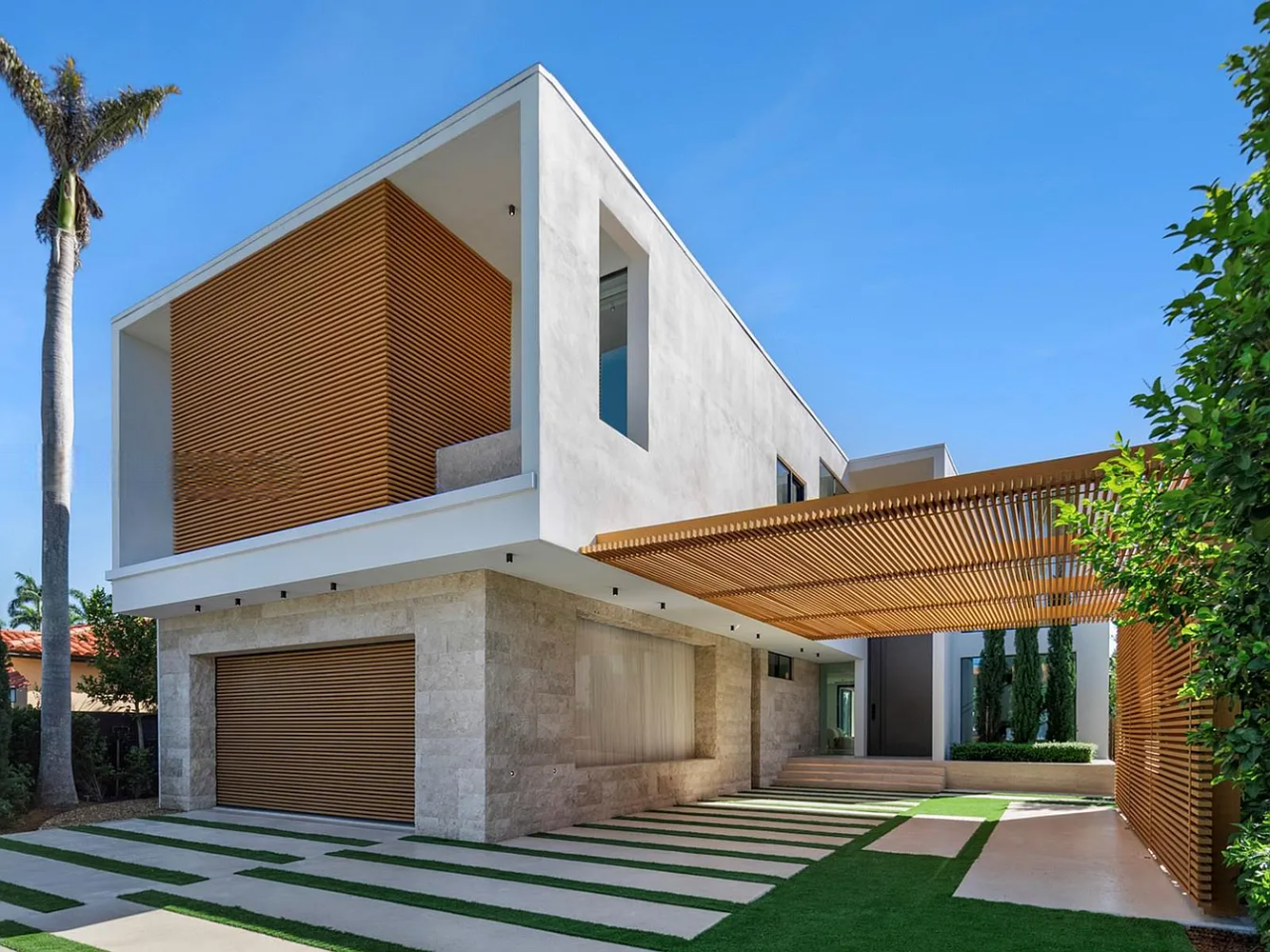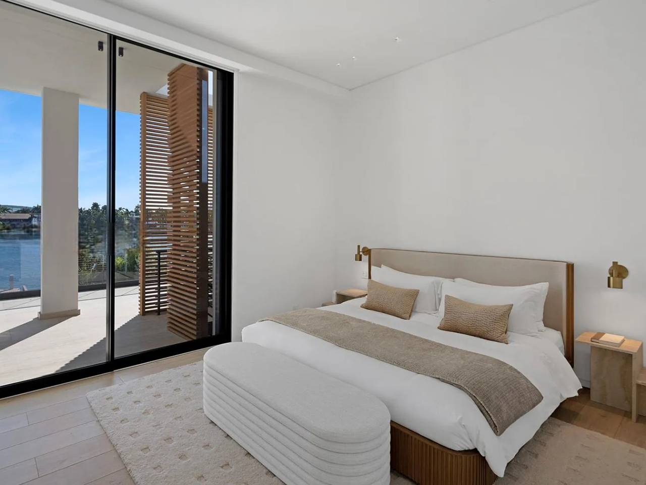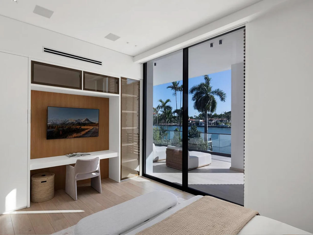 Welcome to this stunning modern home on gated Hibiscus Island, where exceptional design meets breathtaking downtown views. The impressive 23-foot steel door opens to a waterfront salon, beautifully illuminated by telescopic glass, complete with a cozy fireplace and sleek lighting. The culinary space is a chef’s dream, featuring marble and fluted oak finishes, a hosting island, a wine wall, and a bright dining area. A floating staircase leads to an office and four elegantly appointed suites with oak flooring. The primary suite is a true retreat, boasting two sitting lounges, a grand dressing room, a midnight bar, and a luxurious marble-clad bath that opens to an expansive terrace showcasing skyline vistas.