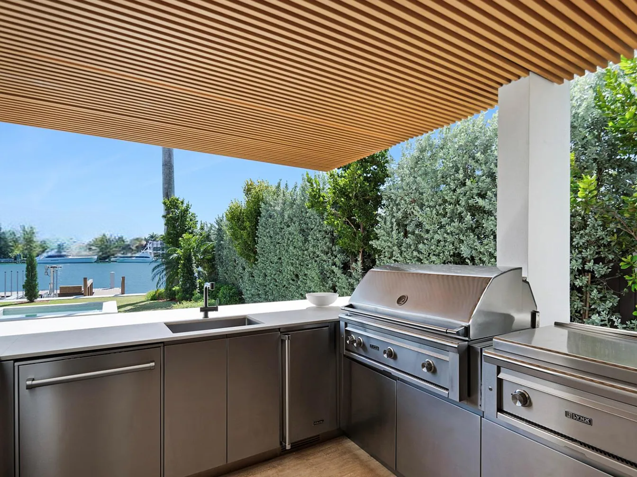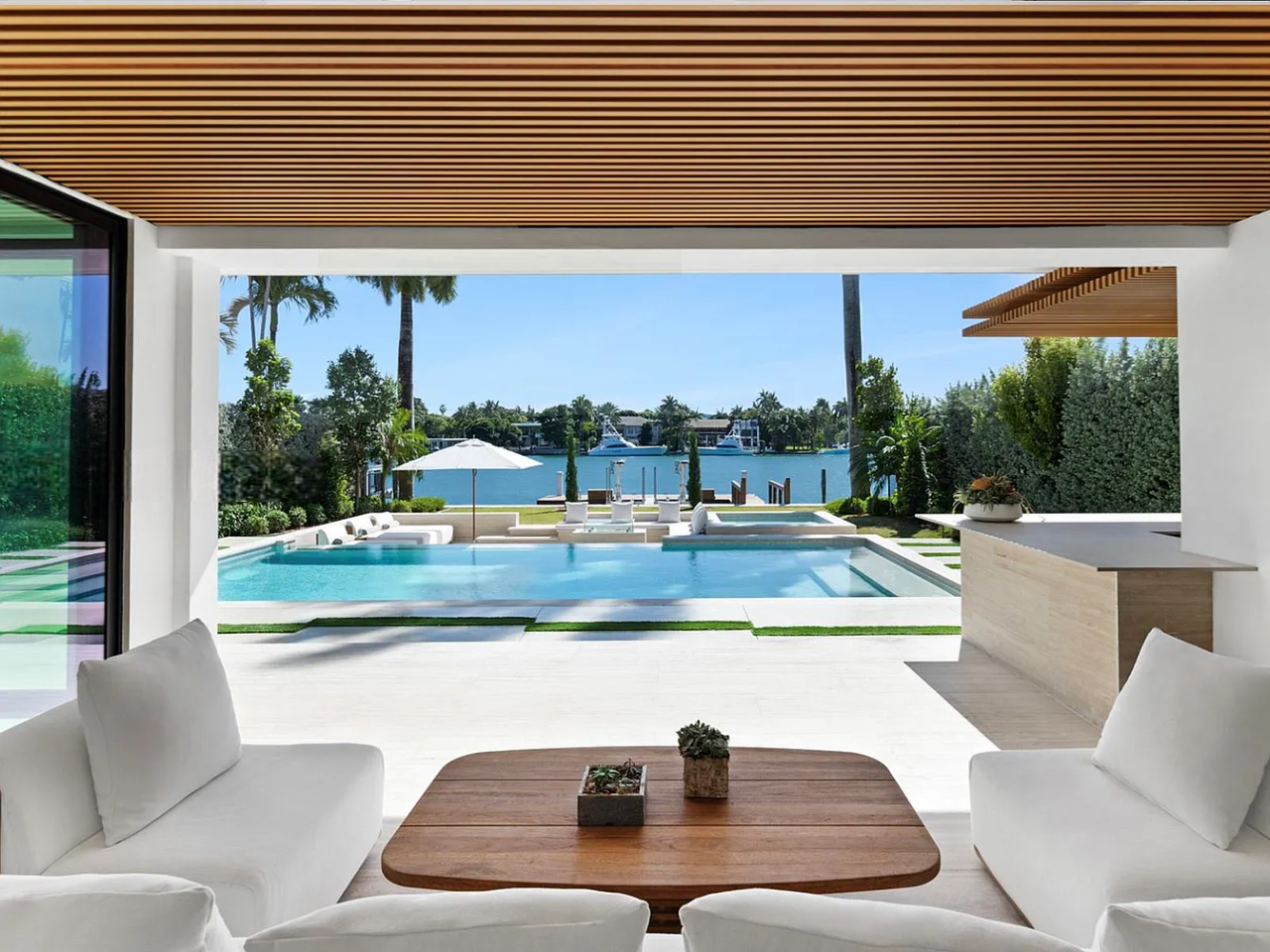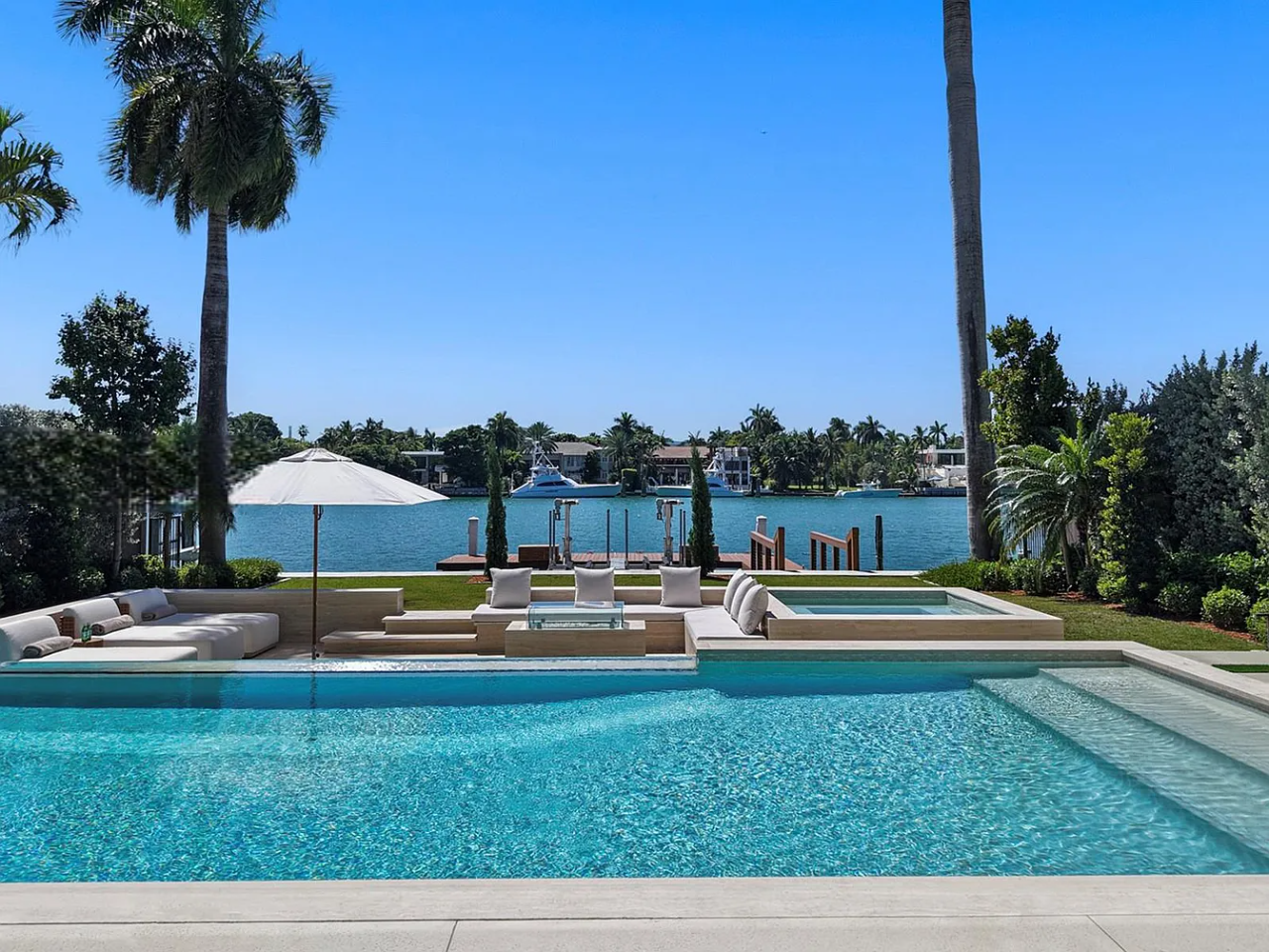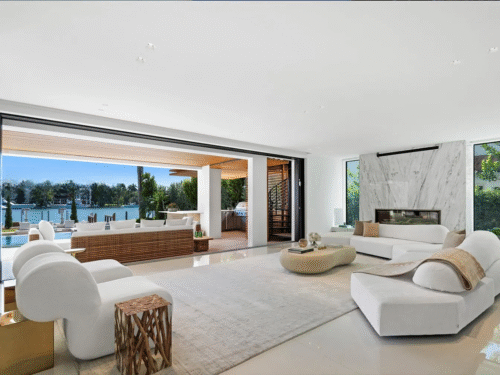The outdoor space is a Southern-facing oasis, defined by a stunning pool, spa, and covered lounge area, along with a summer kitchen, sunken fire pit, sun deck, and a dock with 60 feet of waterfront access. This home also prioritizes wellness with features such as reverse osmosis, a UV sauna, and a cold plunge, ensuring a perfect blend of luxury and tranquility.