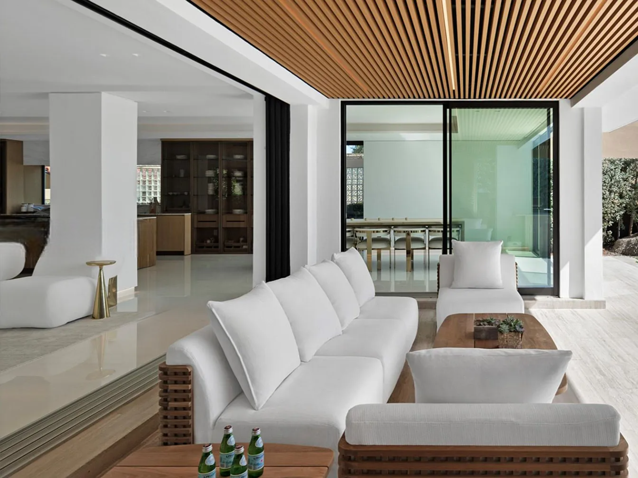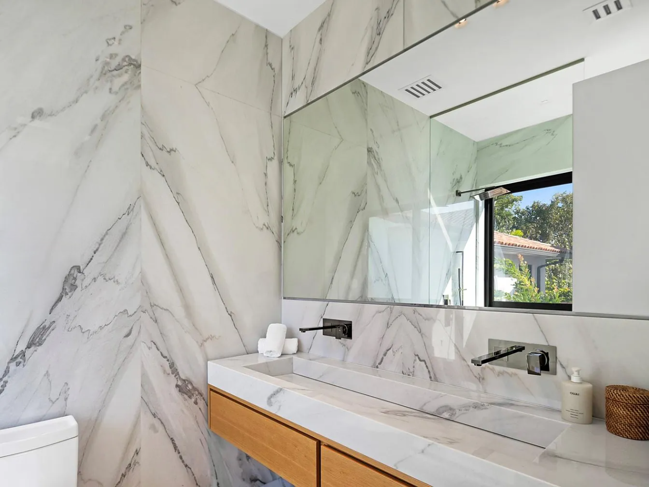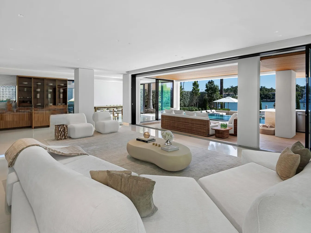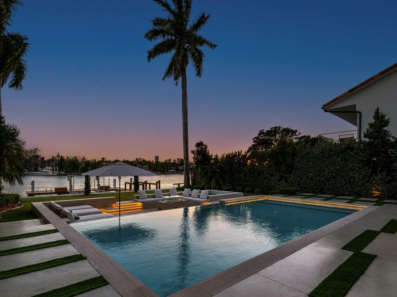 The outdoor space is a Southern-facing oasis, defined by a stunning pool, spa, and covered lounge area, along with a summer kitchen, sunken fire pit, sun deck, and a dock with 60 feet of waterfront access. This home also prioritizes wellness with features such as reverse osmosis, a UV sauna, and a cold plunge, ensuring a perfect blend of luxury and tranquility.