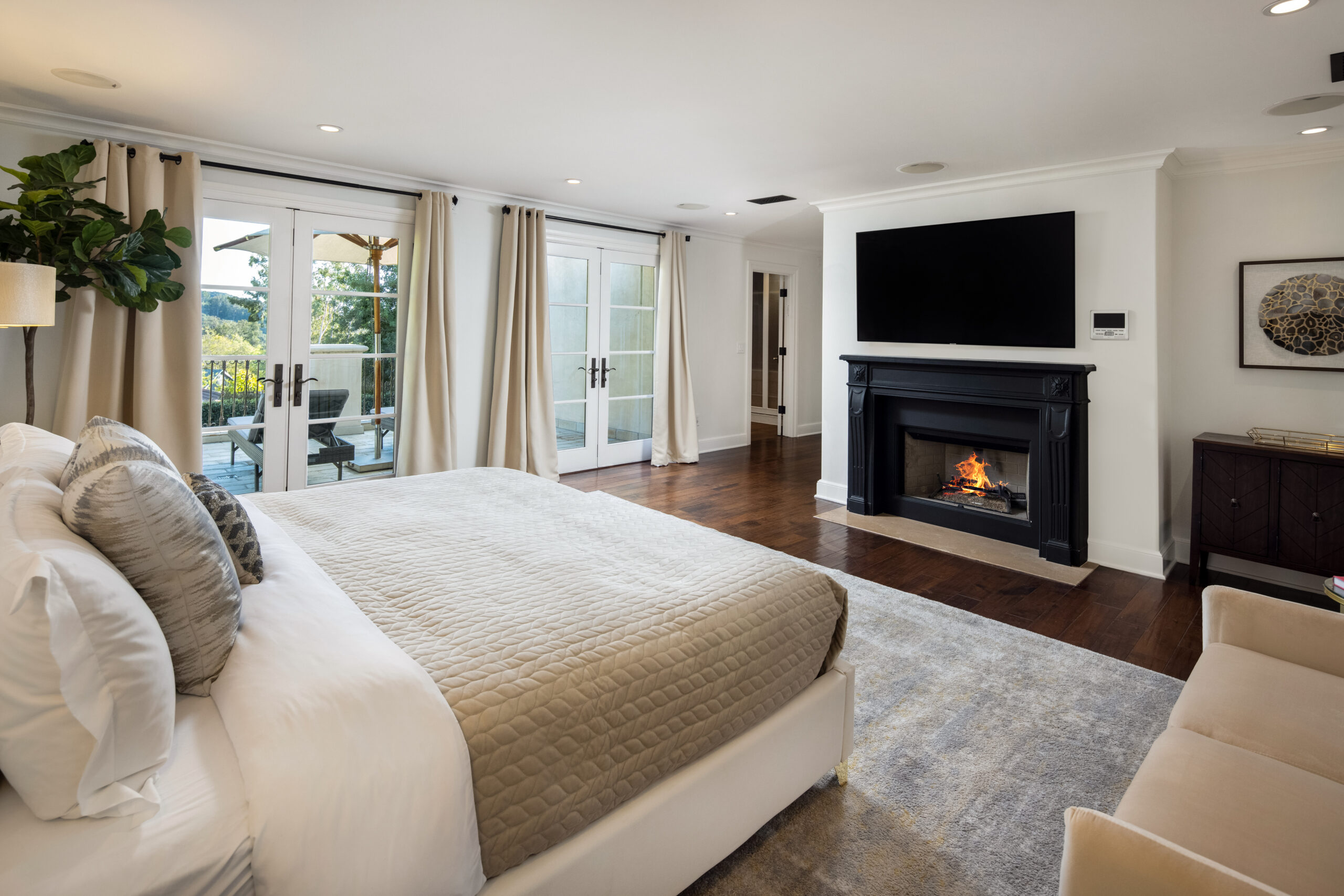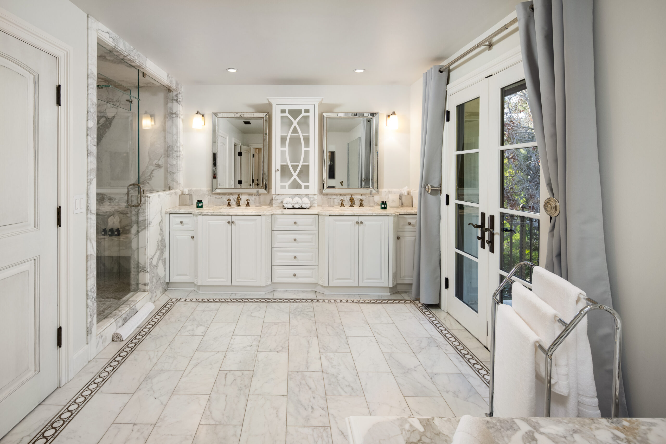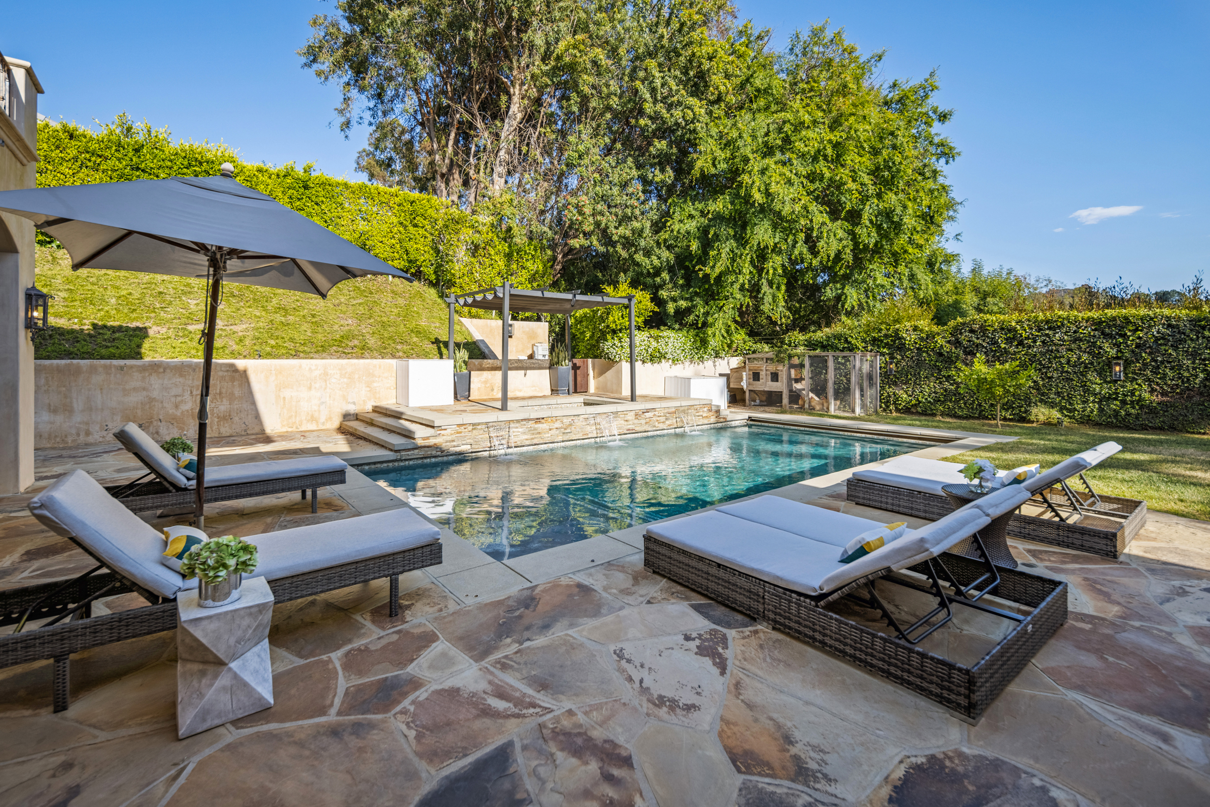 The estate’s outdoor oasis is meticulously designed for both grand-scale entertaining and serene relaxation, centered around a one-of-a-kind swimming pool with a striking custom-patterned floor. Sun-drenched lounging areas are thoughtfully curated with chic striped umbrellas, contemporary white furnishings, and a modern fire pit, all framed by a protective stone wall and elegant glass railings that preserve the unobstructed vistas. Whether enjoying the circular spa or dining al fresco against the backdrop of the illuminated hillside, every detail of this villa embodies an unparalleled standard of private, resort-style living.