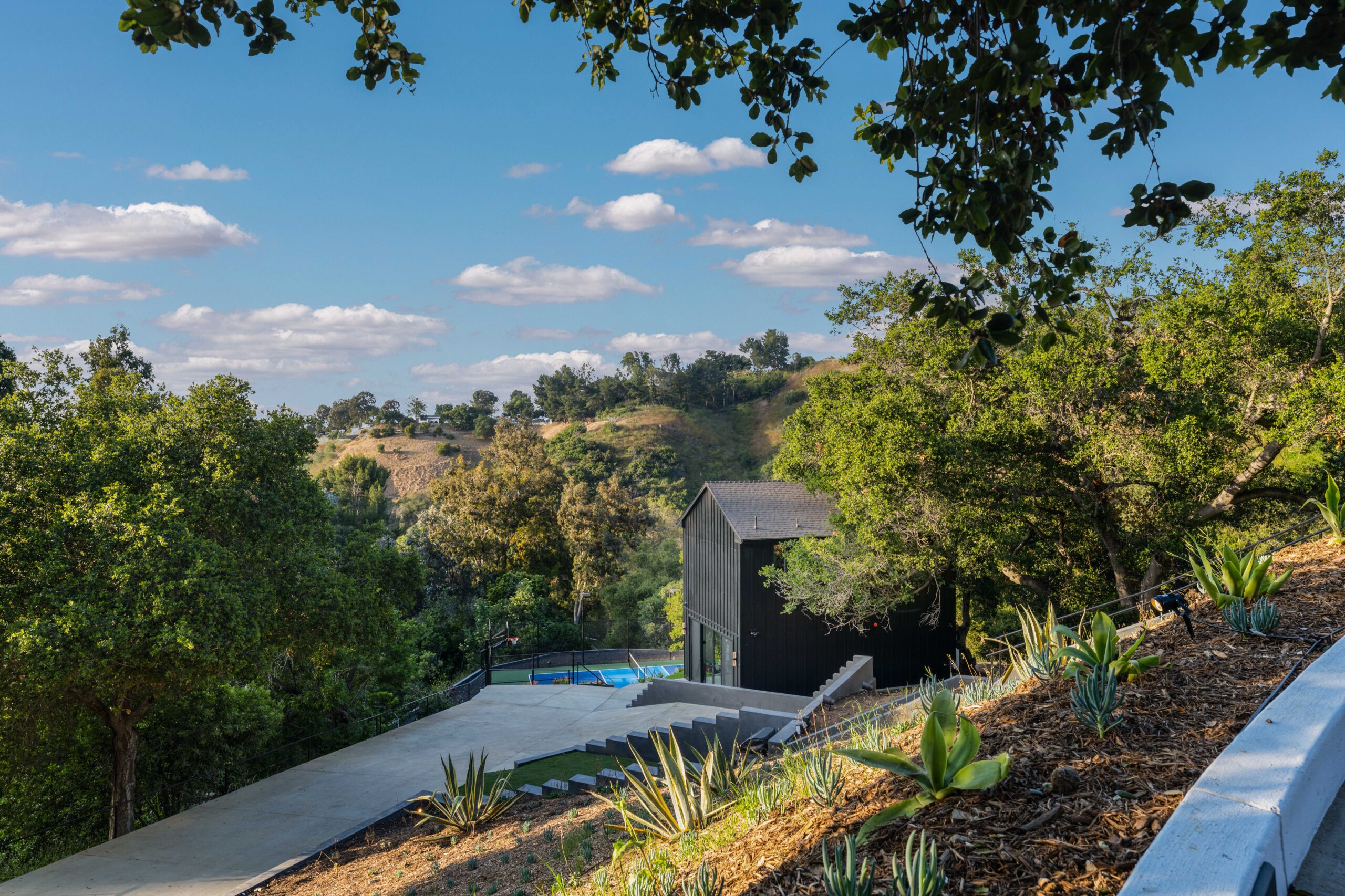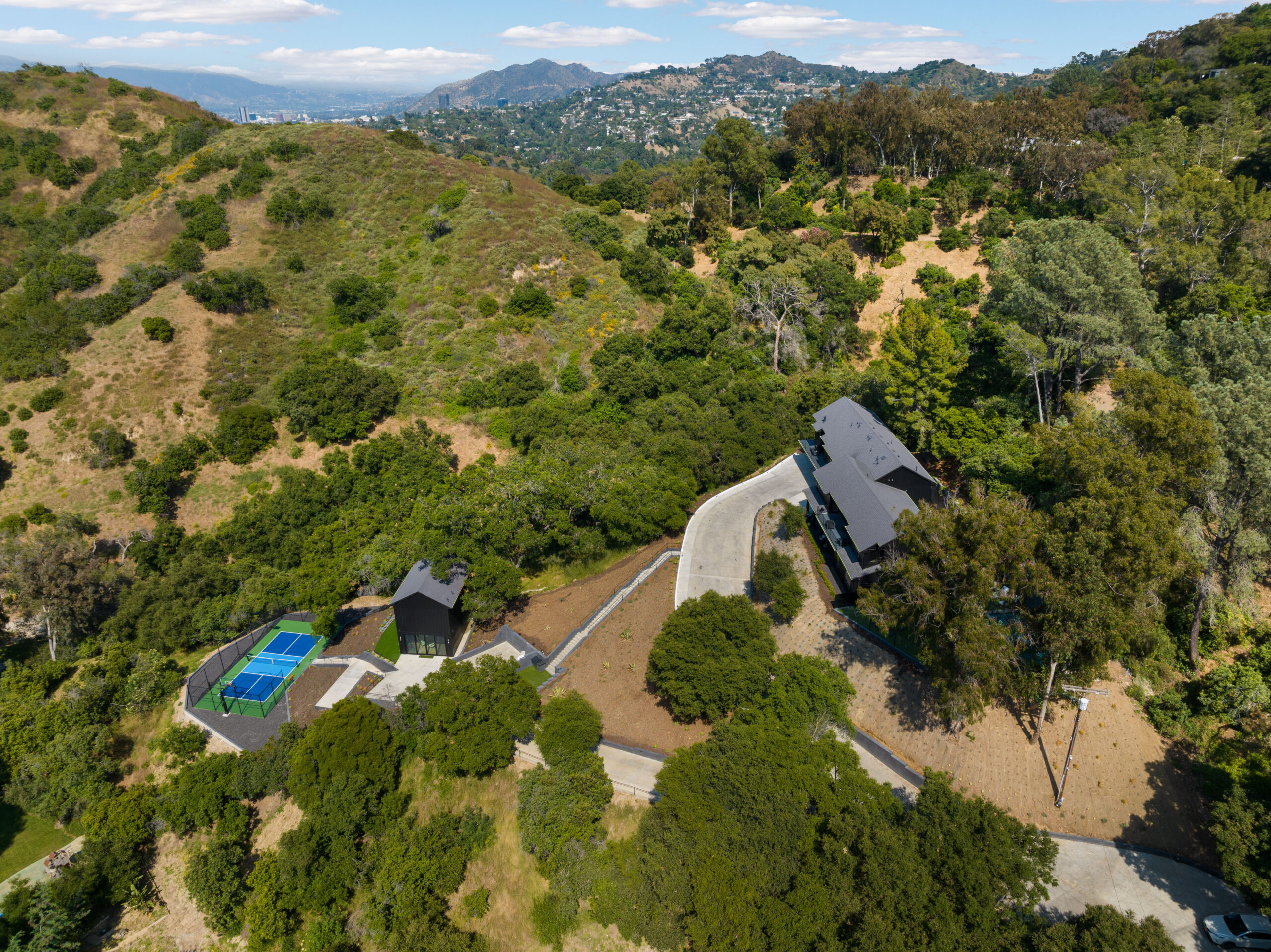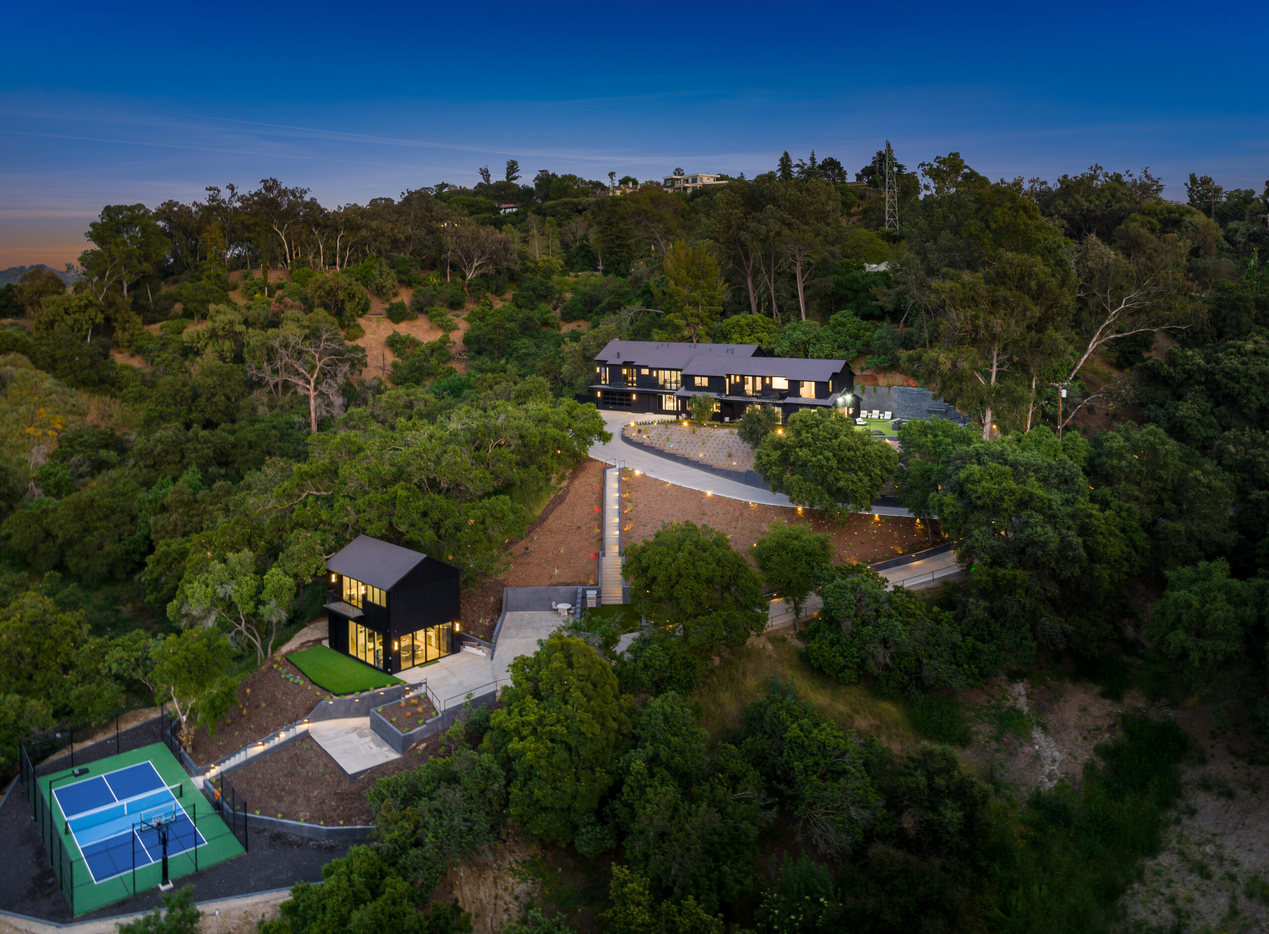 Tucked away on an extraordinary, private compound, this unique parcel of land hosts a magnificent main residence and guest house enveloped by ancient Oaks and verdant greenery. The journey begins with a scenic three-quarter-mile private driveway that winds through more than 1,000 protected mature trees, leading to a sanctuary where indigenous wildlife roams and private hiking trails offer breathtaking views of Studio City and the surrounding mountains. This is more than just a property; it is a sprawling, impeccably landscaped estate that harmonizes rustic tranquility with modern luxury.