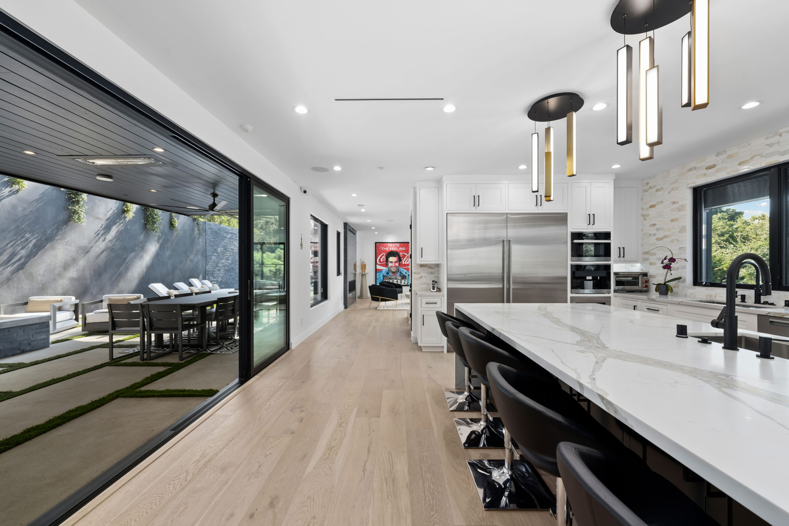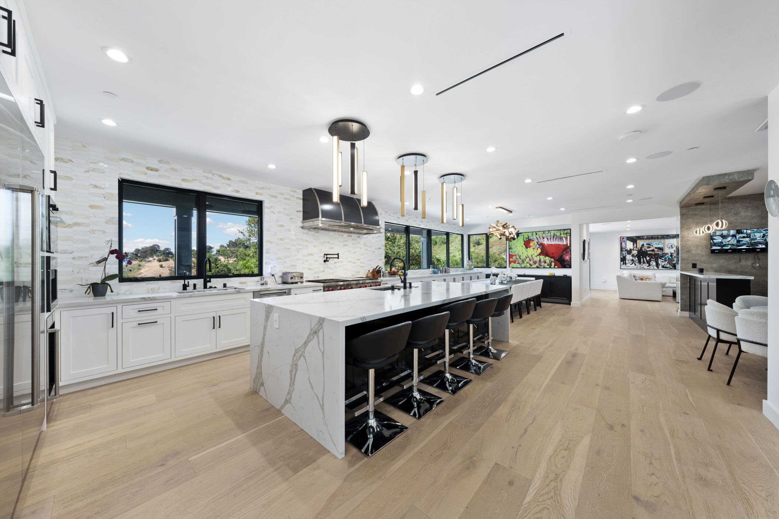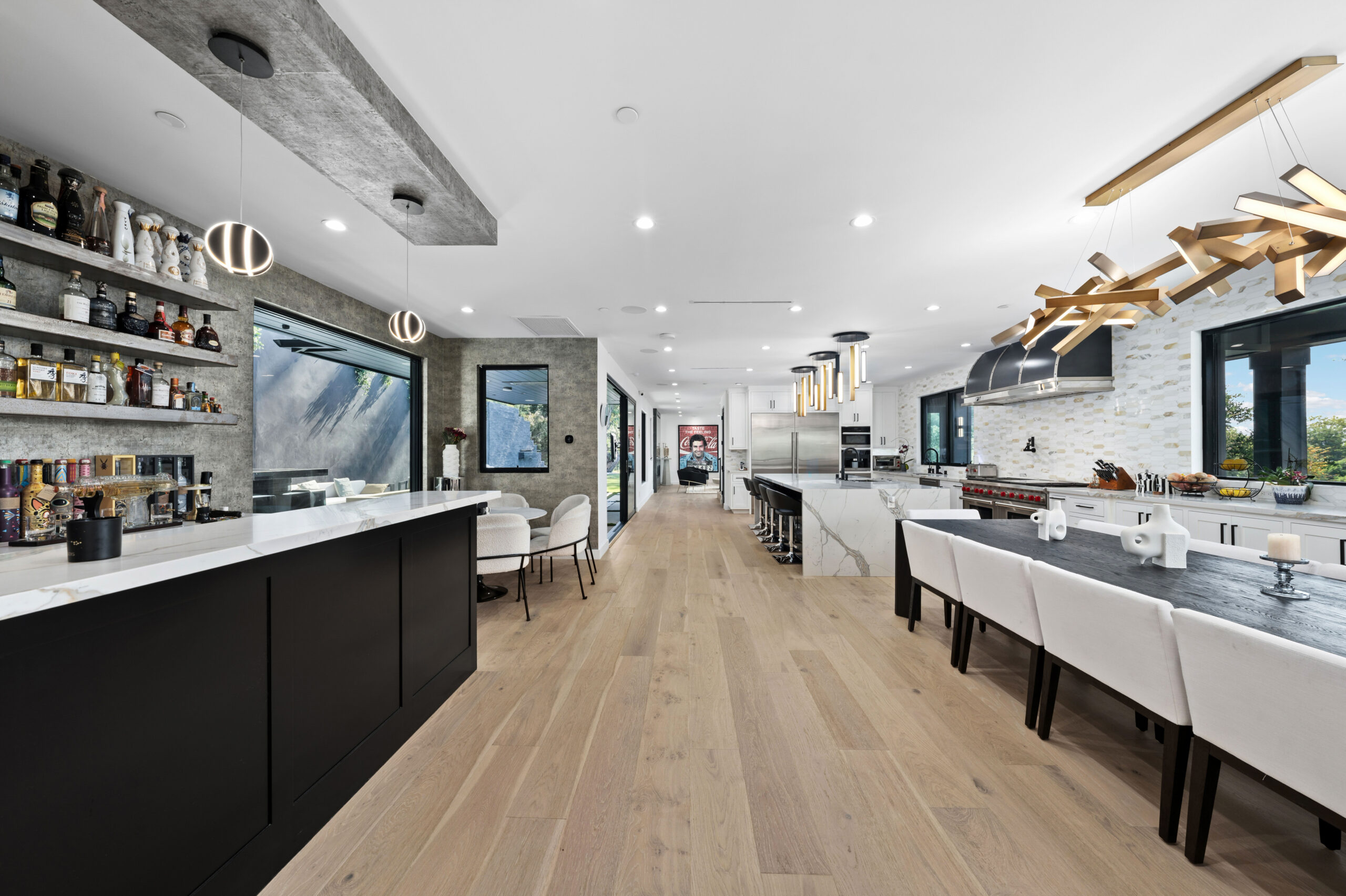 The residence itself is a masterfully upgraded farmhouse, boasting eight spacious bedrooms and ten bathrooms finished with White Oak flooring, Italian porcelain, and elegant quartz. Designed for the modern epicurean, the smart-home-equipped interior features a gourmet kitchen with Wolf and Subzero appliances, a Miele coffee system, and a temperature-controlled wine cellar. Seamless indoor-outdoor flow makes entertaining effortless, leading to an expansive outdoor kitchen and lounge areas. From the vaulted ceilings and en-suite baths to the comprehensive Lutron automation and security, every detail has been meticulously curated to provide a seamless, high-tech living experience in a timeless natural setting.