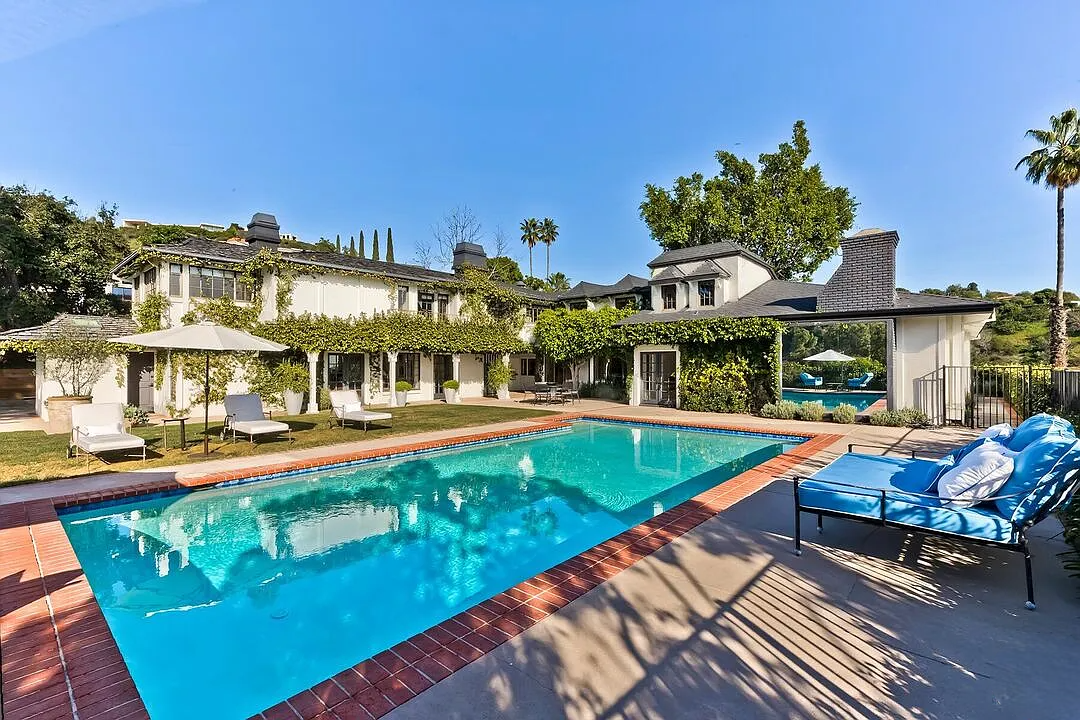 This elegant, two-story traditional residence is a rare gem in the coveted Trousdale enclave, offering a sophisticated “garden estate” atmosphere seldom found in the neighborhood. Spanning approximately 5,500 square feet, the fully furnished and turnkey interior begins with a dramatic double-height entry leading to light-filled formal living and dining rooms adorned with timeless architectural detailing. Designed for a refined lifestyle, the home features a richly paneled library, dual media lounges, and a dedicated wellness room. The expansive primary suite serves as a private sanctuary, complete with vaulted ceilings, dual bathrooms, and a terrace that captures sweeping canyon and city views.